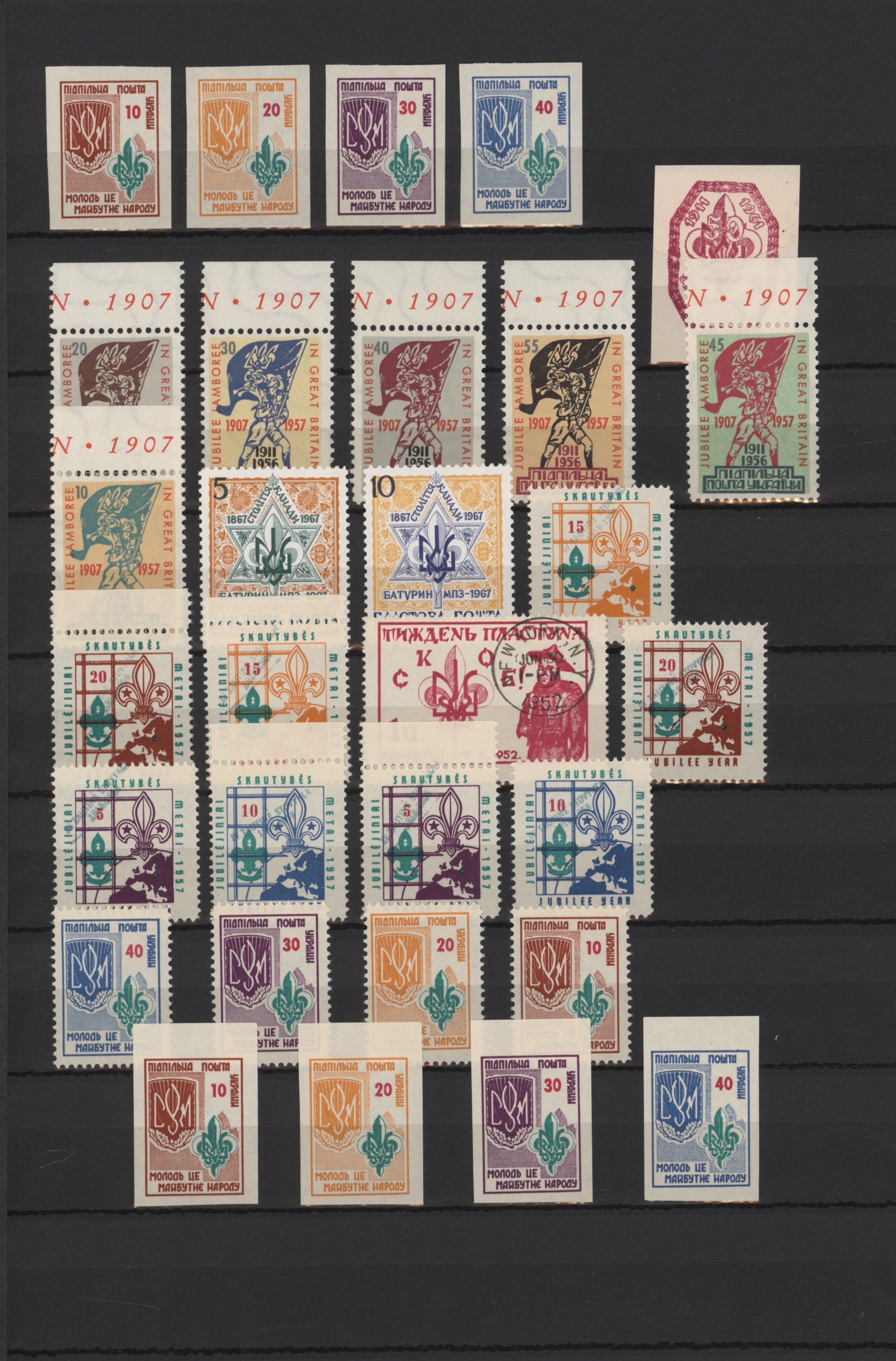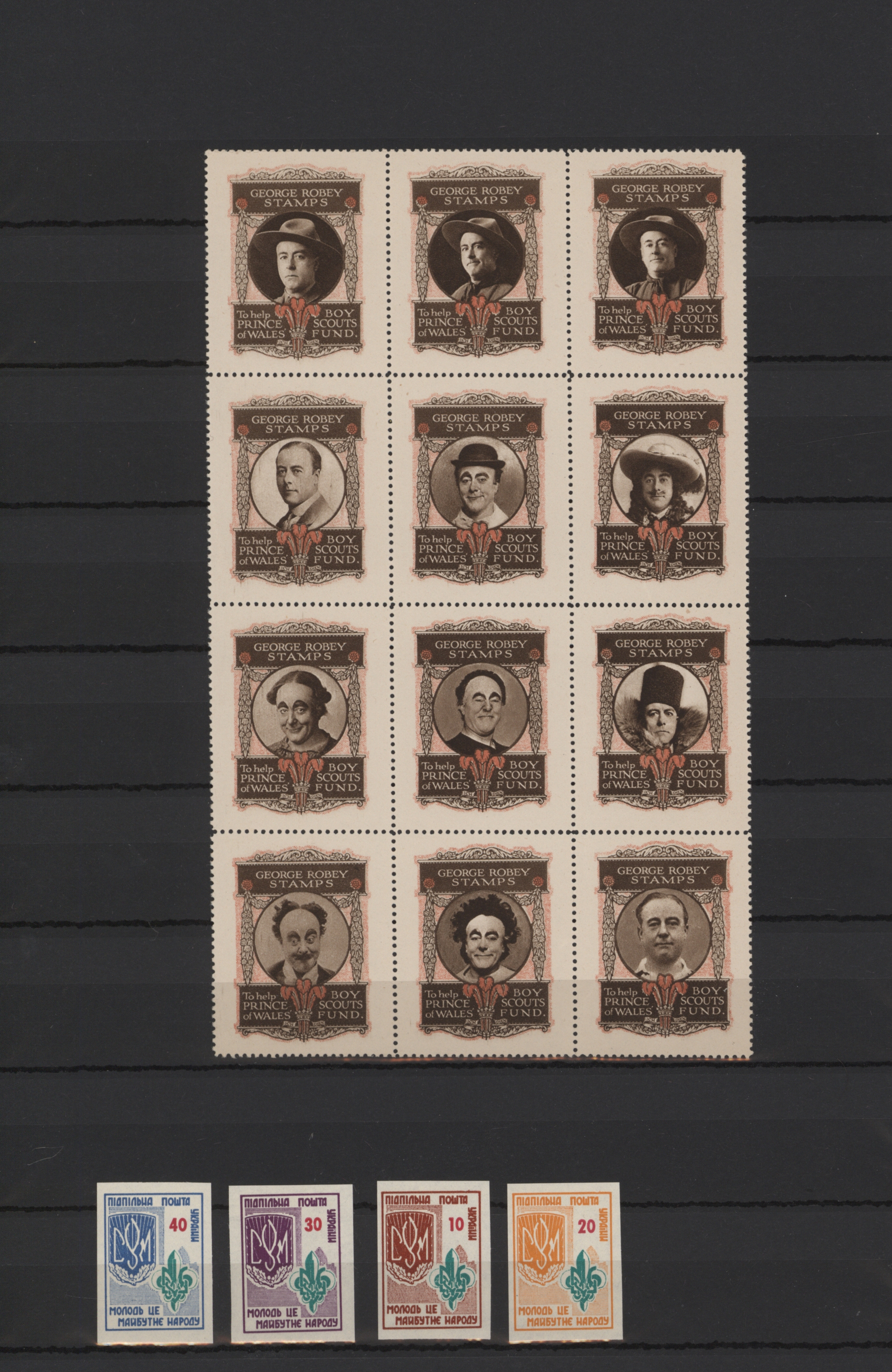 1913/1960 (ca.), VIGNETTES, collection of apprx. 143 Boy Scouts vignettes, comprising e.g. nice section Denmark, se-tenant sheet of 12 "George Robey Stamps", etc.