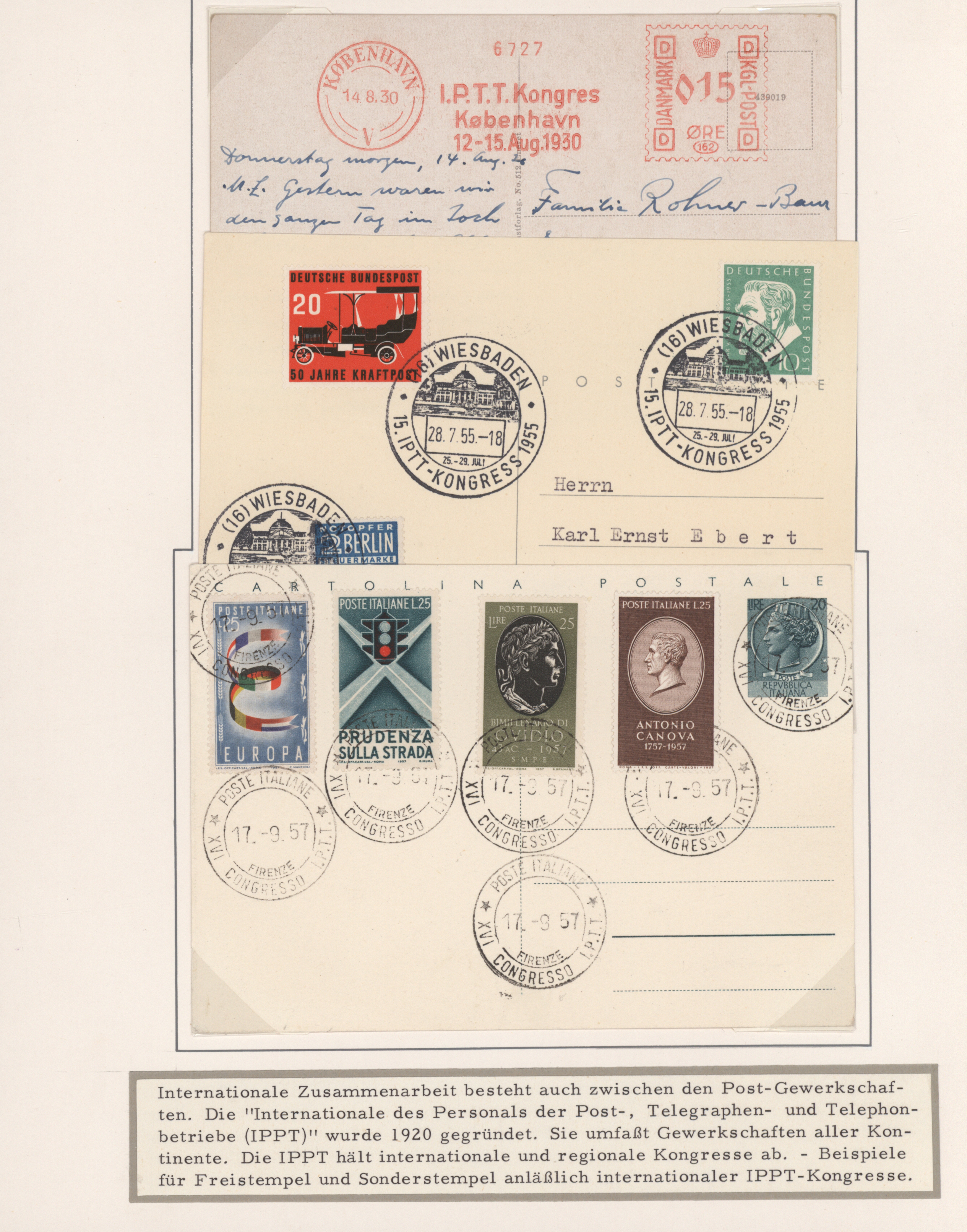 1930/1967, "IPTT" Congresses (International Association of Post Officials Trade Unions), group of six entires incl. 1930 meter mark and 1955, 1957, 1962, 1965, 1967