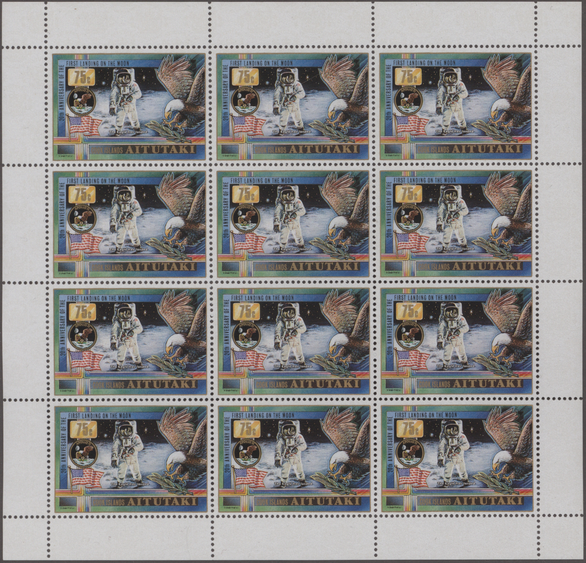 1969, Sharjah, NASA Medal for Distinguished Service, 3r. Gold stamp perforated, holding of 522 stamps MNH within mini sheets. Michel # 941A (522), 3.393,-