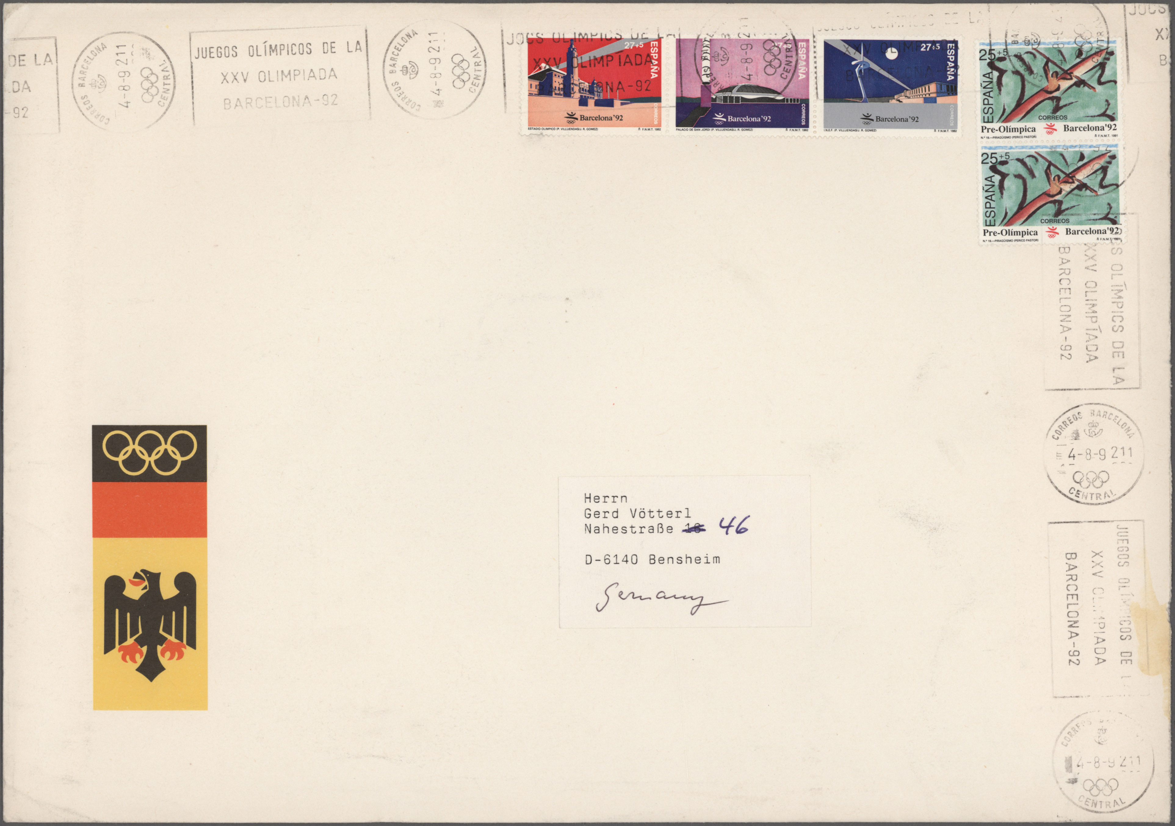 "Barcelona"-Karte mit zahlreichen Originalunterschriften der teilnehmenden Sportler, alle Stücke mit zugehörigem Versandumschlag.