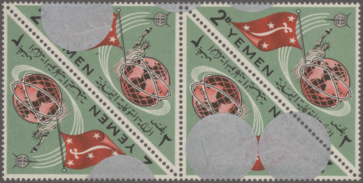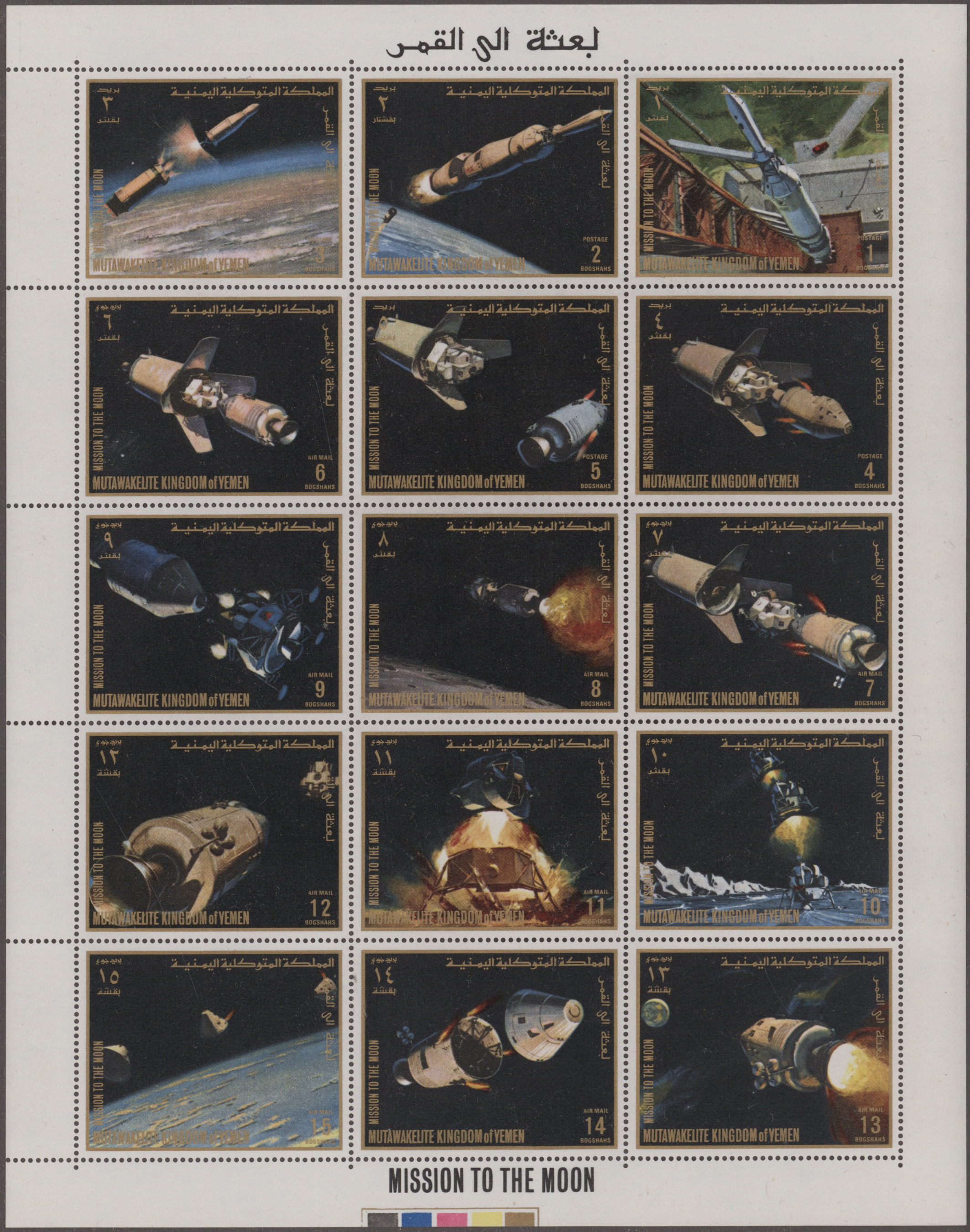 1969, Yemen (Kingdom) APOLLO "Mission to the Moon", perf. issue, 1000 complete sets of 15 stamps in se-tenant sheets, 500 with GOLDEN and 500 with SILVER