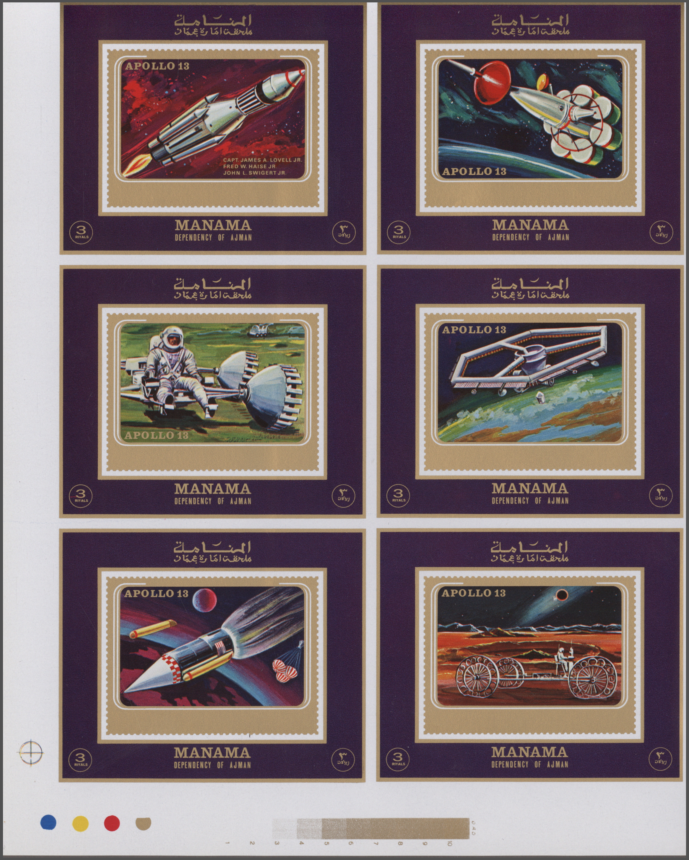 1972, Sharjah, assortment of 42 imperforate progressive proof gutter sheets of nine proofs each, comprising Michel no. 982/984 and 994/997 (6 phases each).
