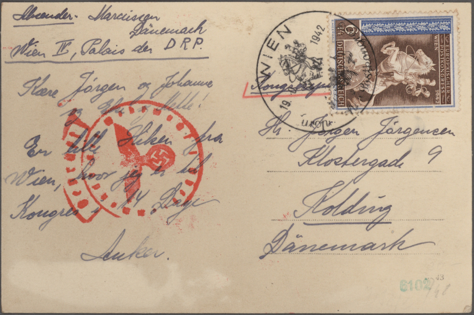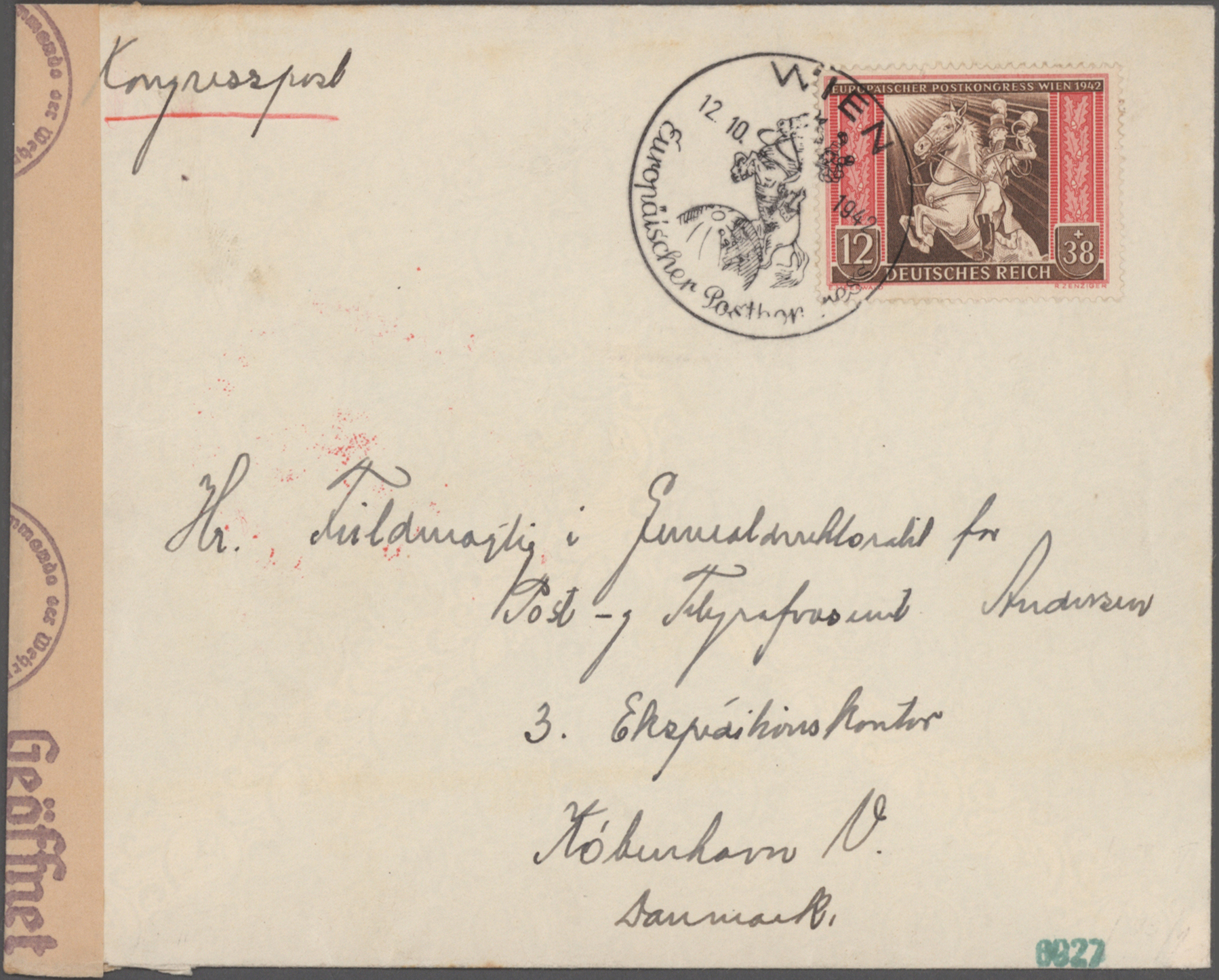 1942, Europäischer Postkongreß Wien, Partie von fünf Belegen mit SST 12.10., 14.10., 17.10., 19.10., 22.10., teils nach Dänemark und Holland