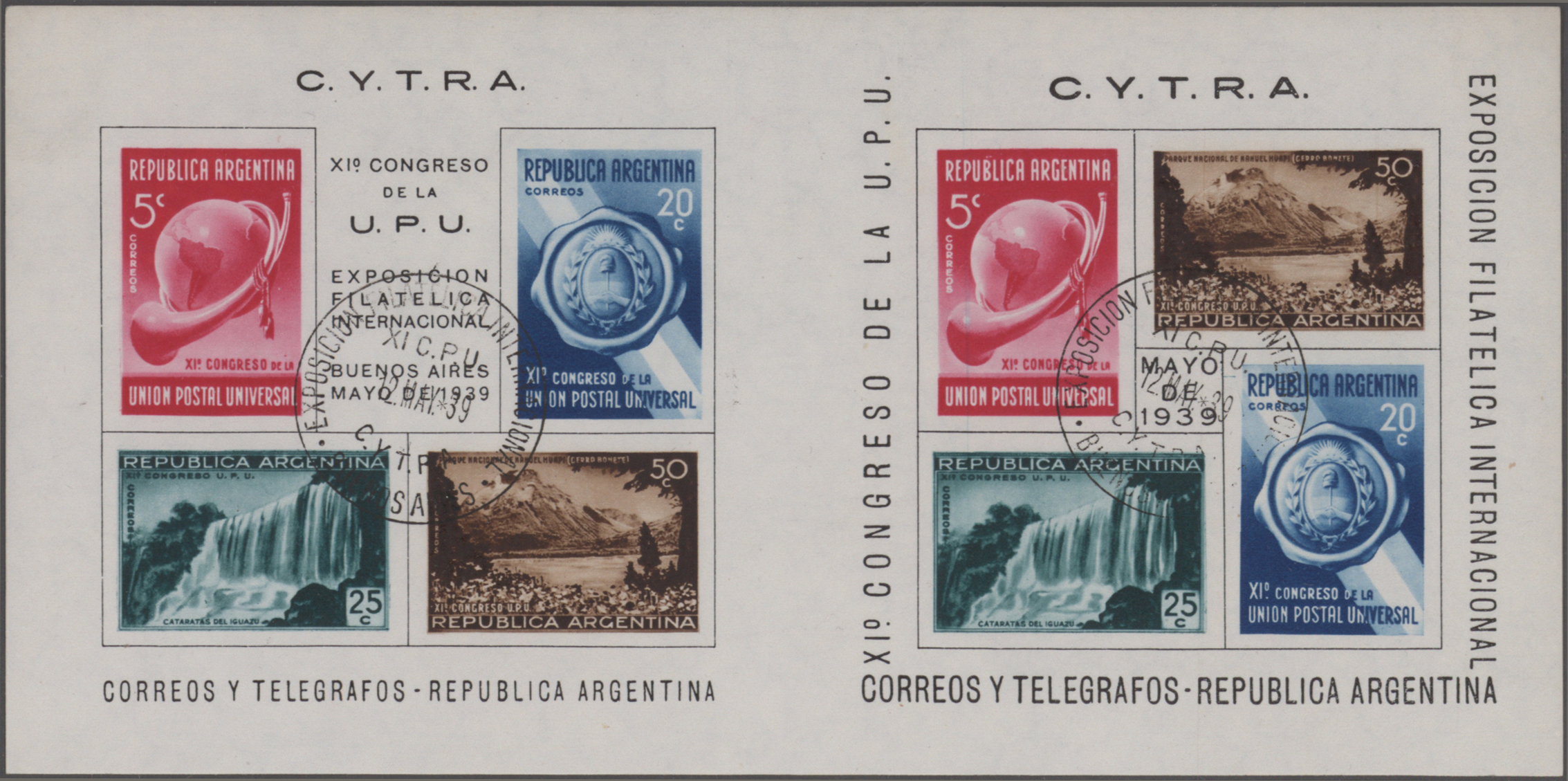 1939 Argentina - UPU Congress in Buenos Aires: Three complete sets (two mint hinged/never hinged, one first FDC), a 1p. with variety "large