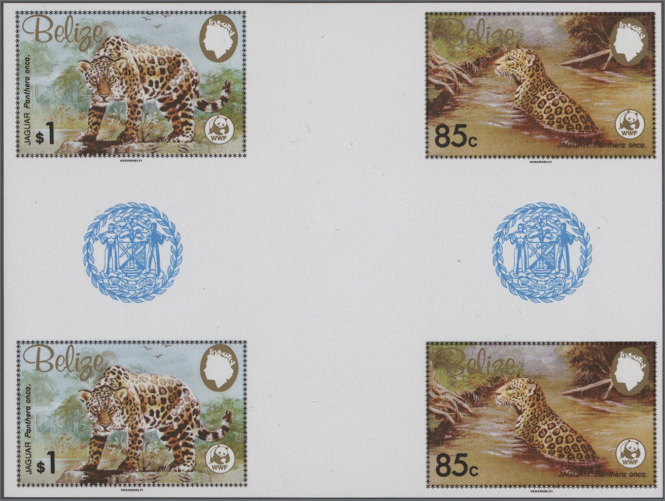 1983, Belize, WWF "Jaguar", imperforate horizontal se-tenant gutter pairs with 10c.+5c. (30) and $1.+85c. (28). All stamps on slightly thicker