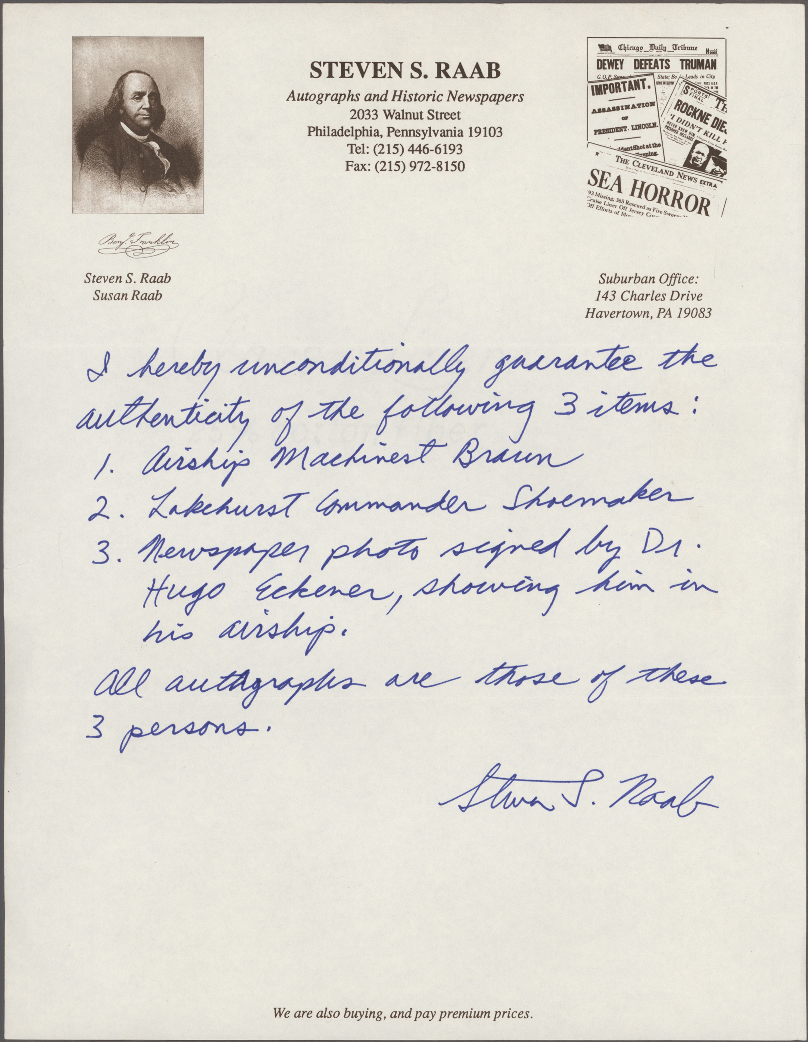 1932/1936, HUGO ECKENER, COMMANDER C. E. ROSENDAHL, CAPTAIN H. E. SHOEMAKER, three signatures on contemporary newspaper cutouts. (1068653) (Image) (image1)