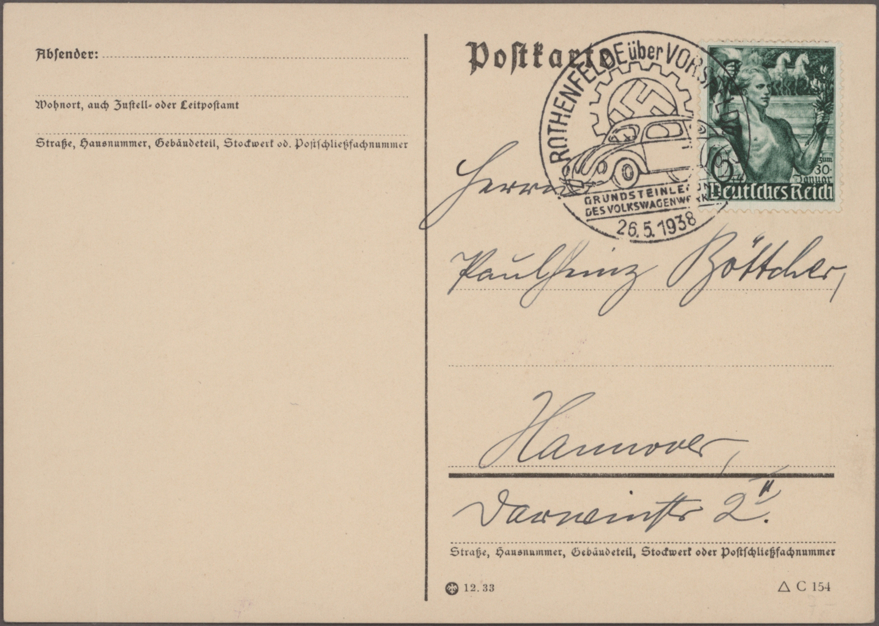 1938/2011, Partie von ca. 218 (meist deutschen) Briefen und Karten, dabei SST "ROTHENFELDE über VORSFELDE GRUNDSTEINLEGUNG DES VOLKSWAGENWERKES 26.5.1938",