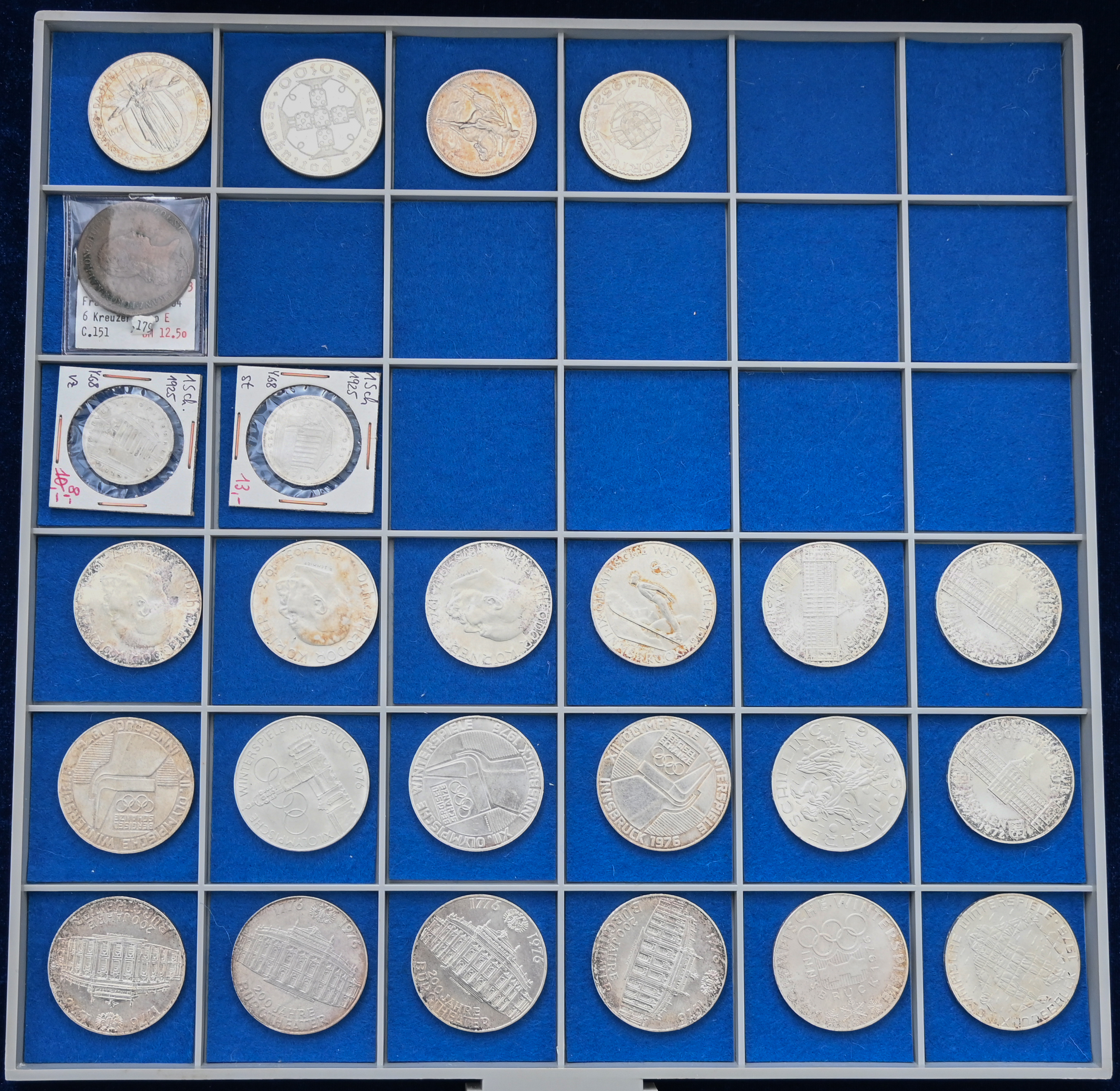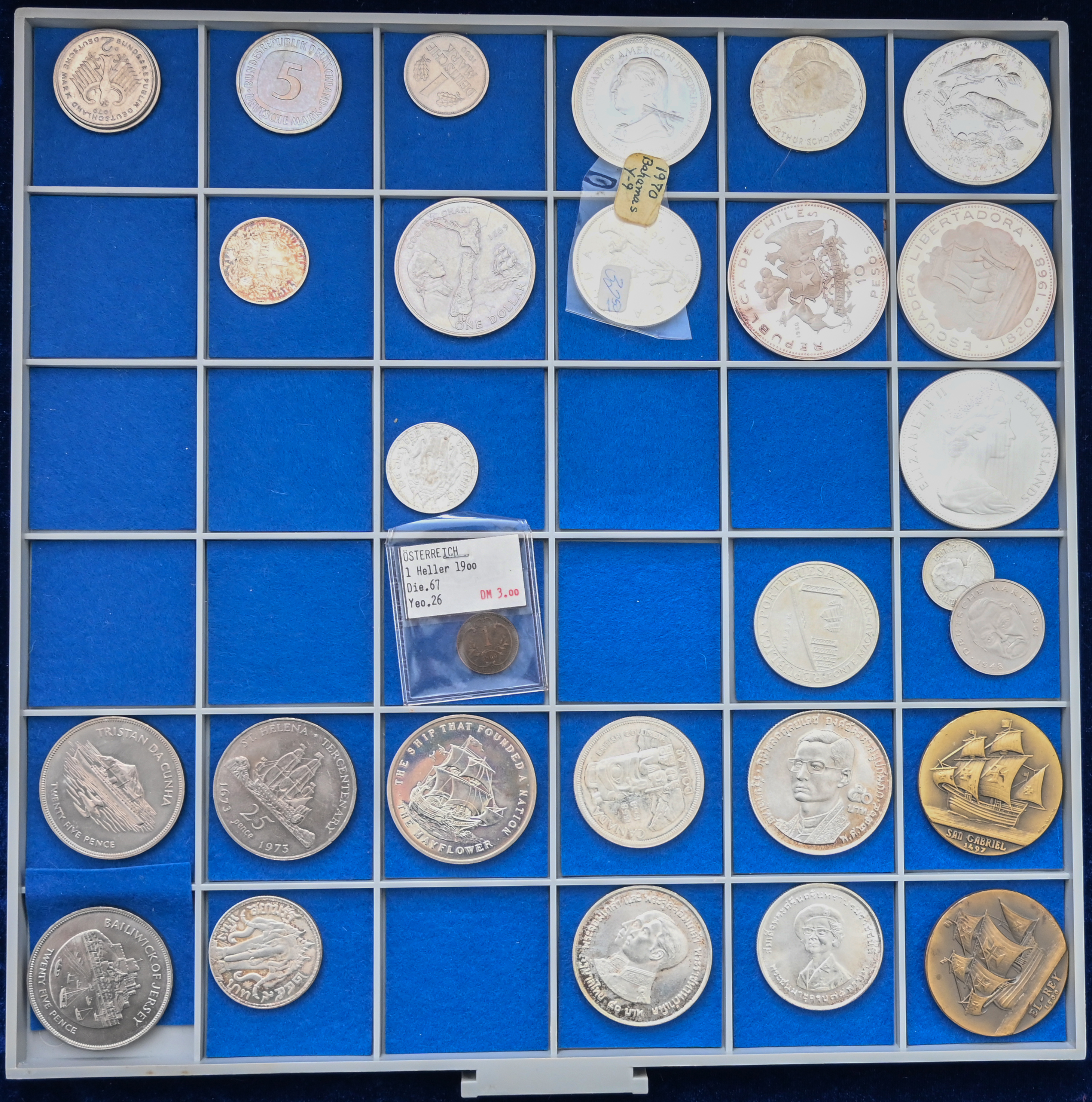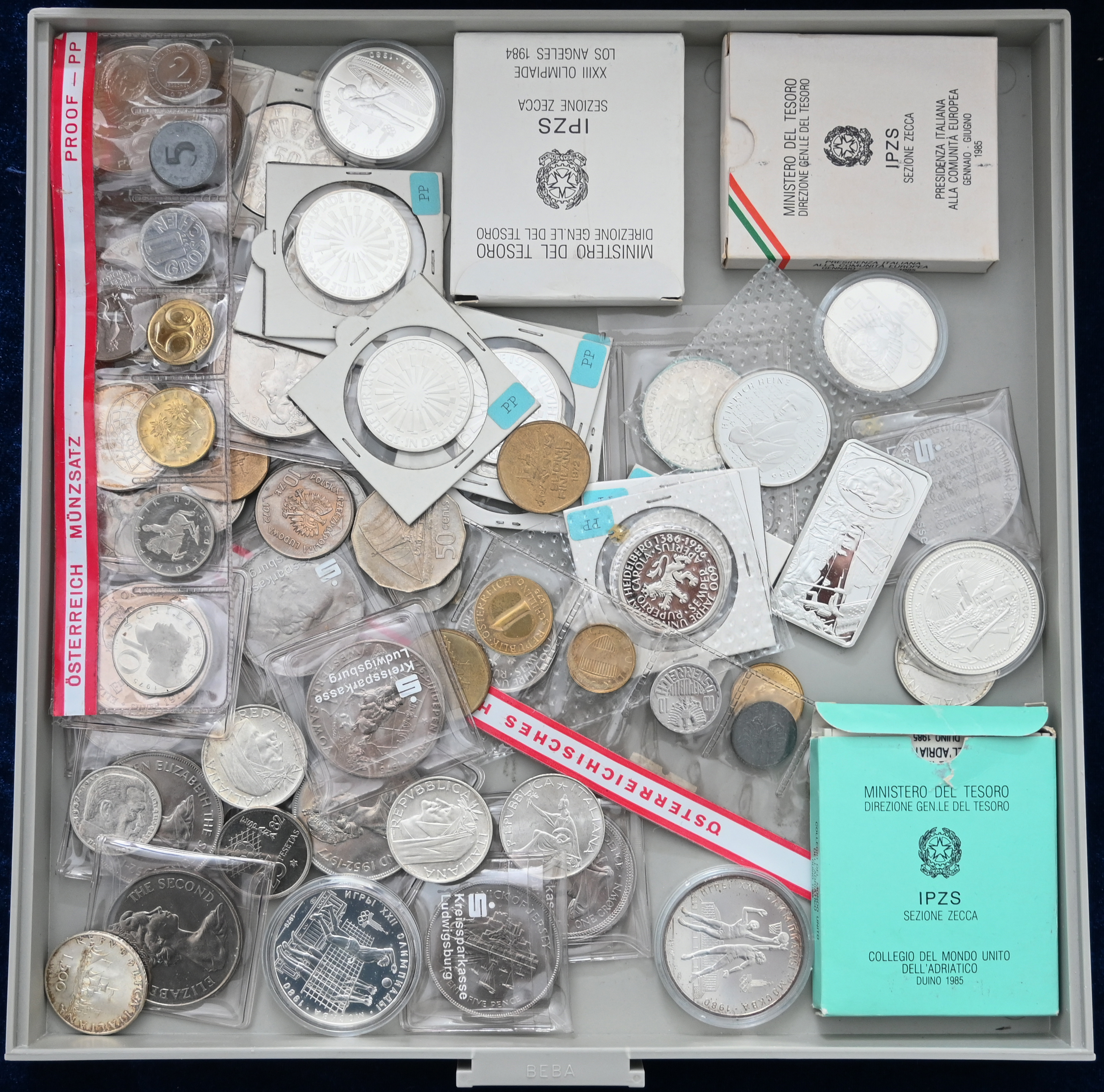 Voller Beba Kasten mit Sammlung alle Welt, dabei u.a. viel Österreich Silber Schillinge, DM 10 DM Münzen, Schiffsmotive (u.a. China Dschunkendollar) sowie Österreich 4