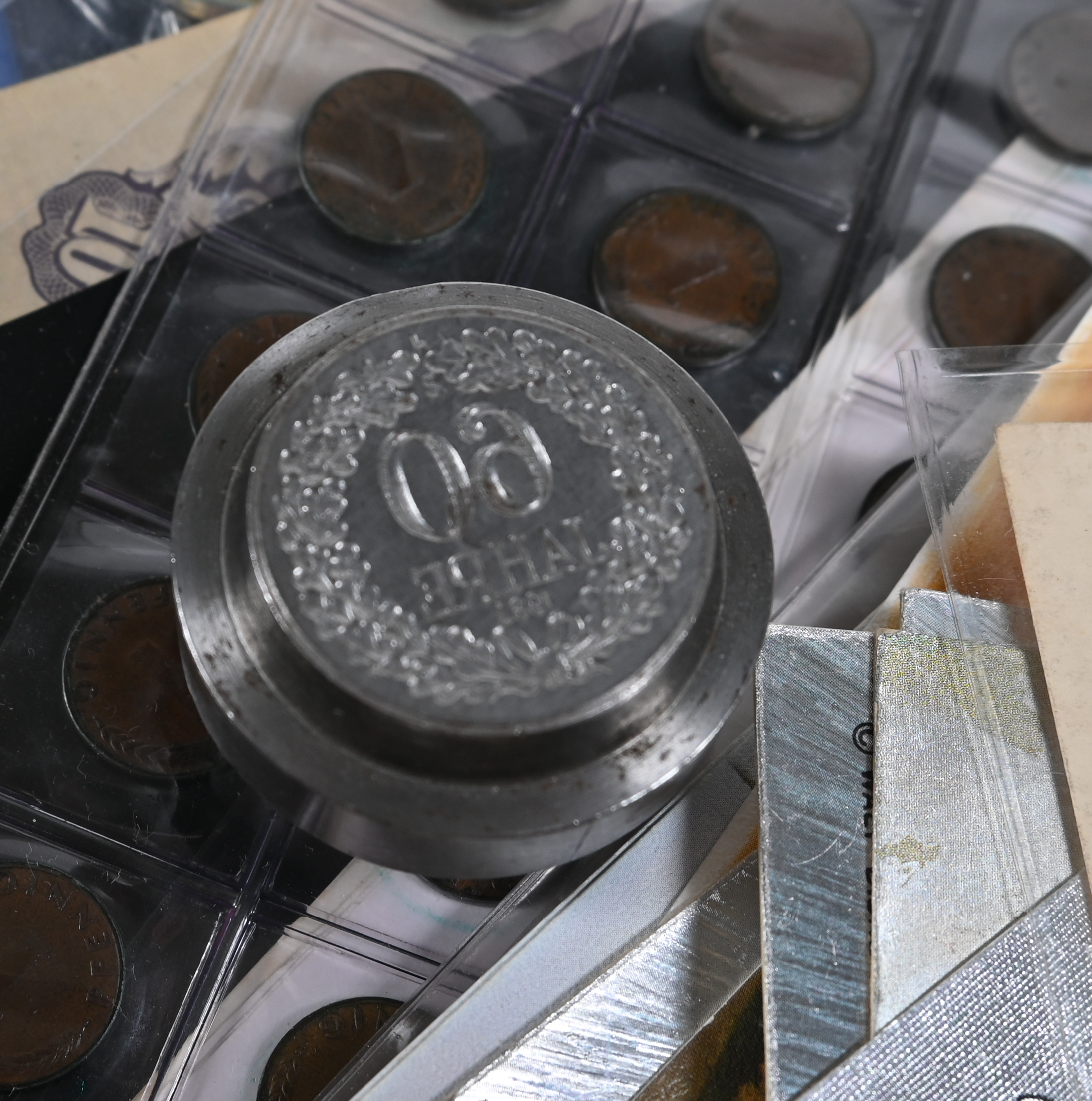 Wunderkiste mit Münzen, Medaillen, Banknoten, Bierzipfel, Ansichtskarten u.s.w. eine wahre Fundgrube für den Sammler. (1066584) (Image) (image1)