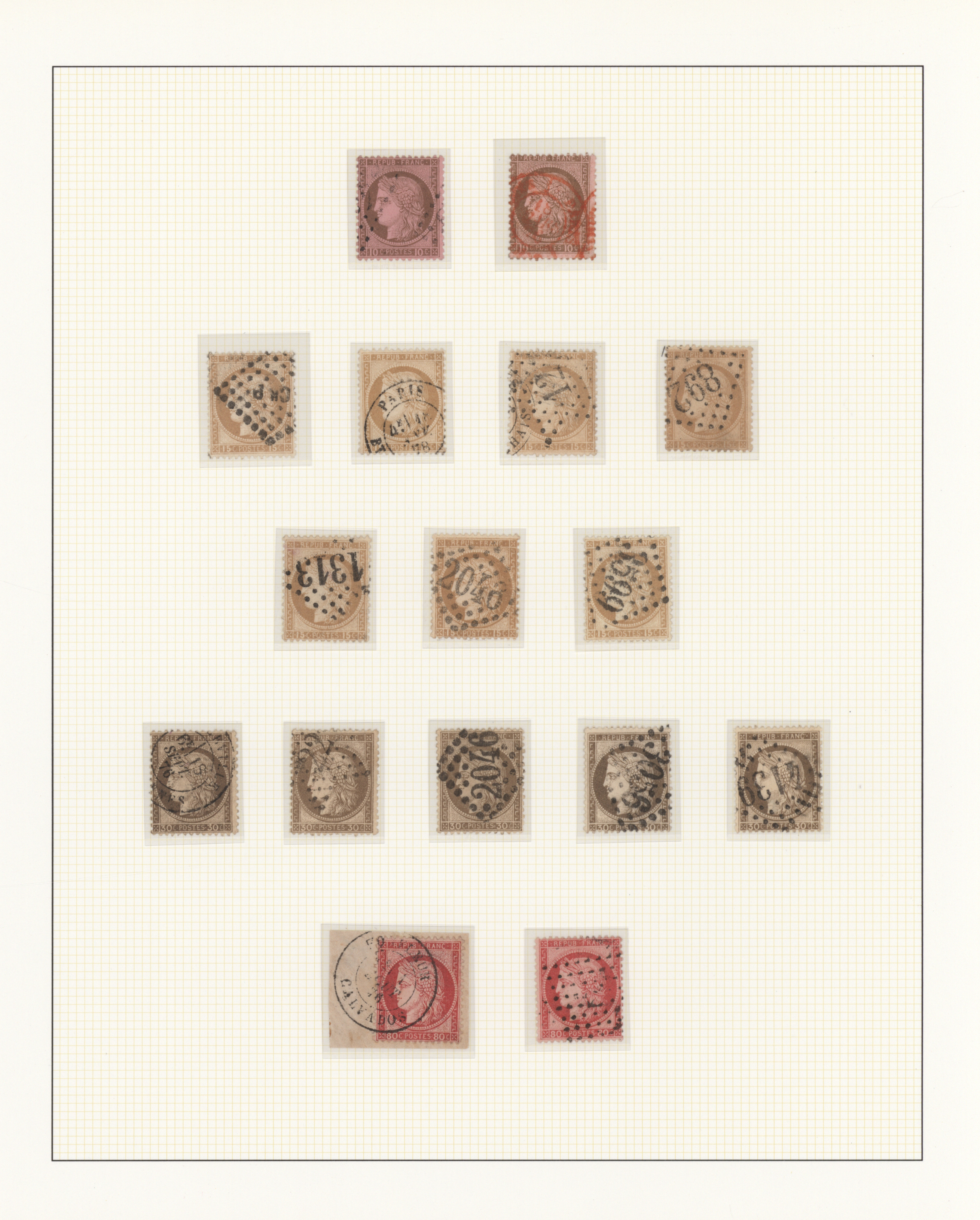 1870 Ceres: More than 150 used stamps perforated, with 10c. (7), 40c. (80) and 20c., with identified cancellations like numerals, circled datestamps and others, in slightly