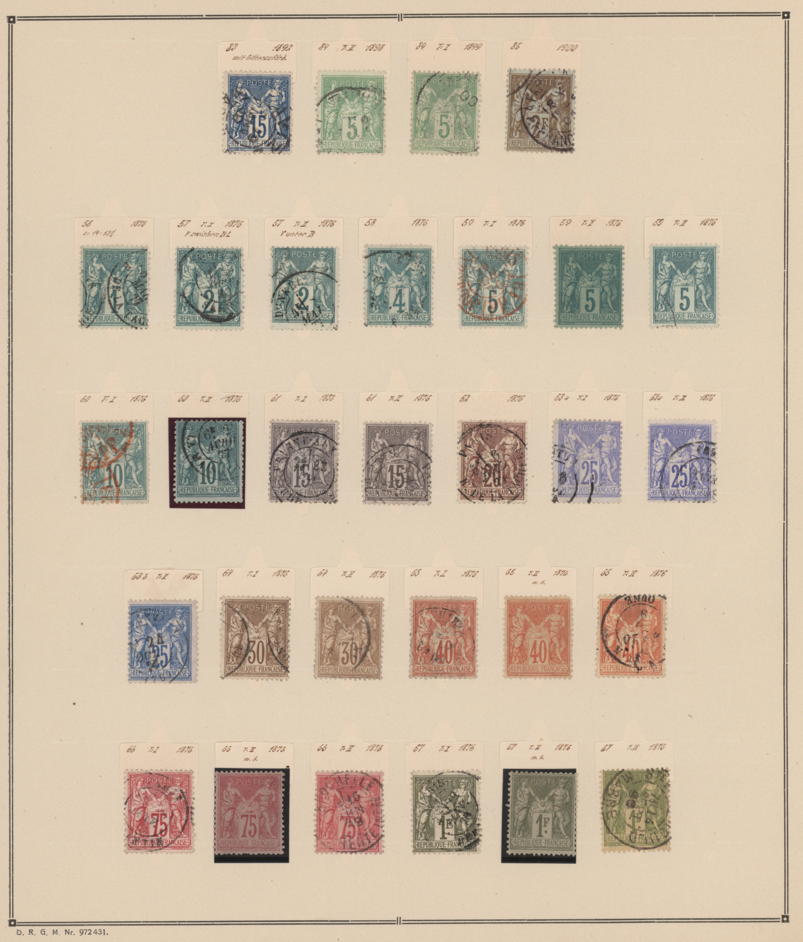 1875/1890, used and unused collection of 58 stamps type Sage, neatly arranged on album pages, incl. better values like Maury no. 62 used (280,- €), 76 used (300,- €), 81