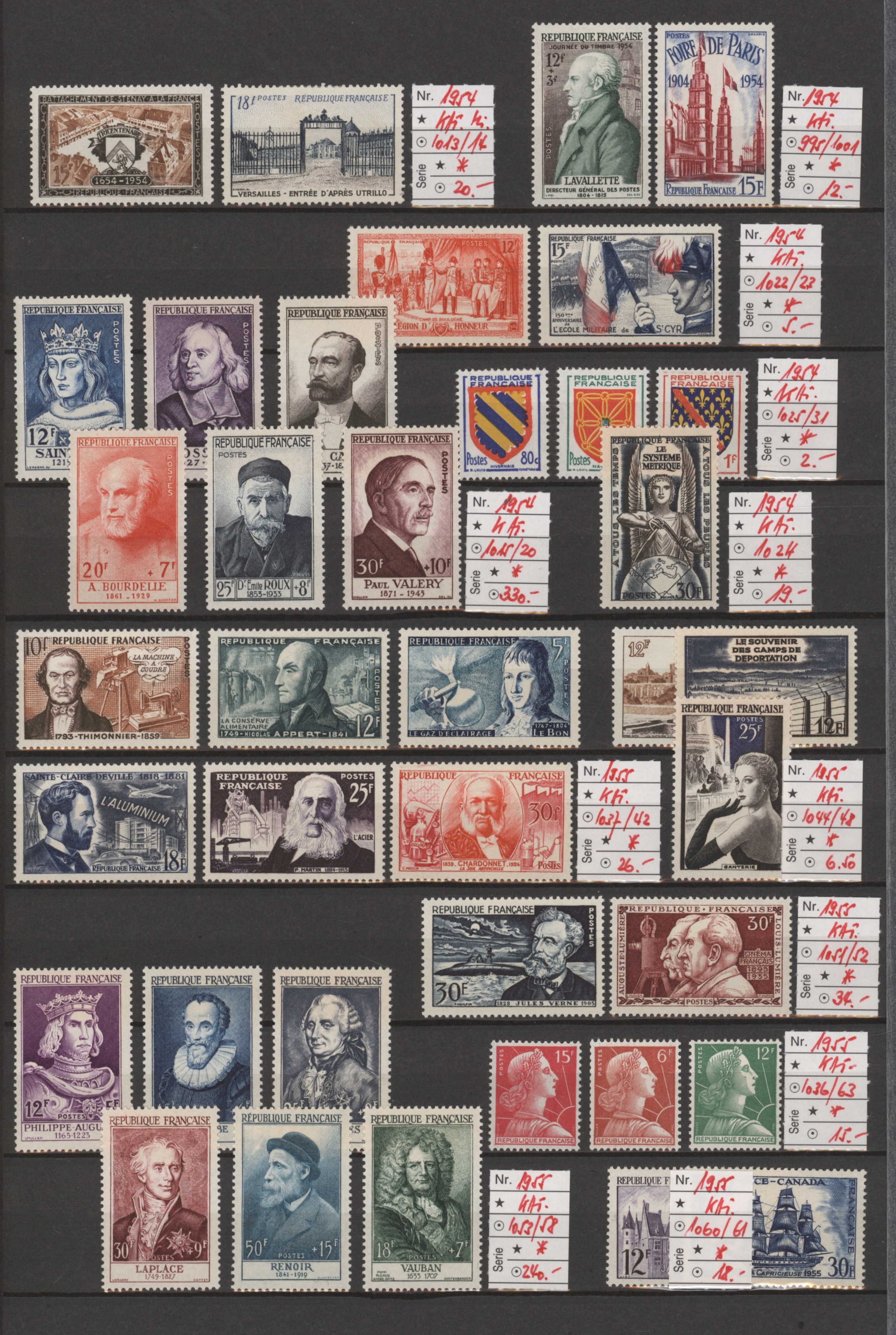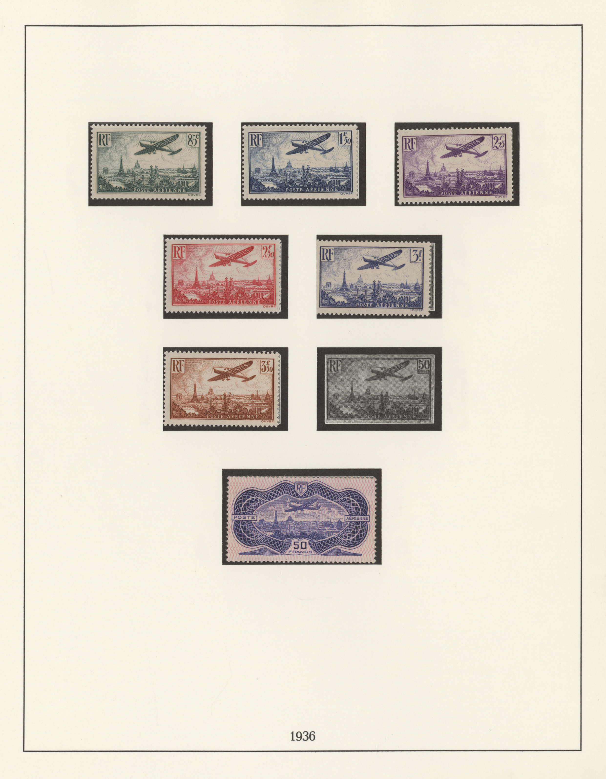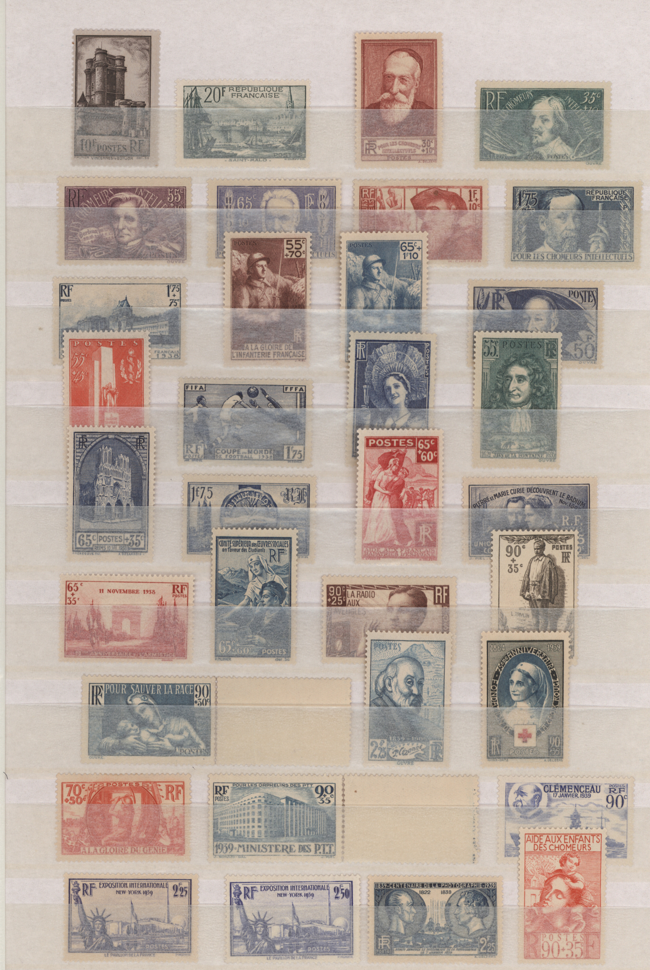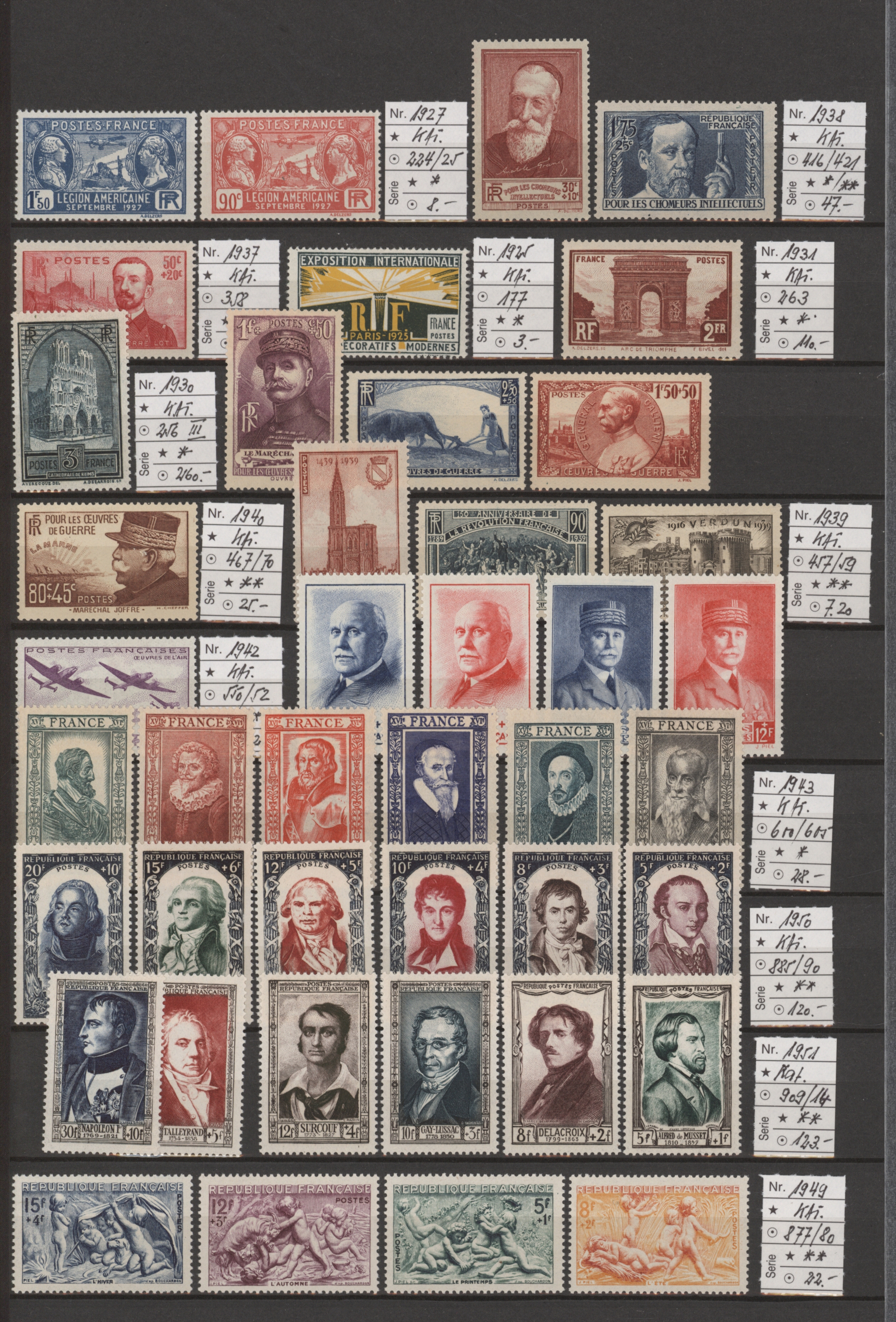 Airmail 1936 50fr. Burelage and 10fr. Atlantic crossing, 1937 Louvre, Famous Frenchmen sets, nice Back of Book, etc. High cat.value!