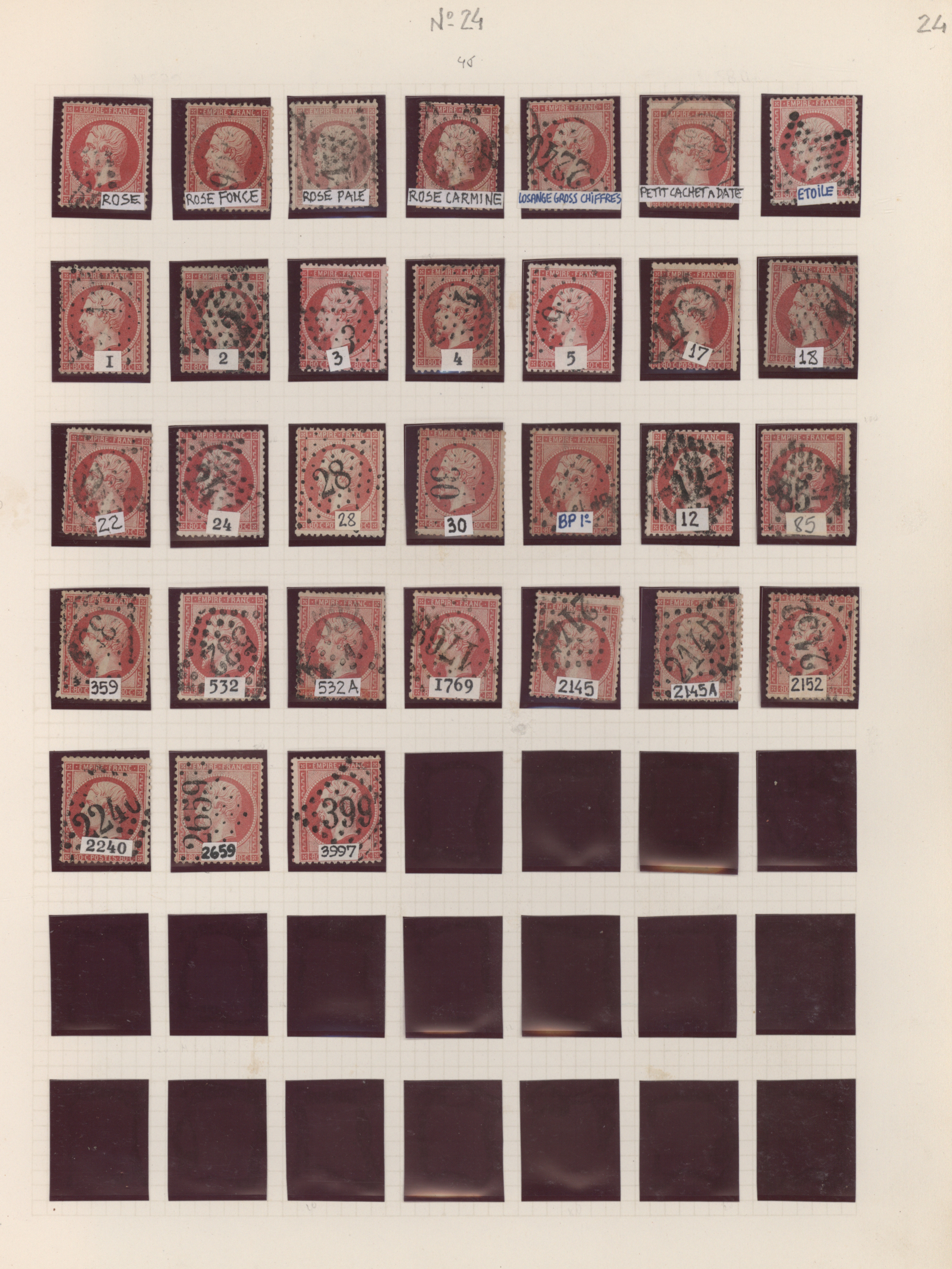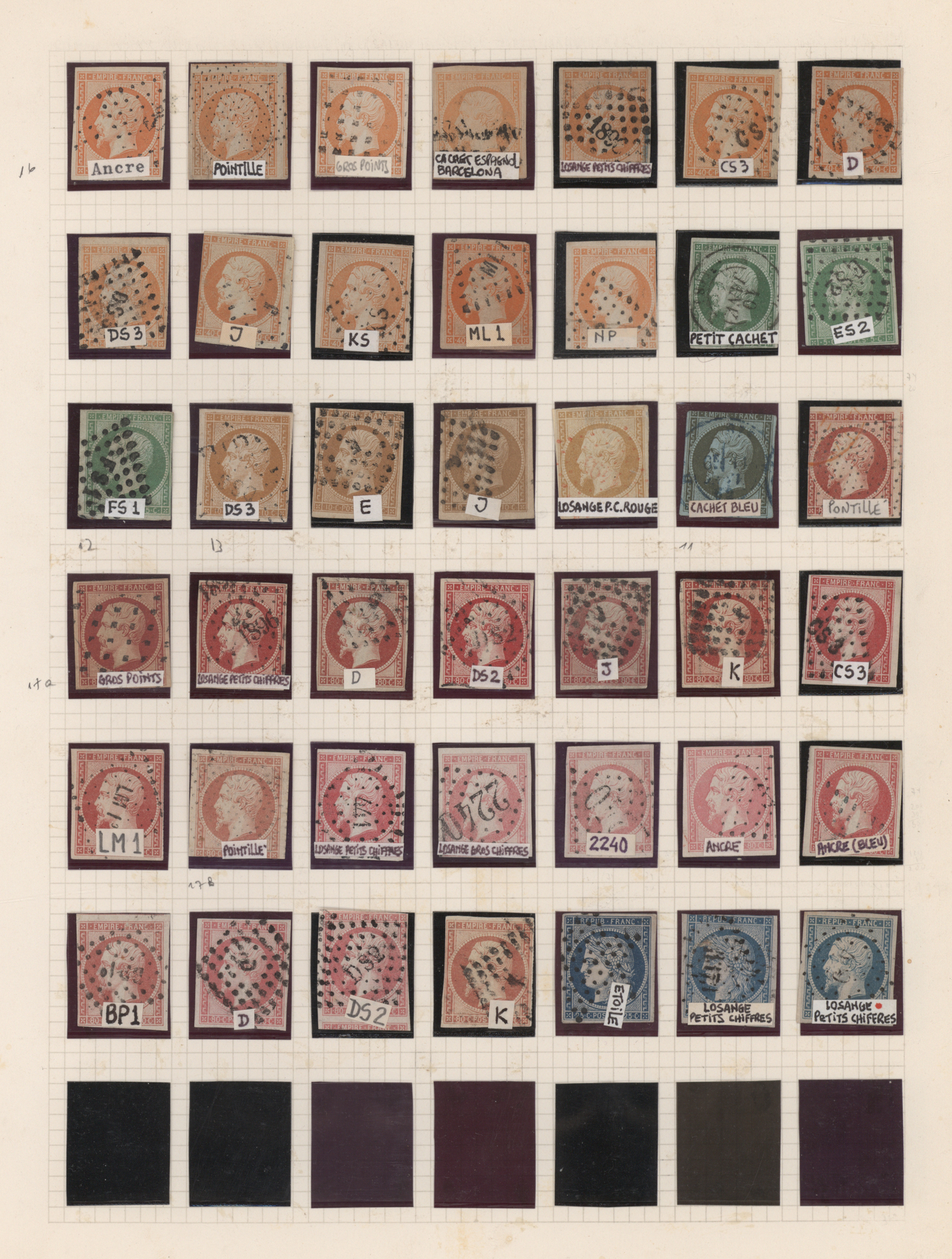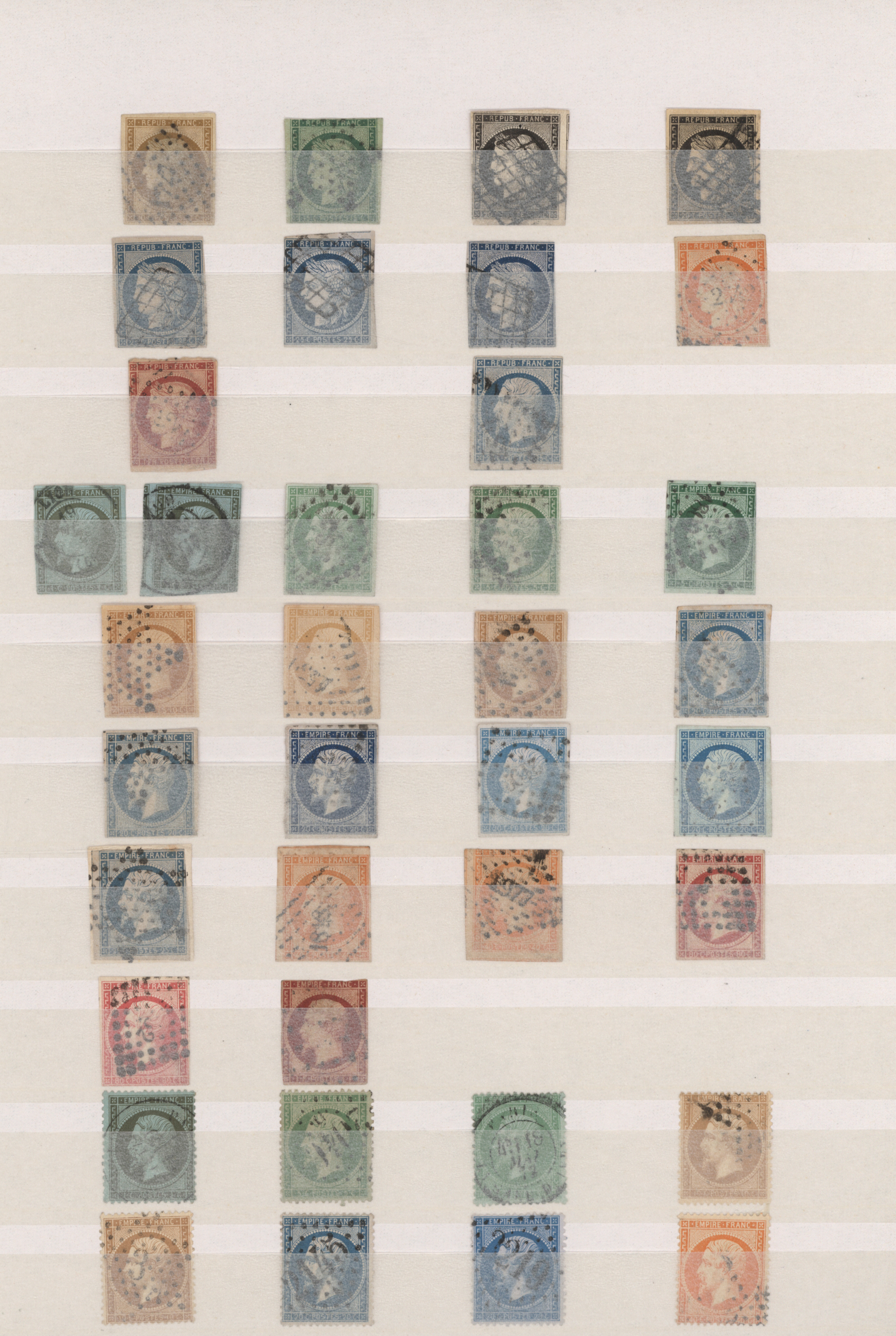 1853/61 Napoleon: About 260 used stamps imperforate, from 1c. to 80c. with identified cancellations like numerals (mostly), circled datestamps and others, in slightly mixed
