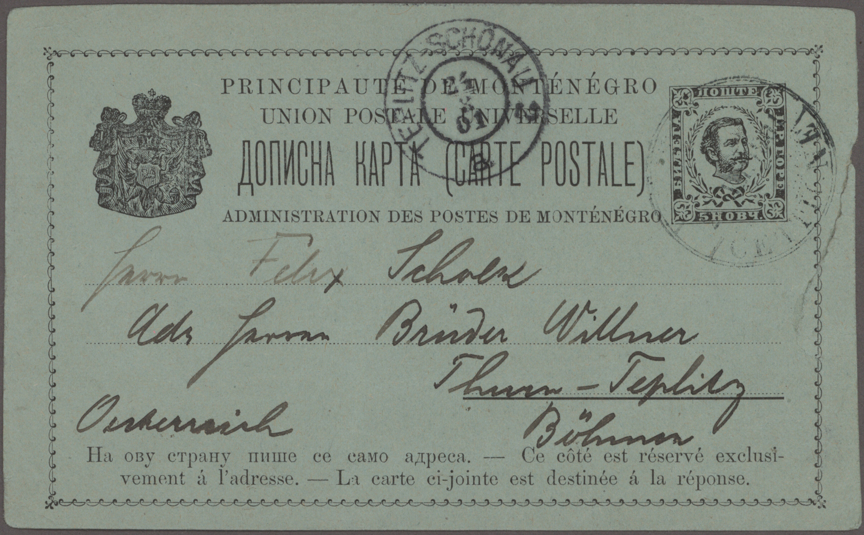 1894/1895, Incoming mail, lot of six stationeries to Cettinje, all but one addressed to Otto Bickel (and partly redirected to Germany), comprising GB, Queensland, Bechuanaland, Barbados, Victoria and Gibraltar.