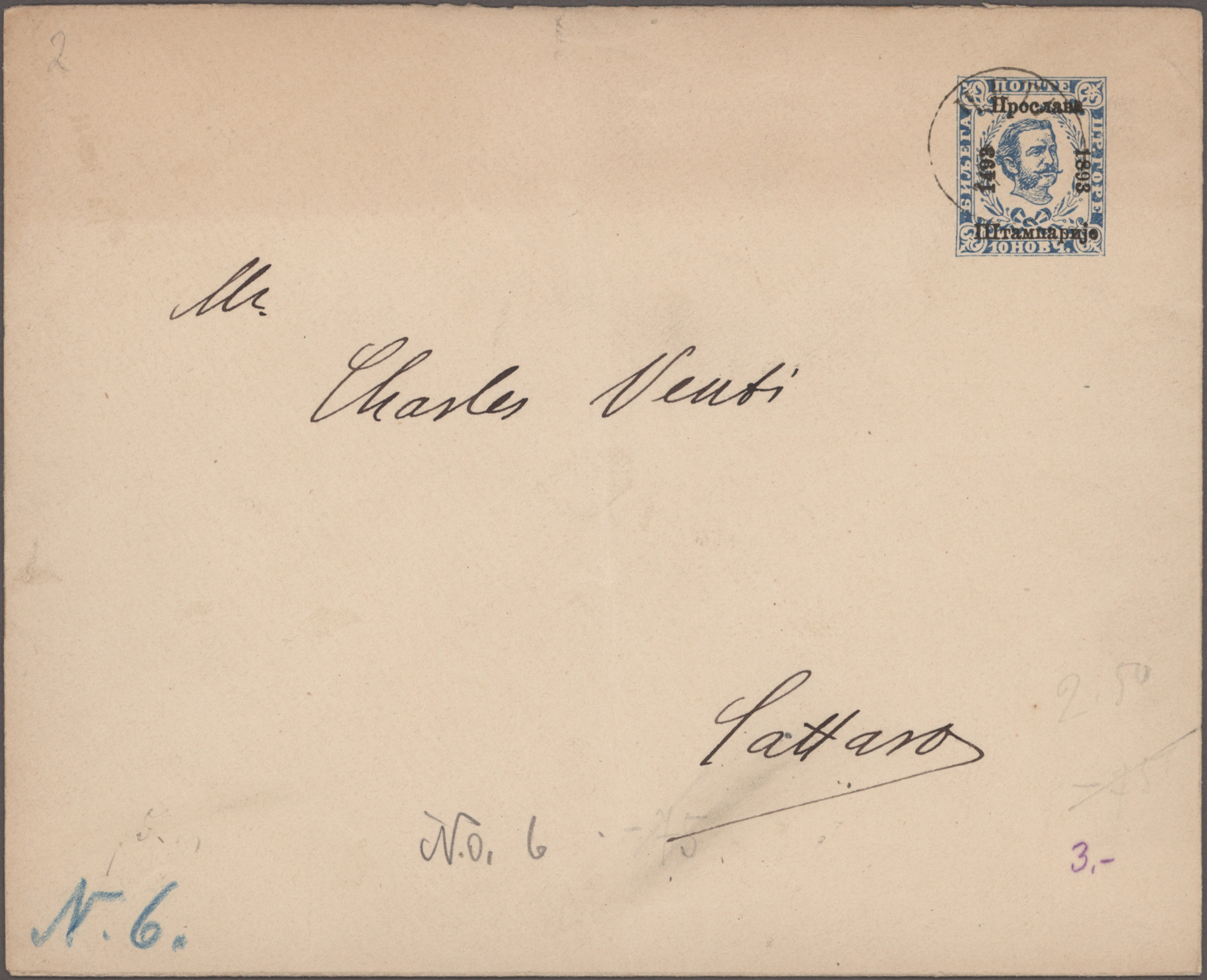 1903/1904, Prince Nikola Crown currency, assortment of six covers/cards, incl. three ppc (one to Algeria), 5h. green single franking on wrapper to Zurich, etc.