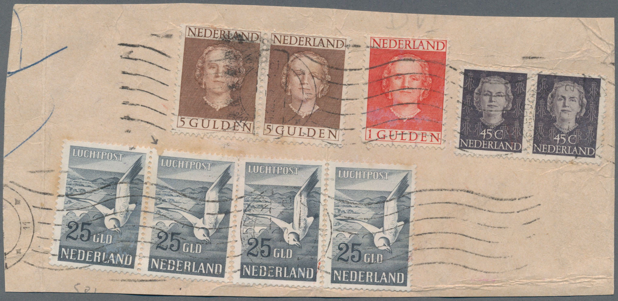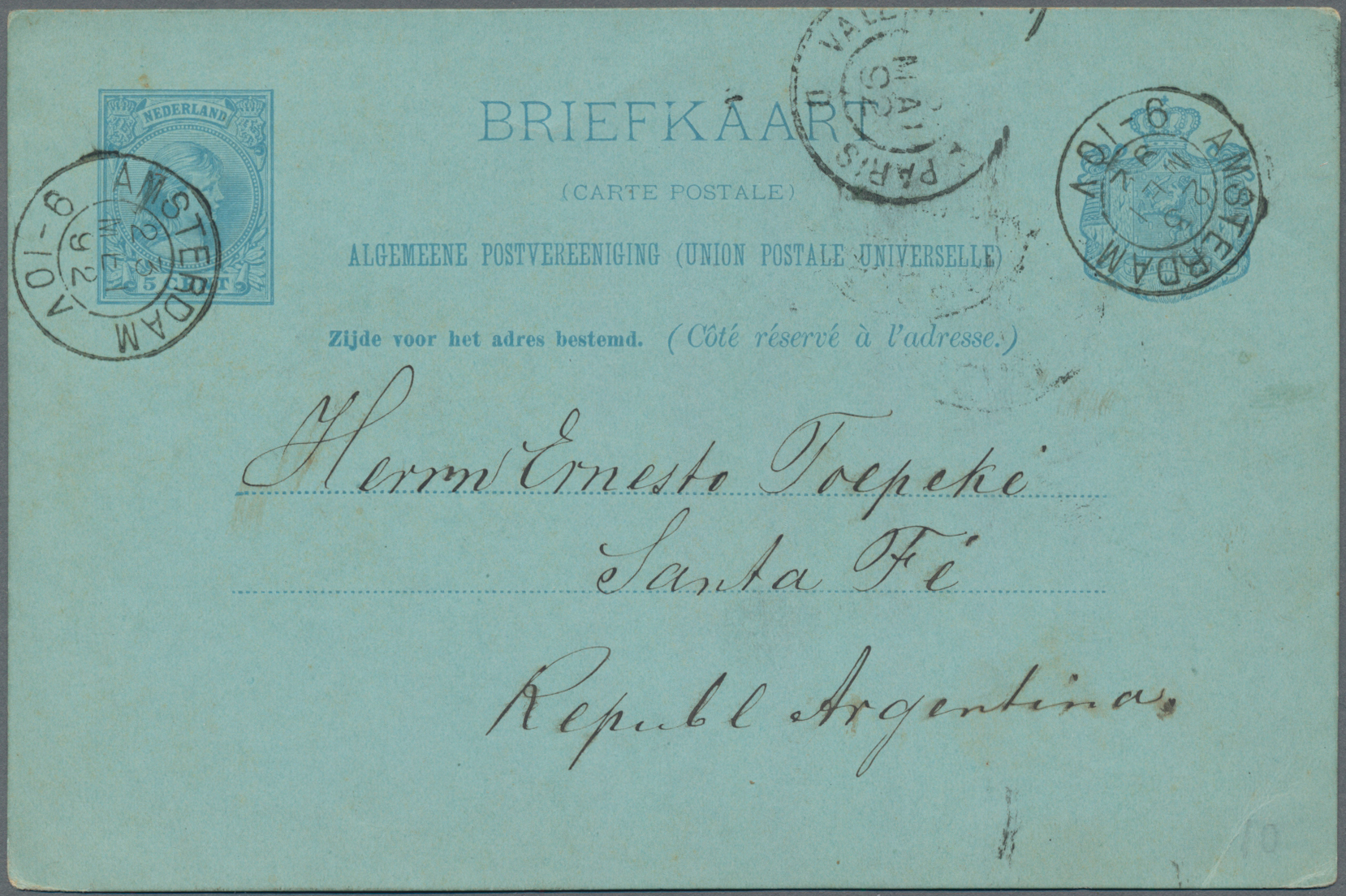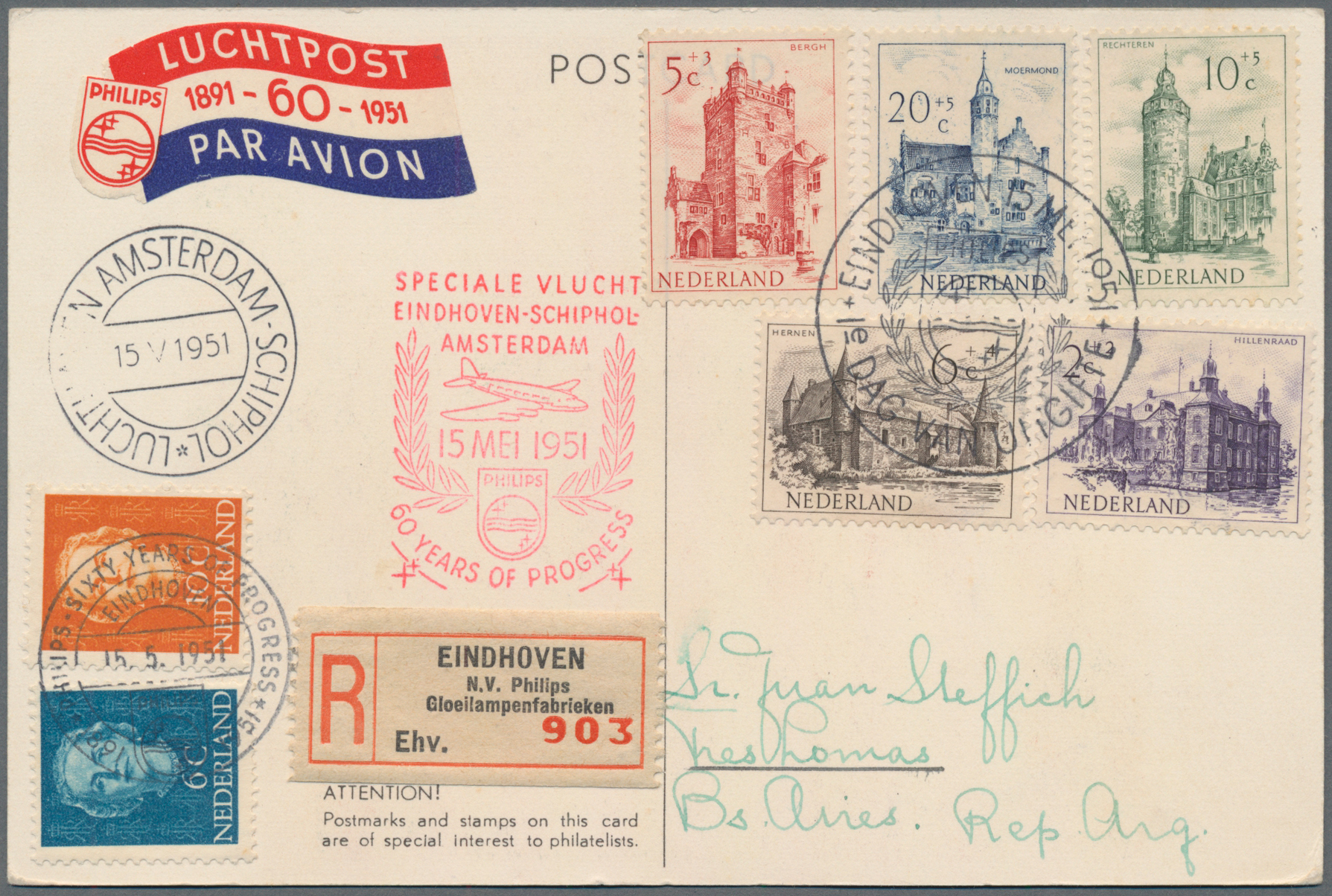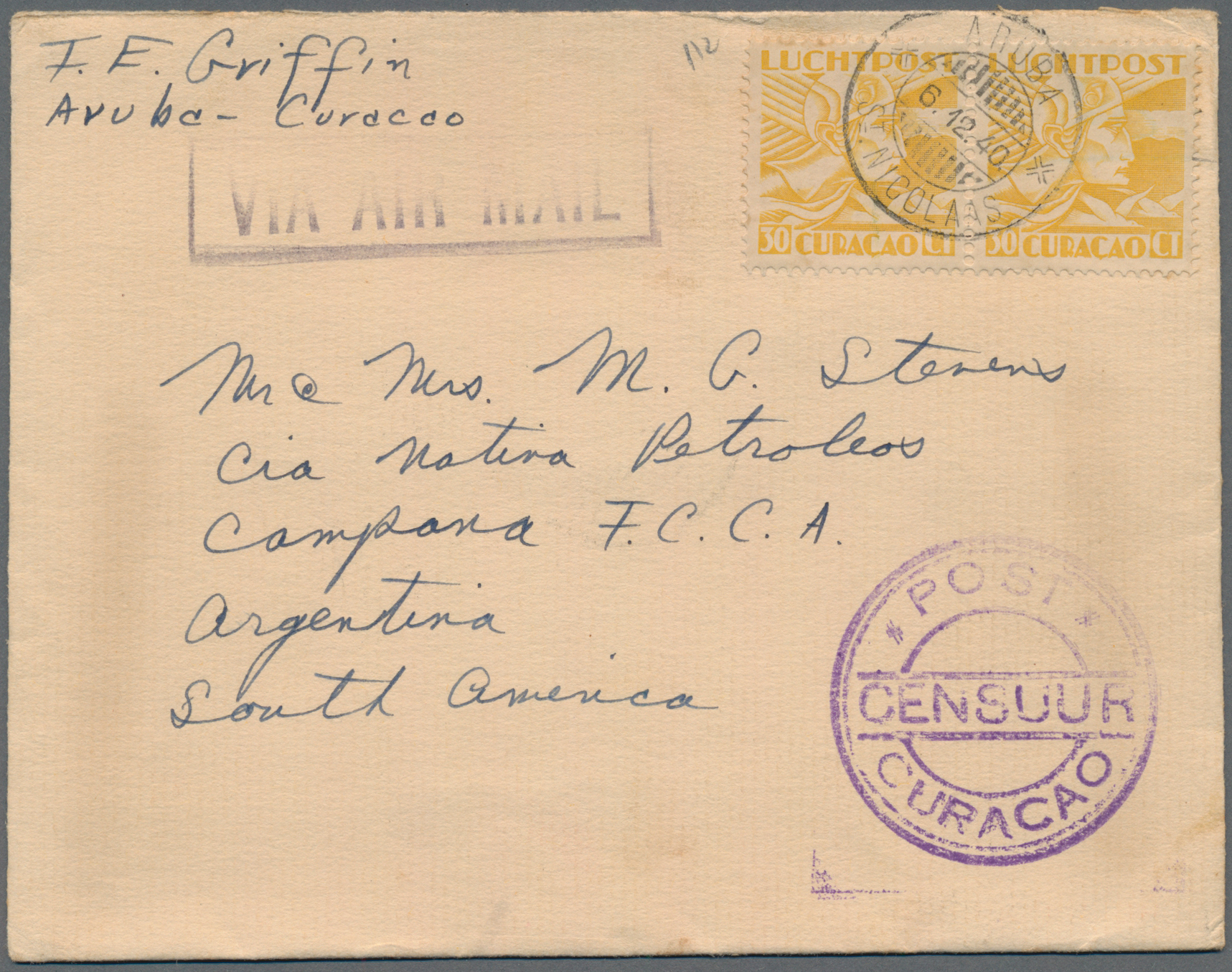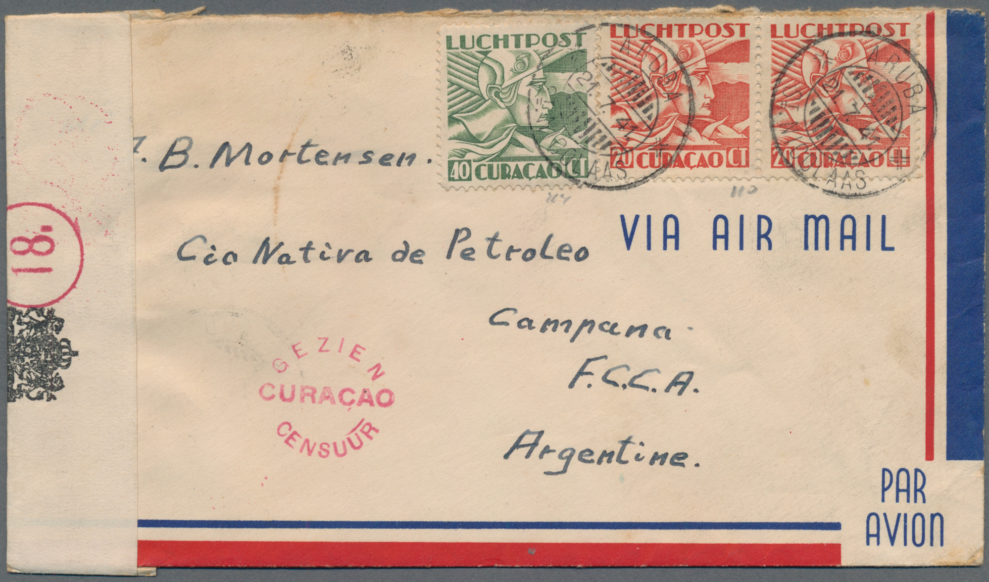 1890's-1950's: Used stamps, postcards, covers, pieces and postal stationery items from the Netherlands and Curacao, with mail to Argentina (incl. three censored covers from Curacao), 1951 FDCs to Argentina, pieces with high frankings like 1951 Air 25g., and others, plus a 12½c. pin-perf from Luxemburg.