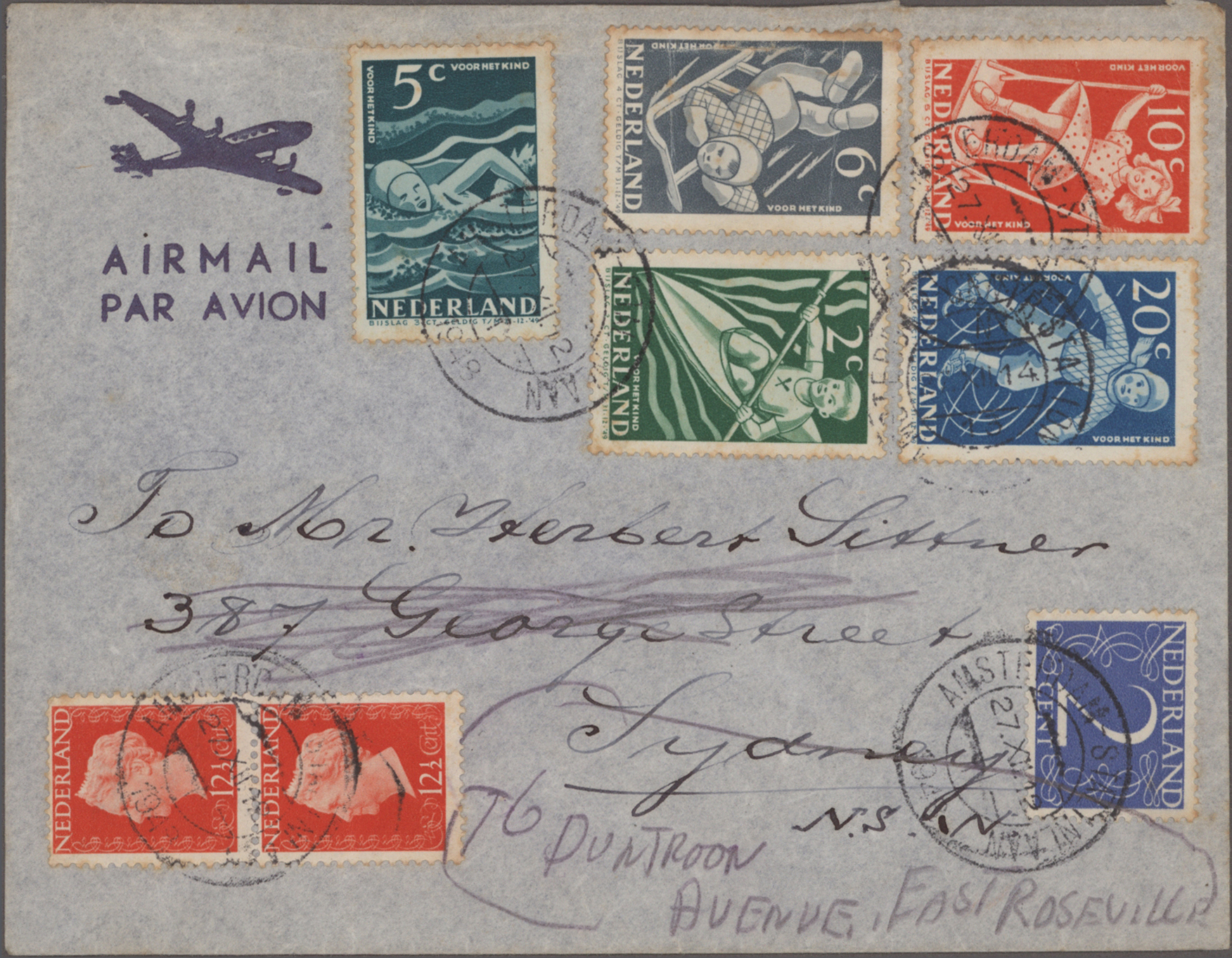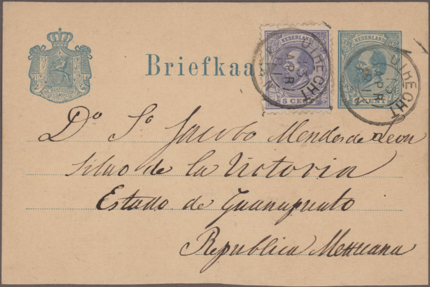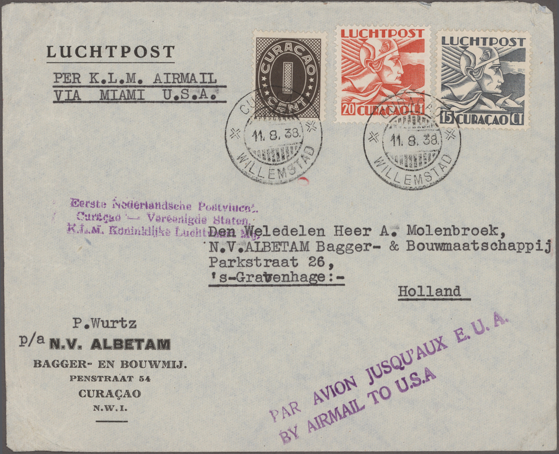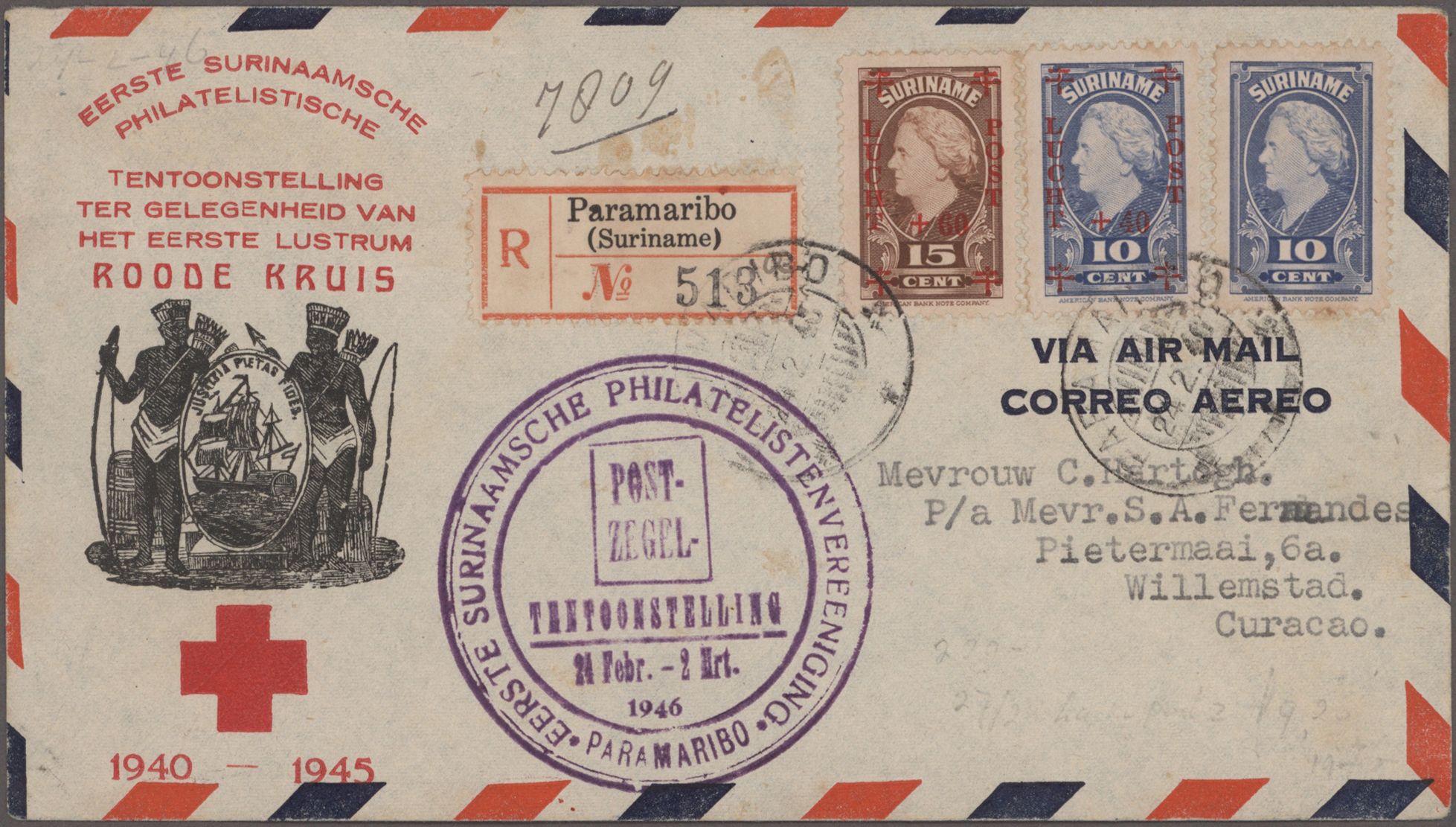 1890's-1950's: Used stamps, postcards, covers, pieces and postal stationery items from the Netherlands and Curacao, with mail to Argentina (incl. three censored covers from Curacao), 1951 FDCs to Argentina, pieces with high frankings like 1951 Air 25g., and others, plus a 12½c. pin-perf from Luxemburg.
