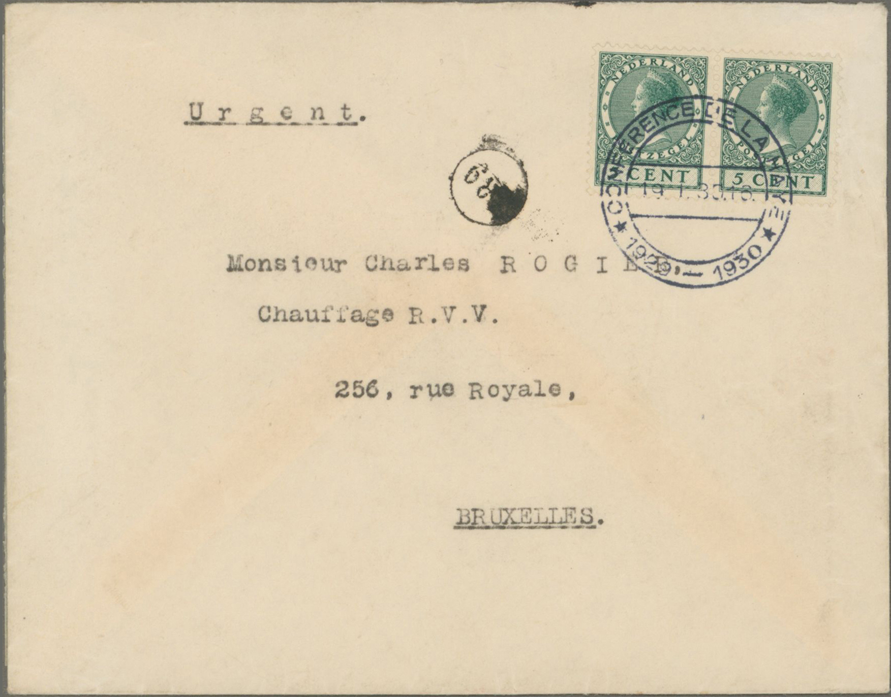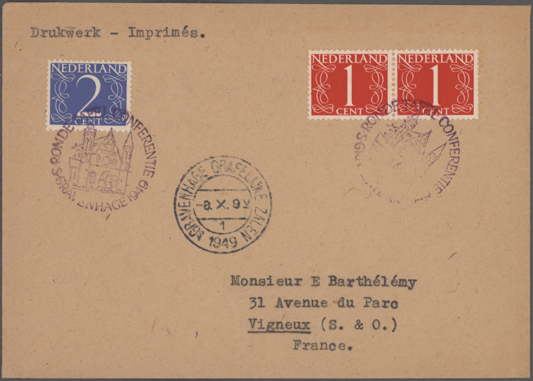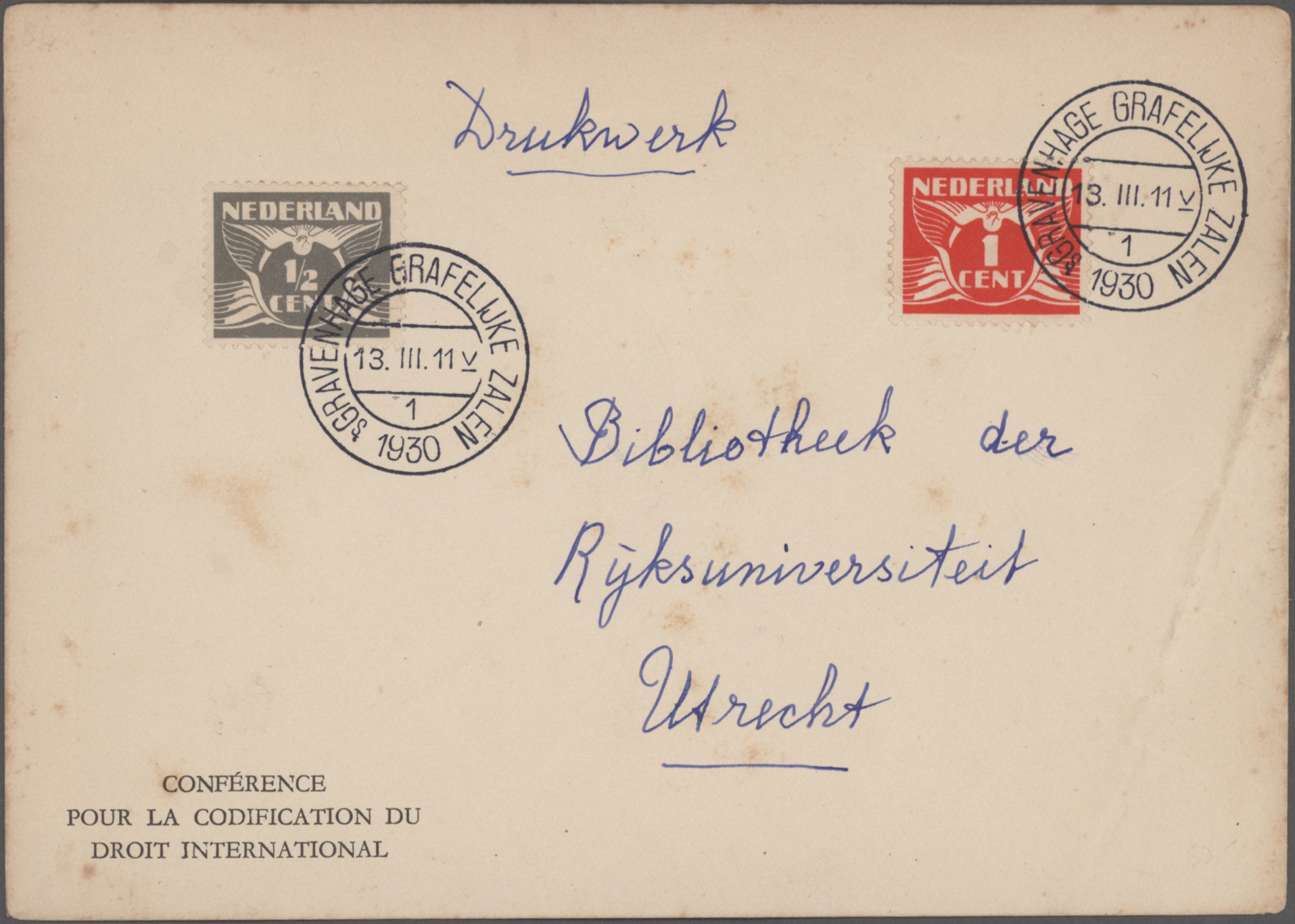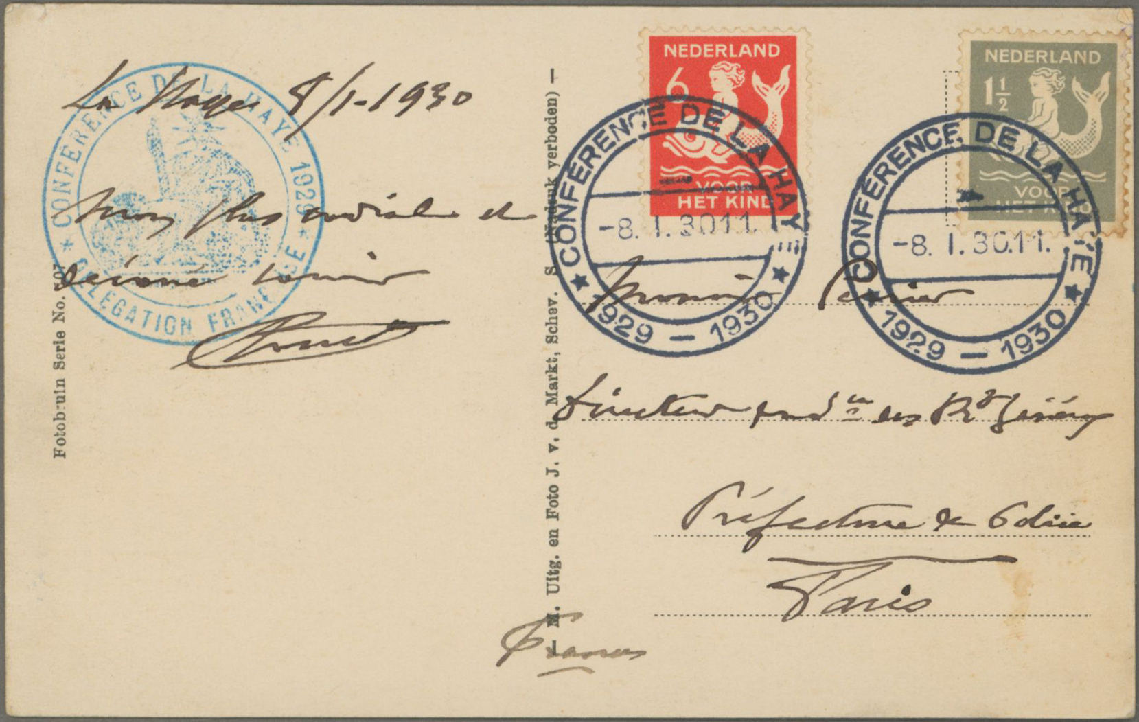 1929/1930, CONFÉRENCE DE LA HAYE 1929 and CONFÉRENCE DE LA HAYE 1929-1930, two different commemorative circular date stamps on ttl 3 service letters and one picture card with certain range of Wilhelmina definitives and Voor het kind semi-postals, despatched by various members of the British and French delegations with proper cachets BRITISH DELEGATION THE HAGUE (Den Haag) resp. DÉLÉGATION FRANCAISE to UK, France, Belgium and domestical. Scarce items.