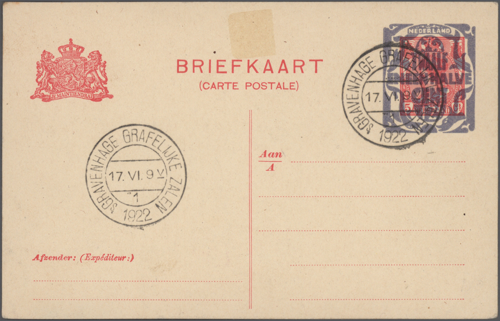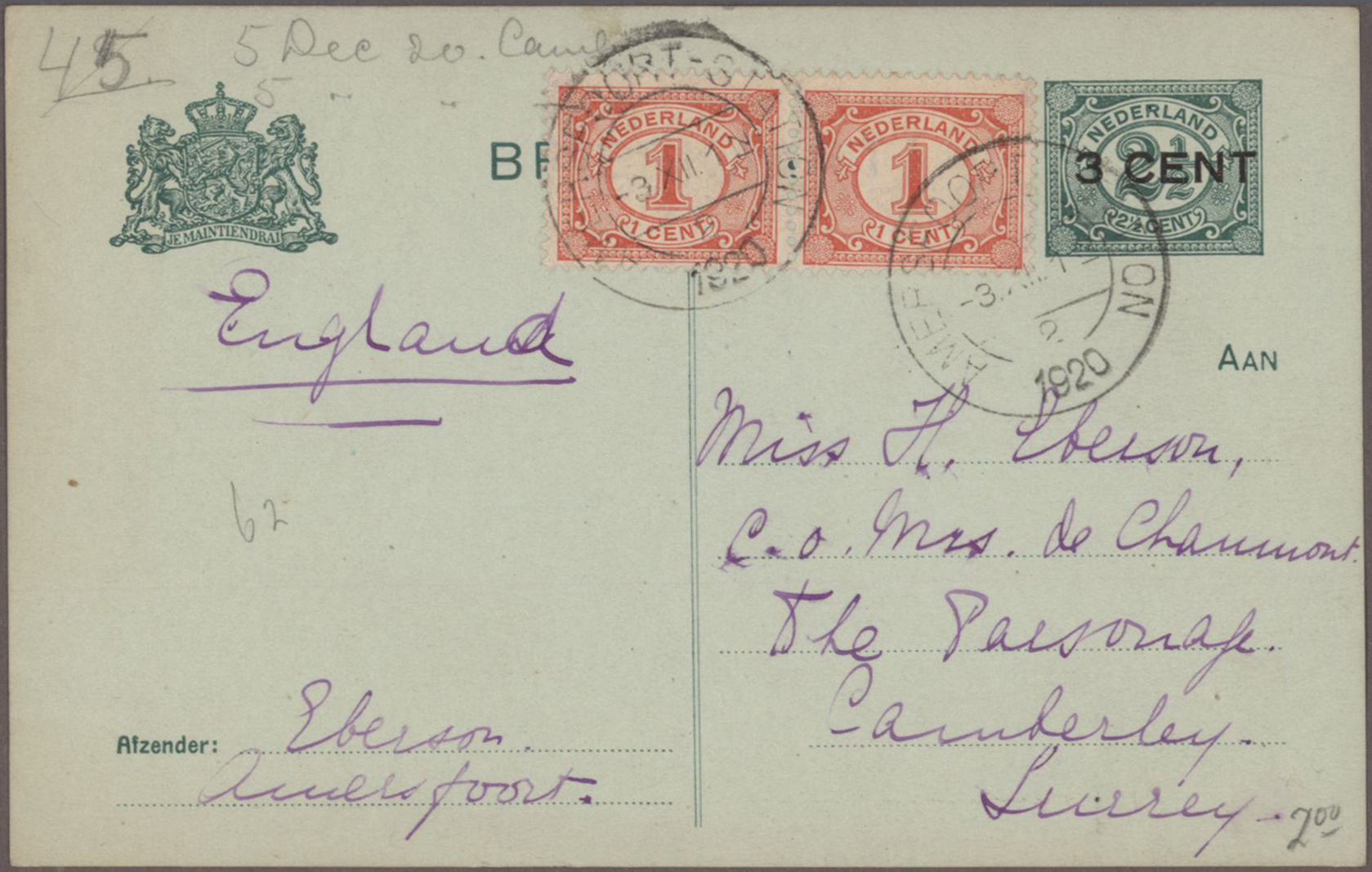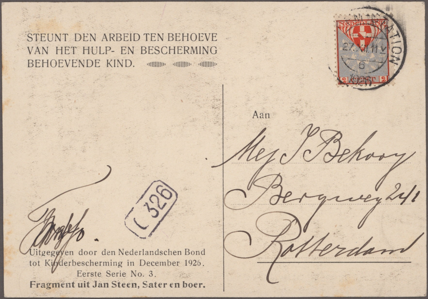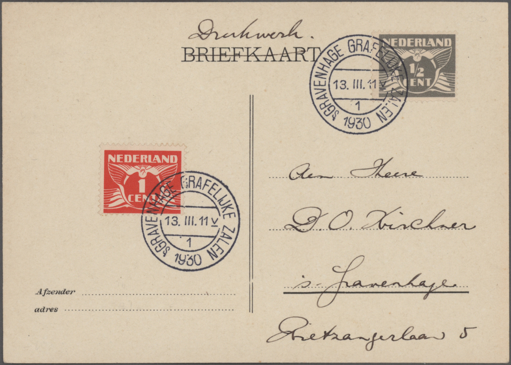 1929/1930, CONFÉRENCE DE LA HAYE 1929 and CONFÉRENCE DE LA HAYE 1929-1930, two different commemorative circular date stamps on ttl 3 service letters and one picture card with certain range of Wilhelmina definitives and Voor het kind semi-postals, despatched by various members of the British and French delegations with proper cachets BRITISH DELEGATION THE HAGUE (Den Haag) resp. DÉLÉGATION FRANCAISE to UK, France, Belgium and domestical. Scarce items.
