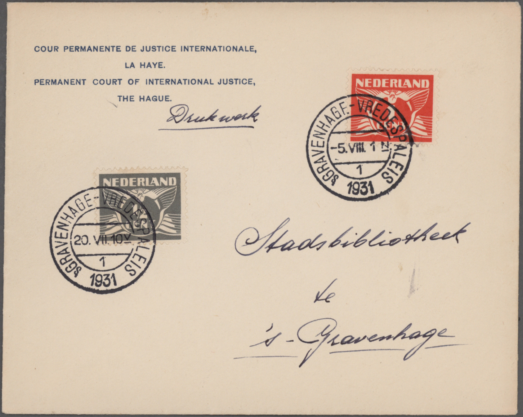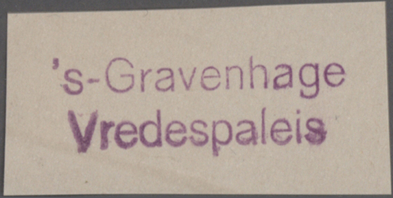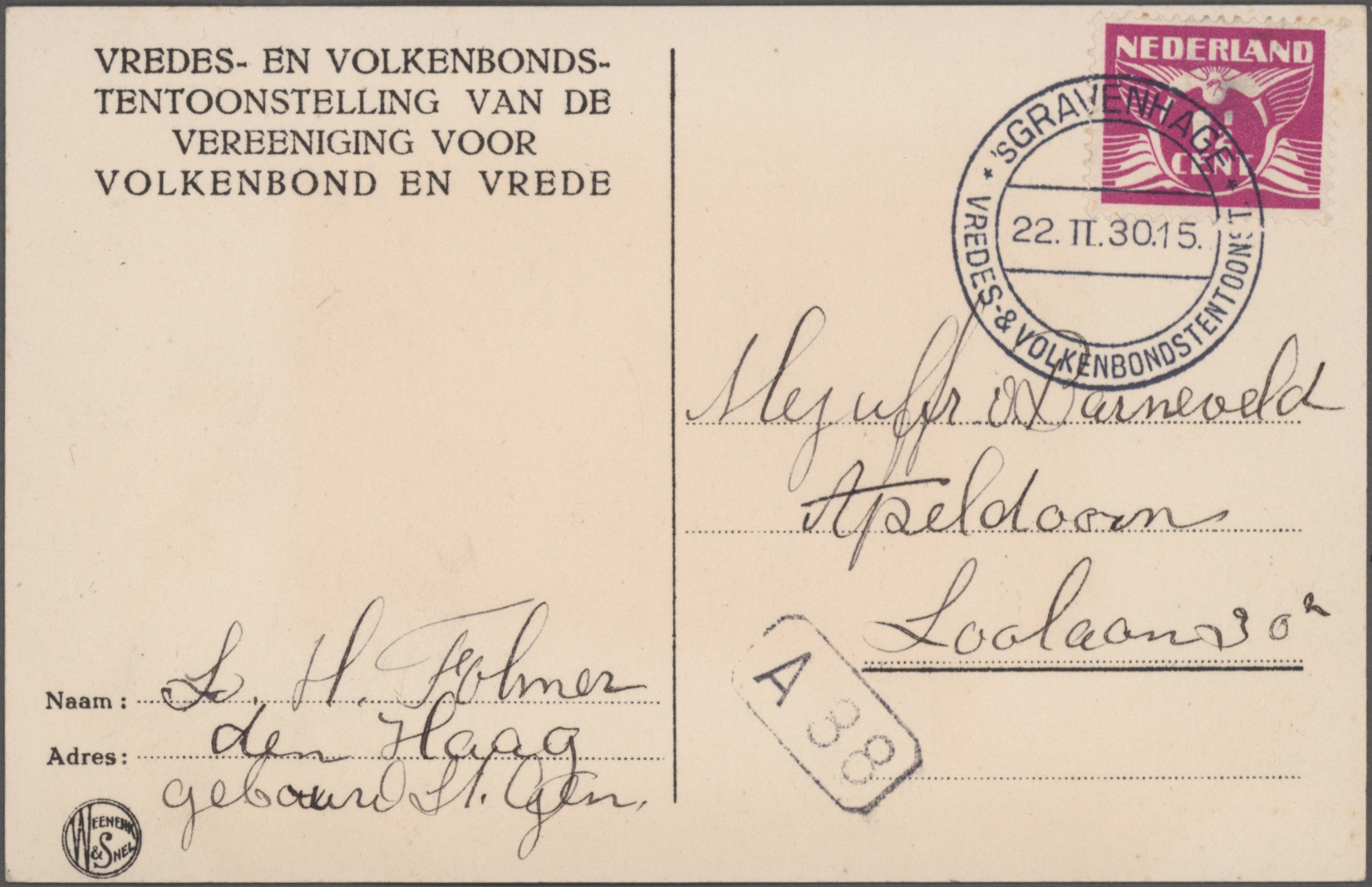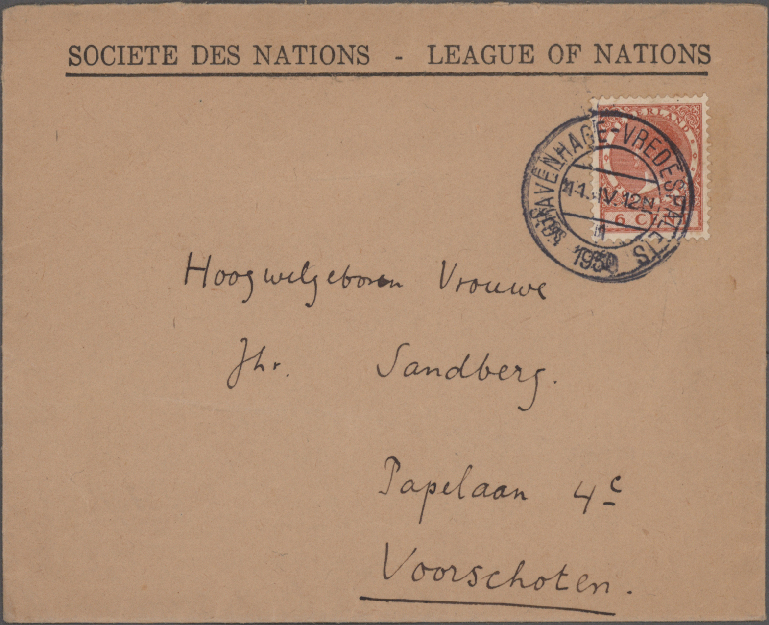 1922-1950, Völkerbund / Société des Nations / League of Nations: Topical collection of Dutch commemorative cancel 's-Gravenhage VREDENSPALEIS, dto. GRAVELIJKE ZALE and dto. HUGO GROTIUS on letters and post cards, majority of which sent "on service"/ commercially used from The Hague (Den Haag), some letters with pre-printed sender's address "SOCIETE DES NATIONS" or "Cour permanente de justice internationale / Permanent court of international justice". Throughout items hard to find, scarce.
