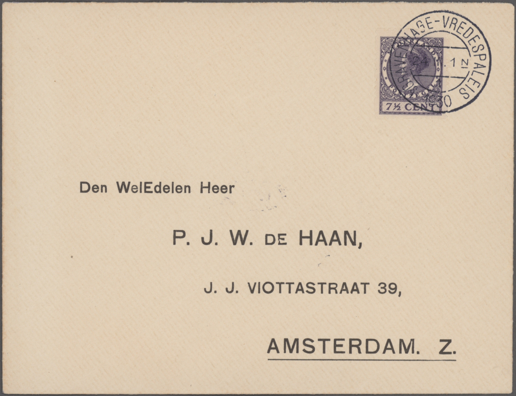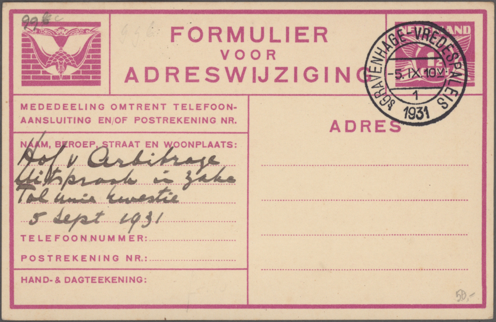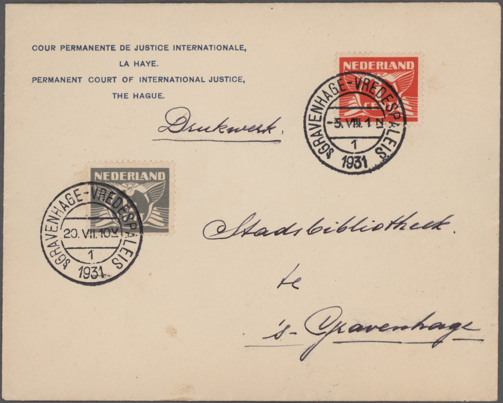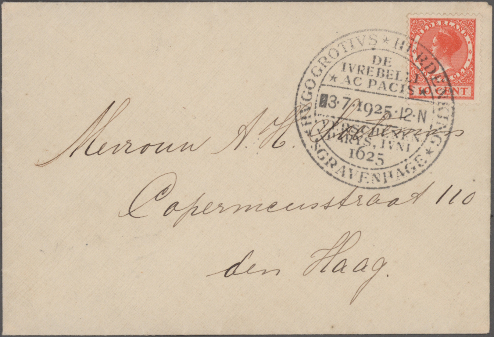 1922-1950, Völkerbund / Société des Nations / League of Nations: Topical collection of Dutch commemorative cancel 's-Gravenhage VREDENSPALEIS, dto. GRAVELIJKE ZALE and dto. HUGO GROTIUS on letters and post cards, majority of which sent "on service"/ commercially used from The Hague (Den Haag), some letters with pre-printed sender's address "SOCIETE DES NATIONS" or "Cour permanente de justice internationale / Permanent court of international justice". Throughout items hard to find, scarce.