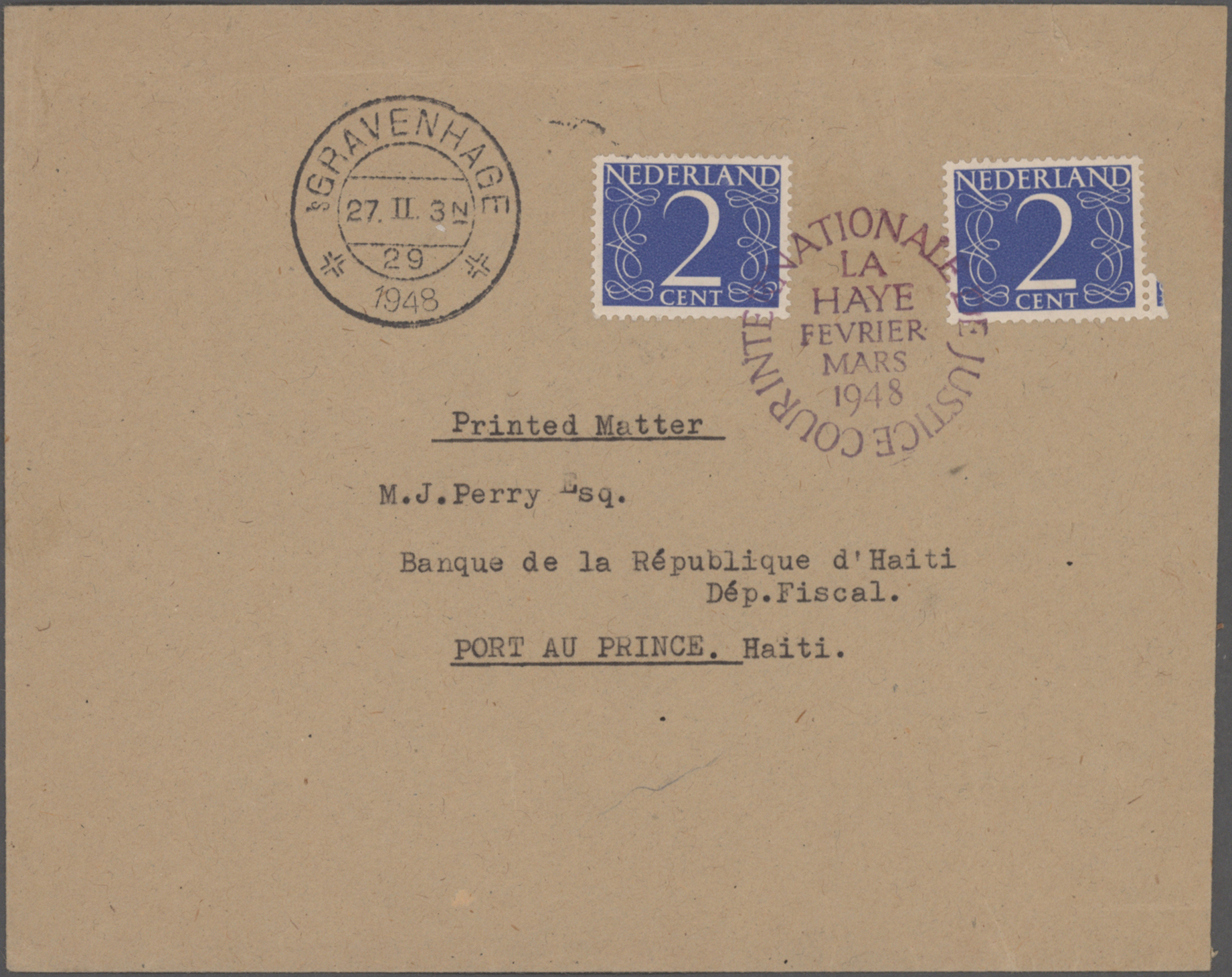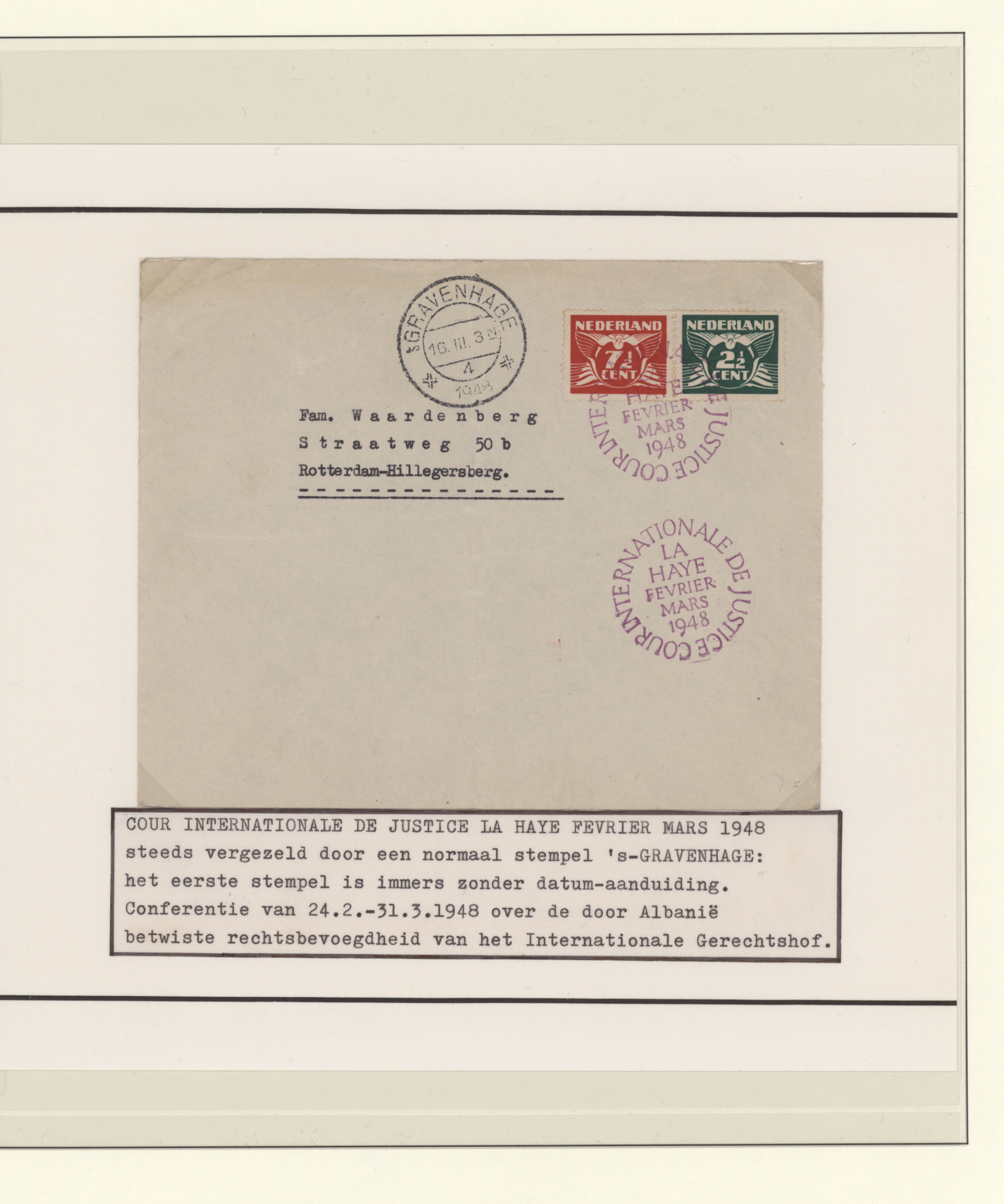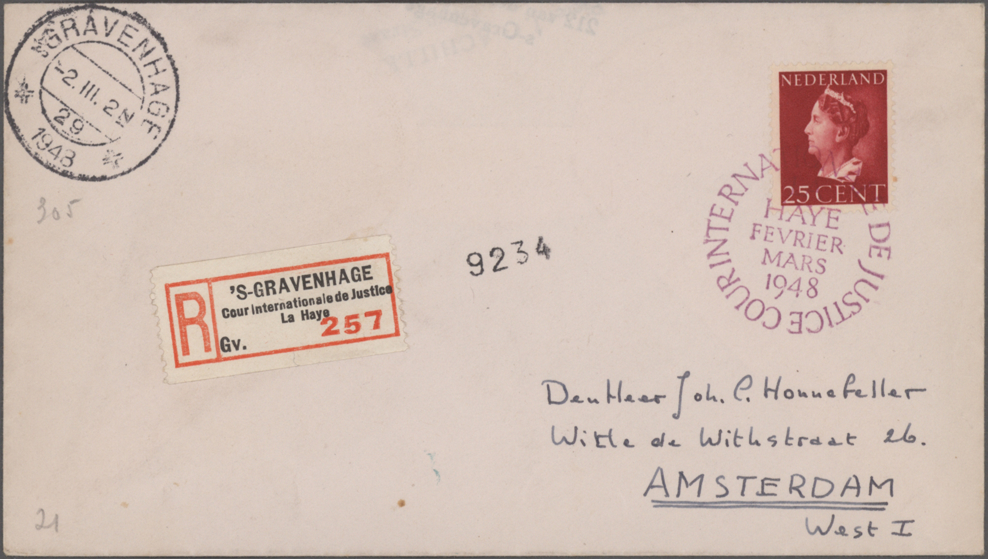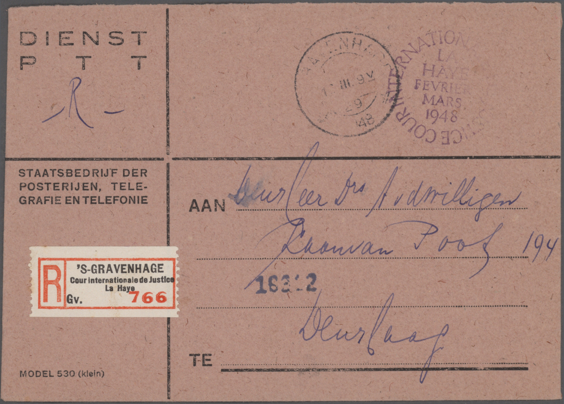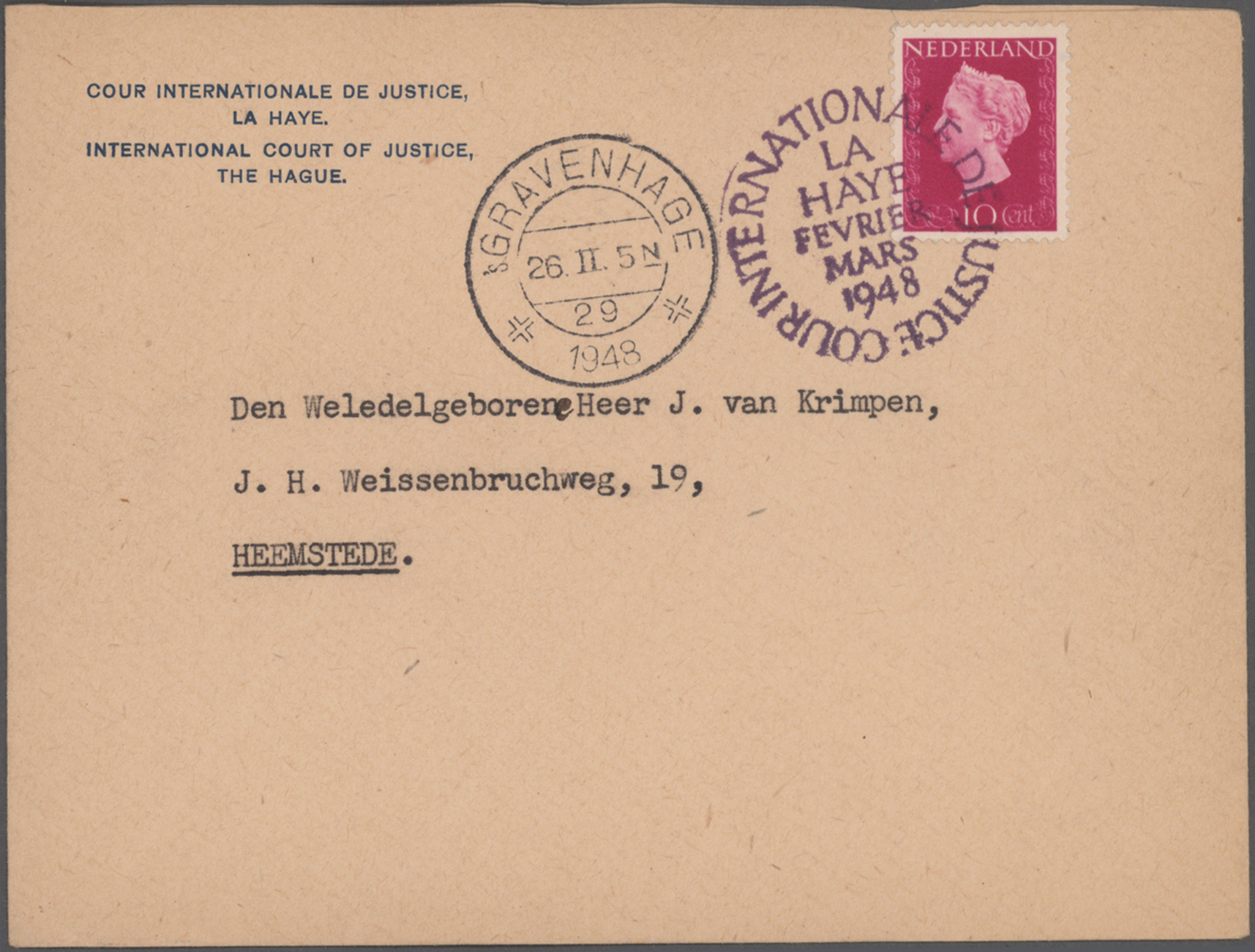 1948, COURT INTERNATIONALE DE JUSTICE LA HAYE FEVRIER MARS 1948, specialized collection of the purple colour date-less COMMEMORATIVE CANCEL commercially used on letters, registered mail, PTT service mail etc., all despatched "on service" from the International Court of Justice in The Hague (Den Haag) domestically and to addressees abroad (USA, Haiti). All hard to find. Contains also formal letter by PTT describing in Dutch language the terms and conditions of sale of Dutch C.I.J. service stamps (1947 issue, NVPH D20-D24), possibly unique.
