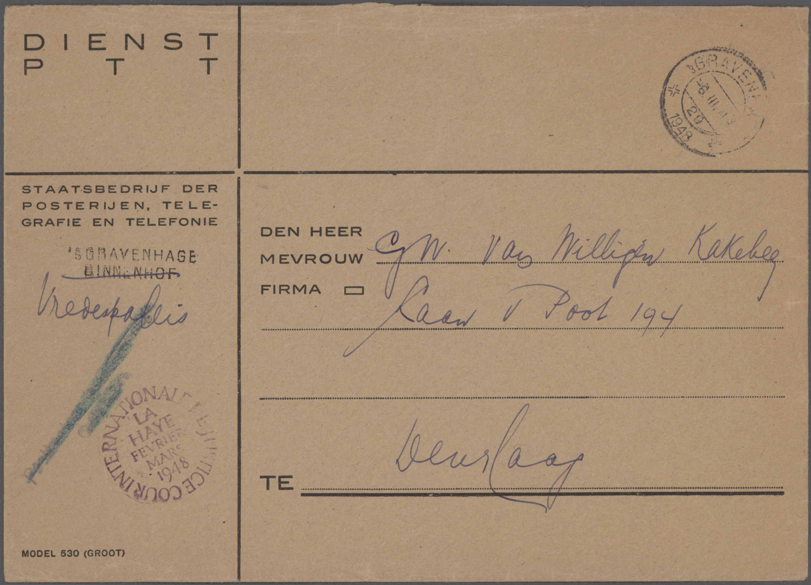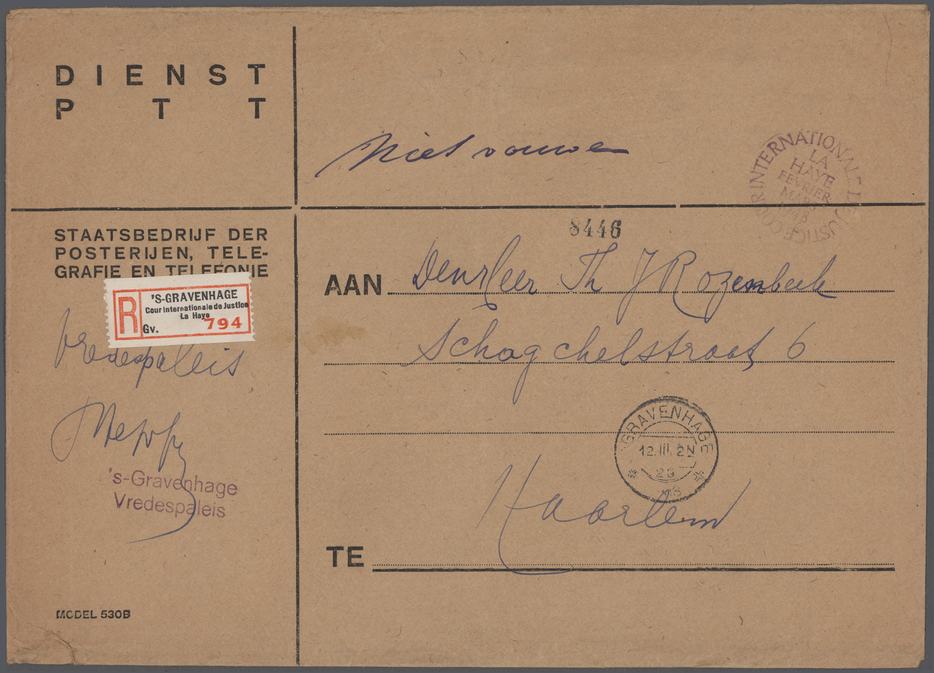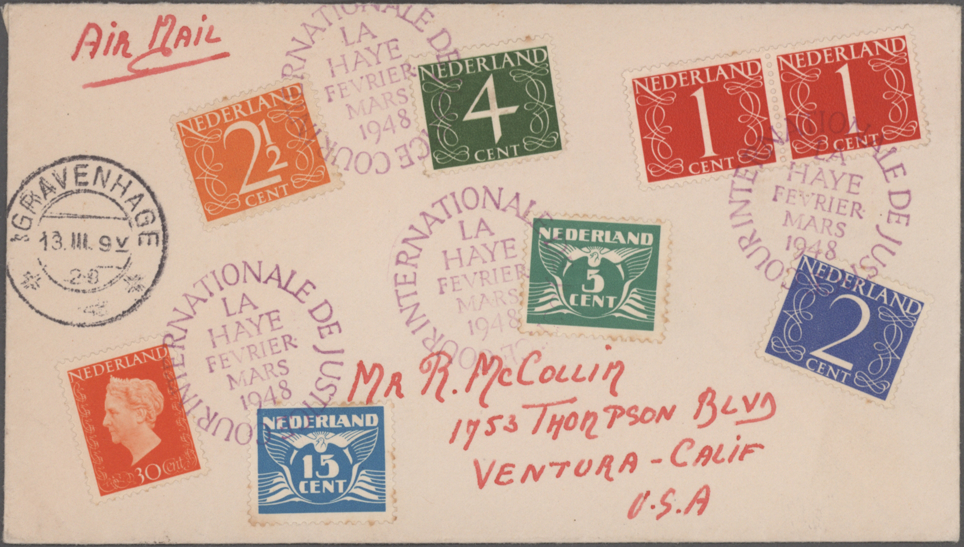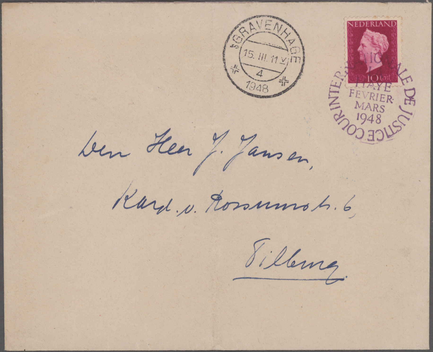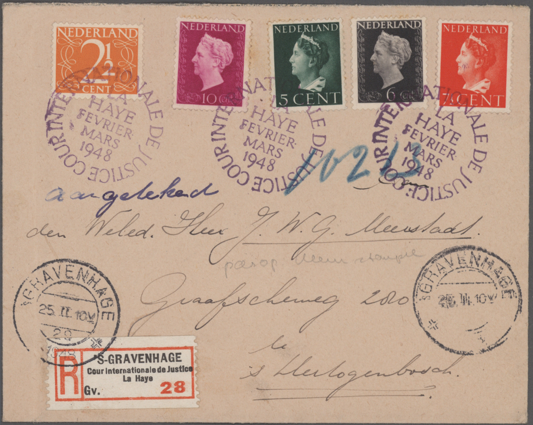 1948, COURT INTERNATIONALE DE JUSTICE LA HAYE FEVRIER MARS 1948, specialized collection of the purple colour date-less COMMEMORATIVE CANCEL commercially used on letters, registered mail, PTT service mail etc., all despatched "on service" from the International Court of Justice in The Hague (Den Haag) domestically and to addressees abroad (USA, Haiti). All hard to find. Contains also formal letter by PTT describing in Dutch language the terms and conditions of sale of Dutch C.I.J. service stamps (1947 issue, NVPH D20-D24), possibly unique.