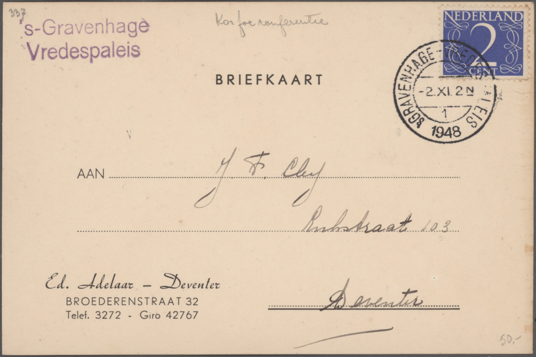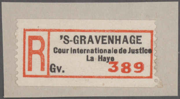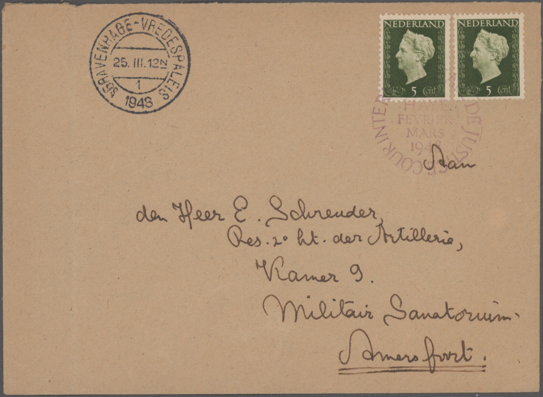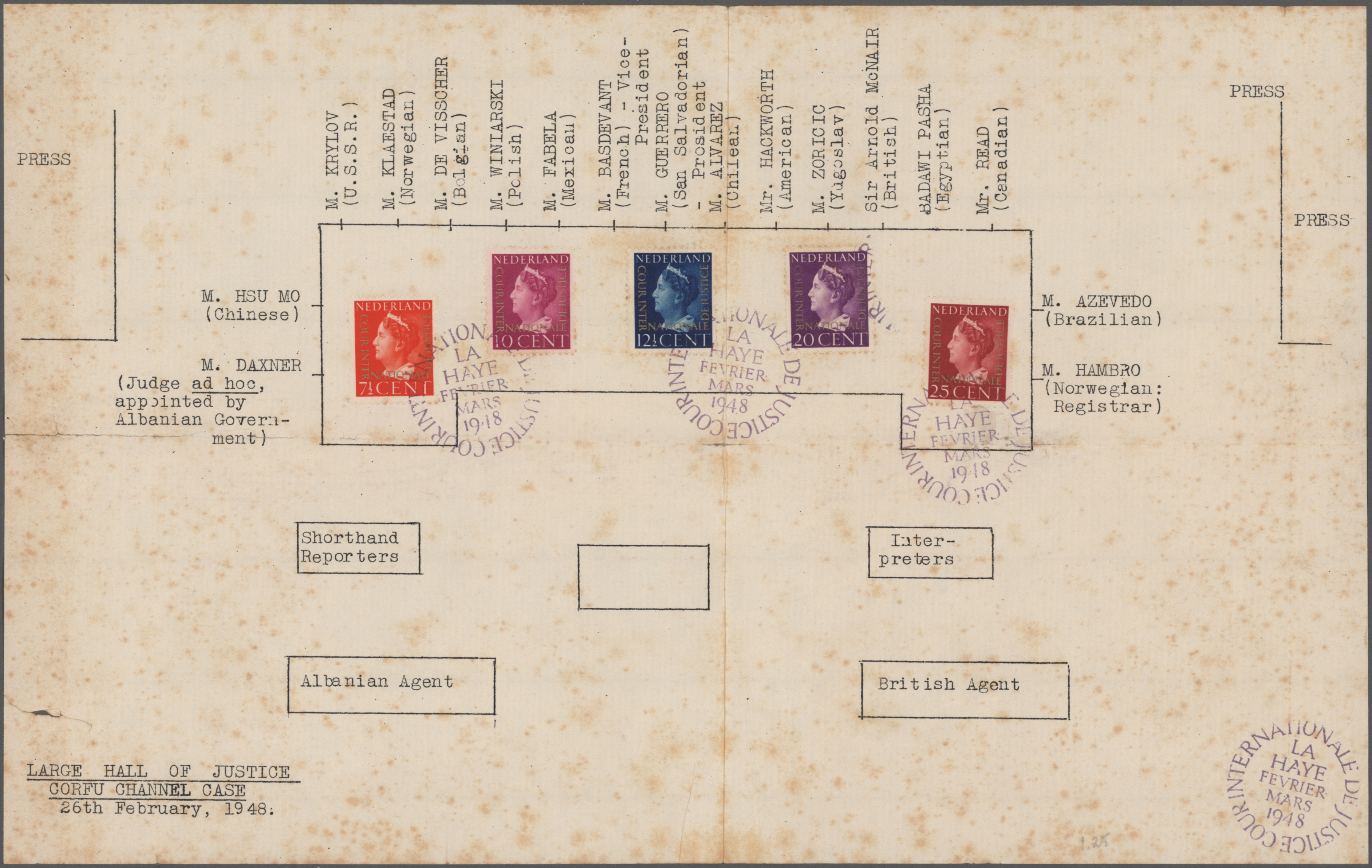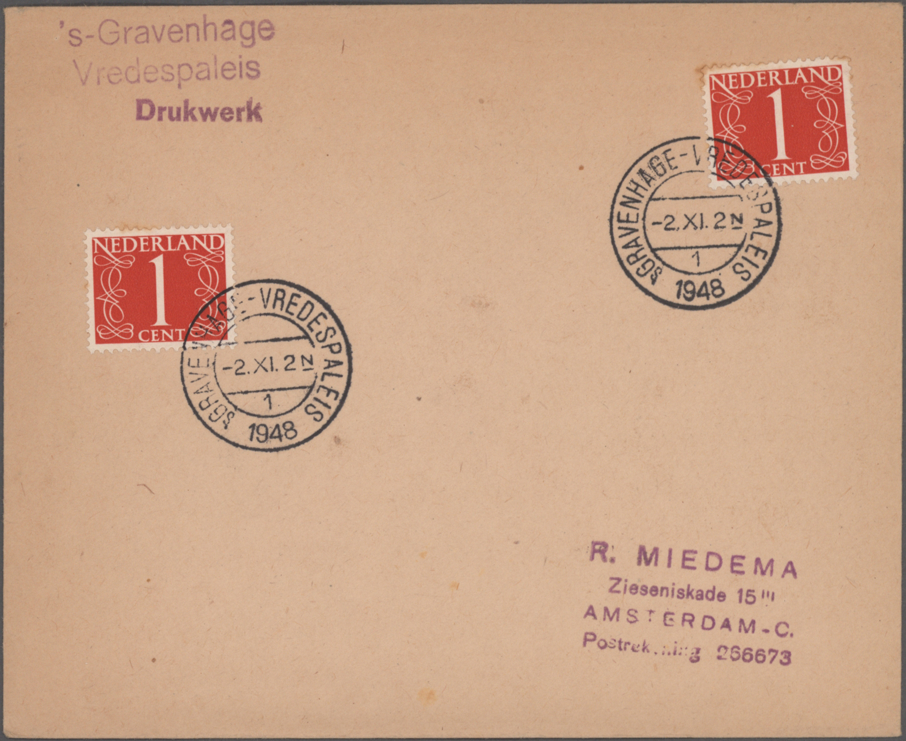 1948, COURT INTERNATIONALE DE JUSTICE LA HAYE FEVRIER MARS 1948, specialized collection of the purple colour date-less COMMEMORATIVE CANCEL commercially used on letters, registered mail, PTT service mail etc., all despatched "on service" from the International Court of Justice in The Hague (Den Haag) domestically and to addressees abroad (USA, Haiti). All hard to find. Contains also formal letter by PTT describing in Dutch language the terms and conditions of sale of Dutch C.I.J. service stamps (1947 issue, NVPH D20-D24), possibly unique.