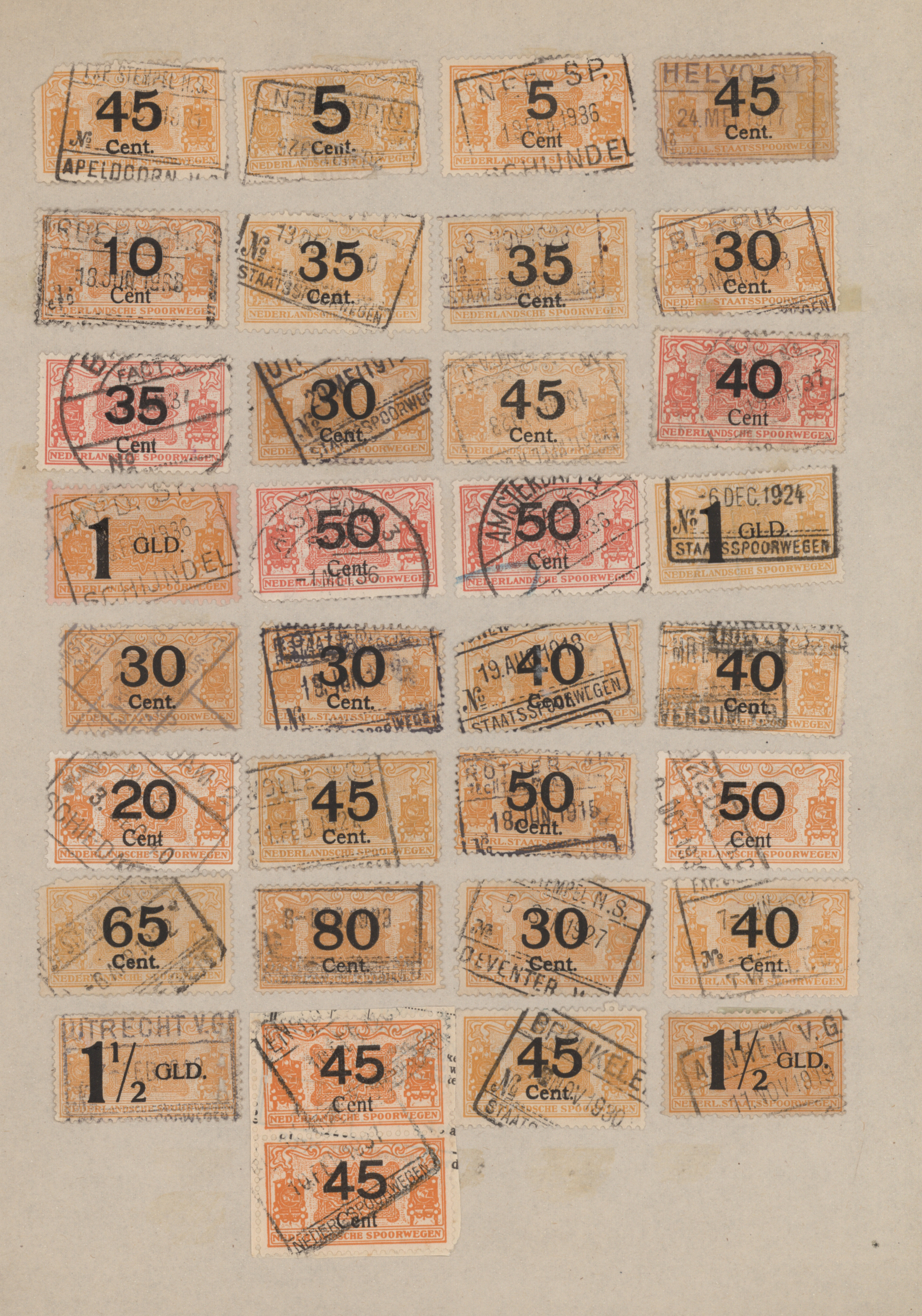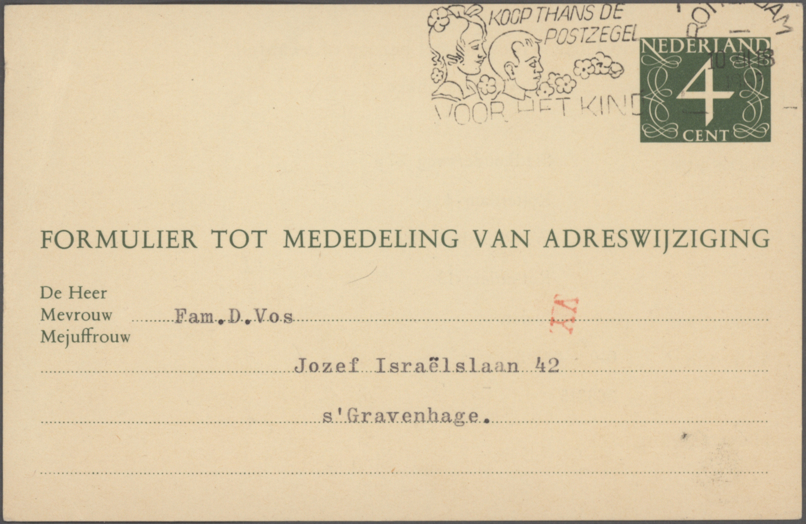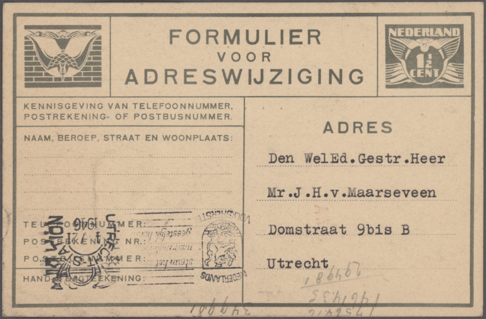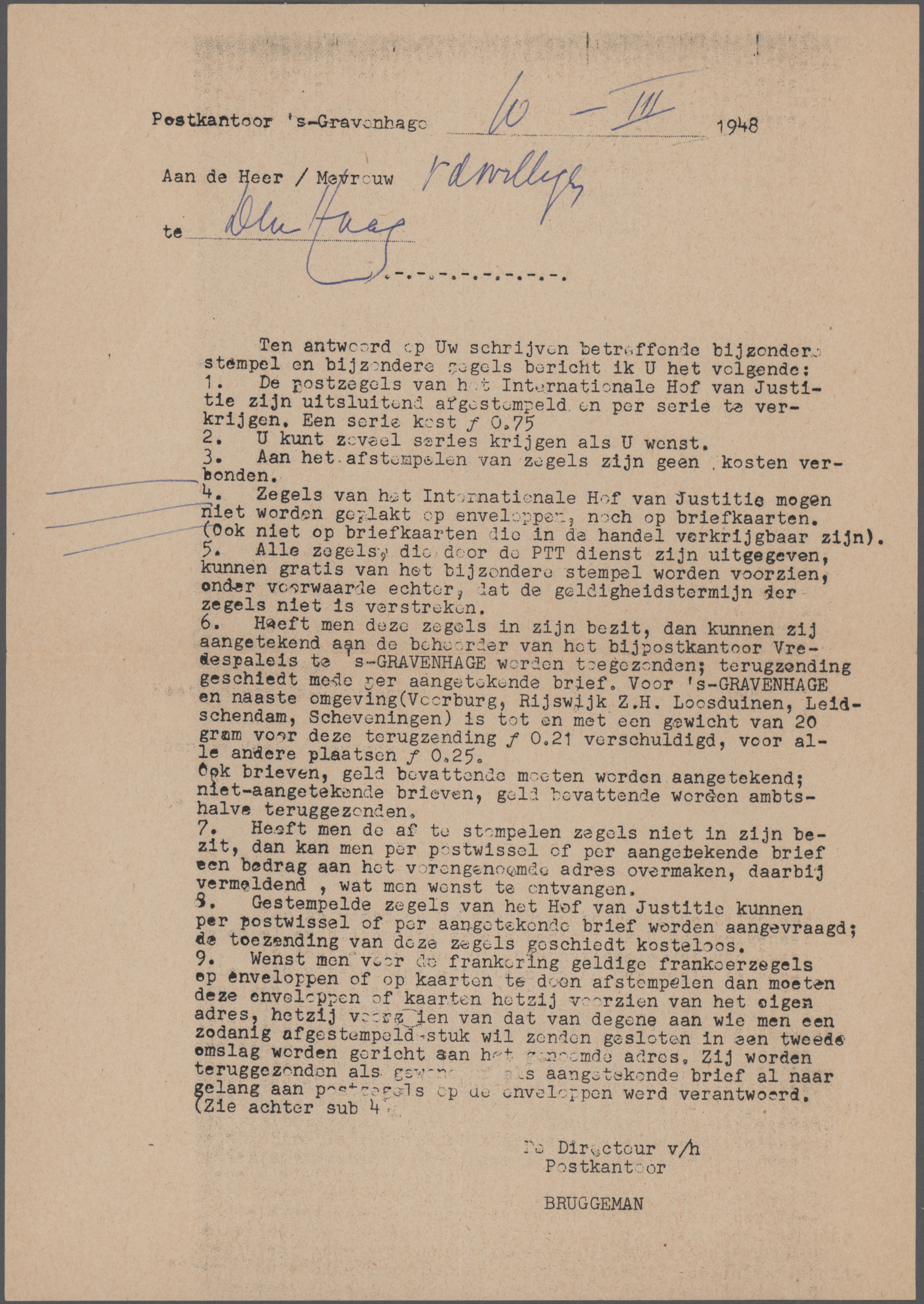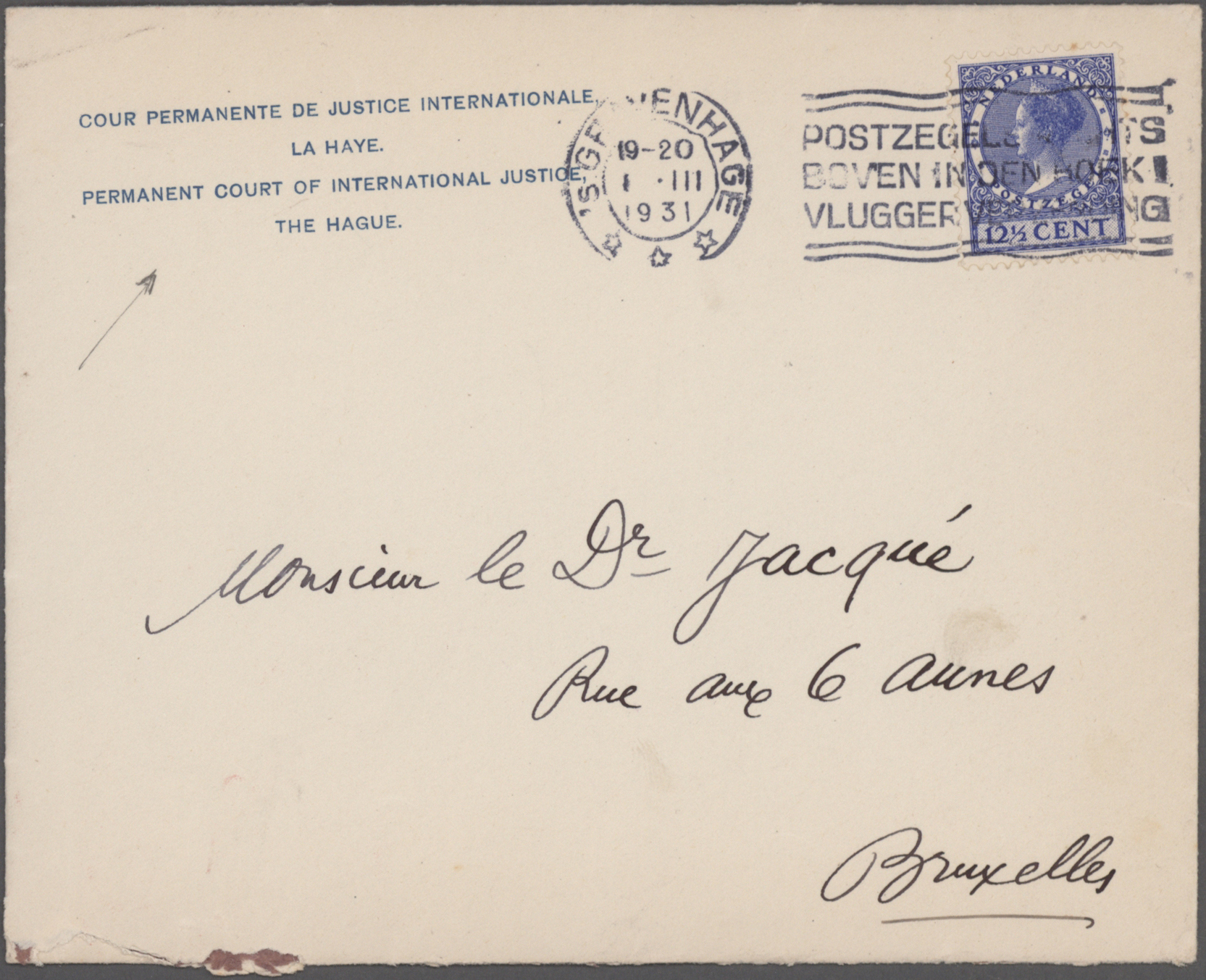 1948, COURT INTERNATIONALE DE JUSTICE LA HAYE FEVRIER MARS 1948, specialized collection of the purple colour date-less COMMEMORATIVE CANCEL commercially used on letters, registered mail, PTT service mail etc., all despatched "on service" from the International Court of Justice in The Hague (Den Haag) domestically and to addressees abroad (USA, Haiti). All hard to find. Contains also formal letter by PTT describing in Dutch language the terms and conditions of sale of Dutch C.I.J. service stamps (1947 issue, NVPH D20-D24), possibly unique.
