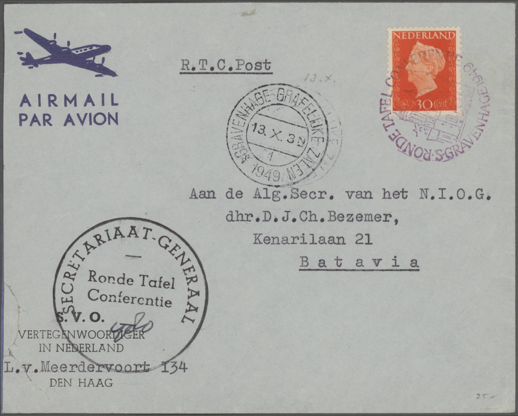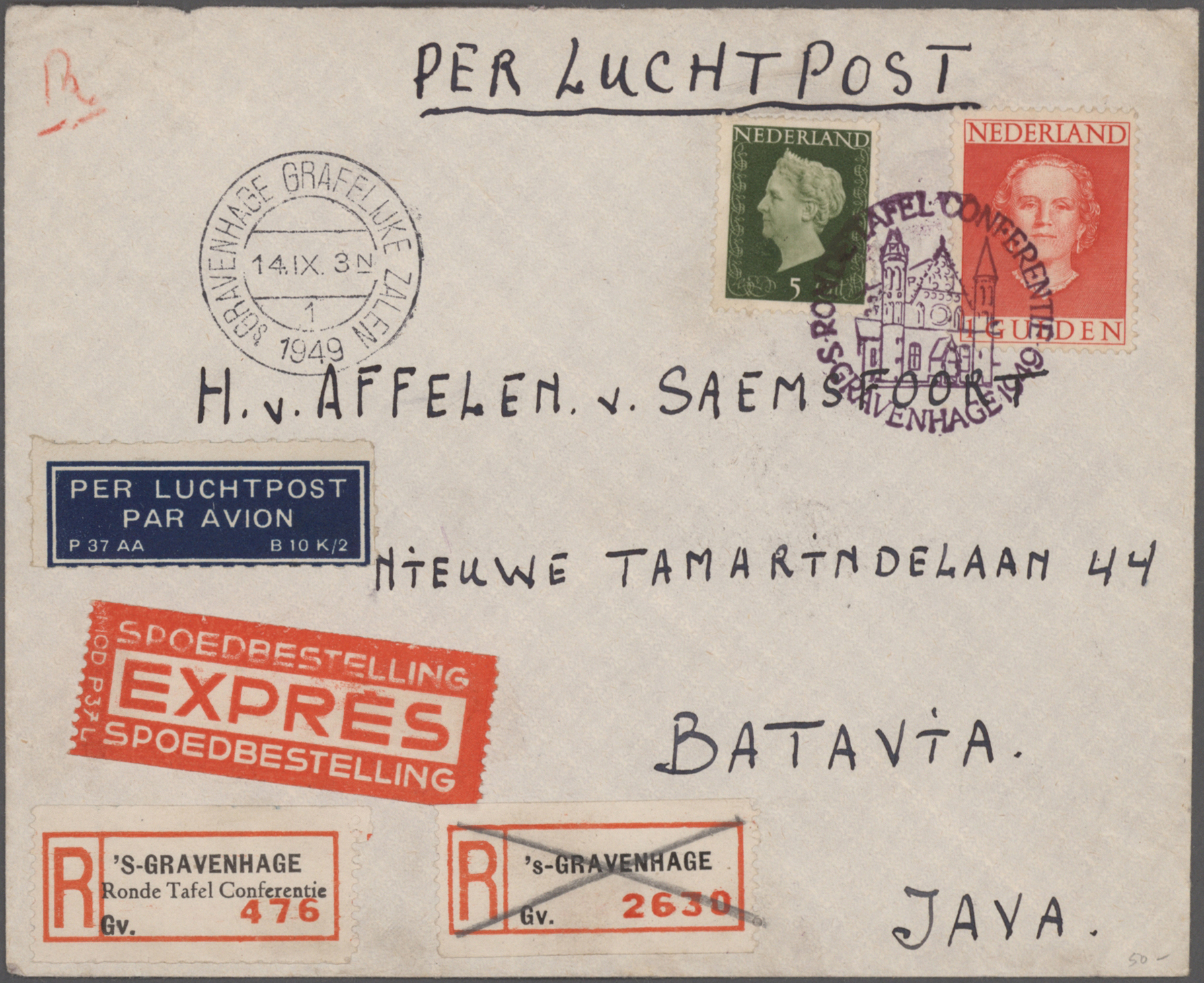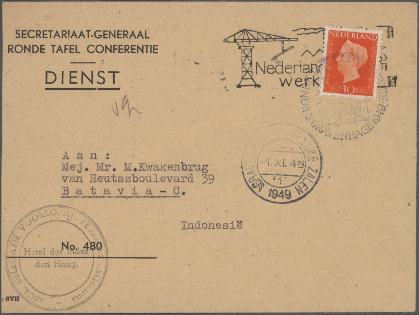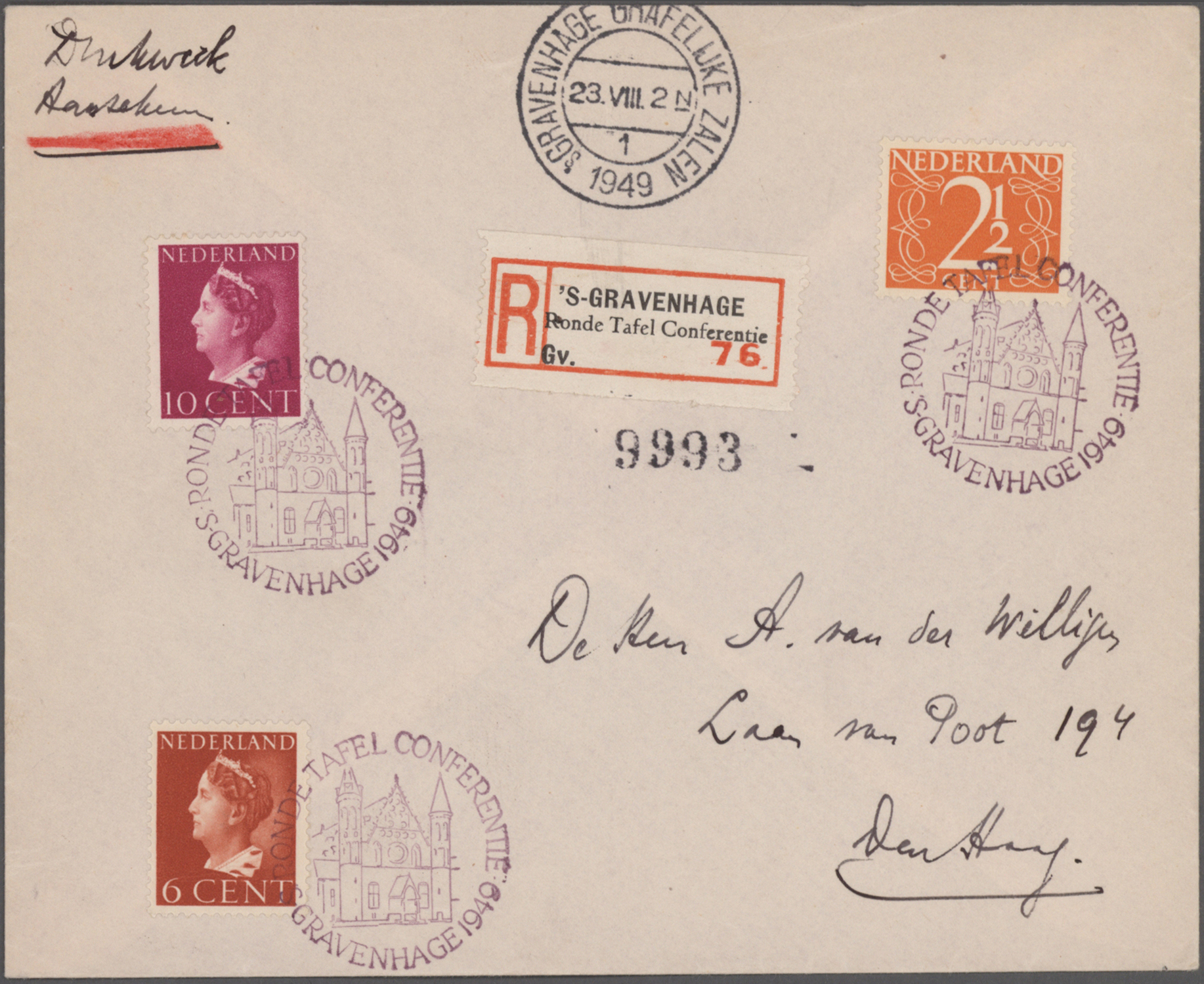 1949, RONDE TAFEL CONFERENTIE COURT INTERNATIONALE / 's-GRAVENHAGE GRAVELIJKE ZALEN, small specialized balance of the purple colour date-less COMMEMORATIVE CANCEL on the occasion of the ROUND TABLE negotiations for Indonesian independence, througout commercially used on letters, registered mail, PTT service mail etc., all despatched "on service" from The Hague (Den Haag) domestically and to addressees abroad (such as registered express air mail to Batavia/Jakarta). All items hard to find. Also some registered mail 1960 from Moluccas refugees housed in Camp Vught.