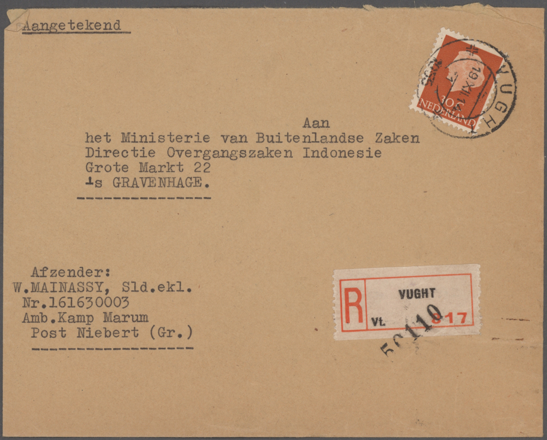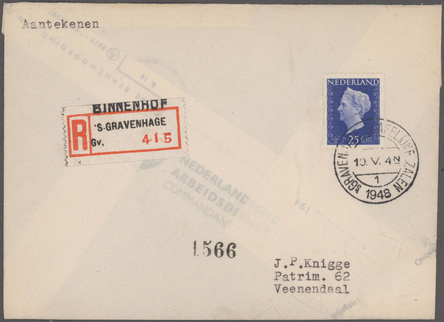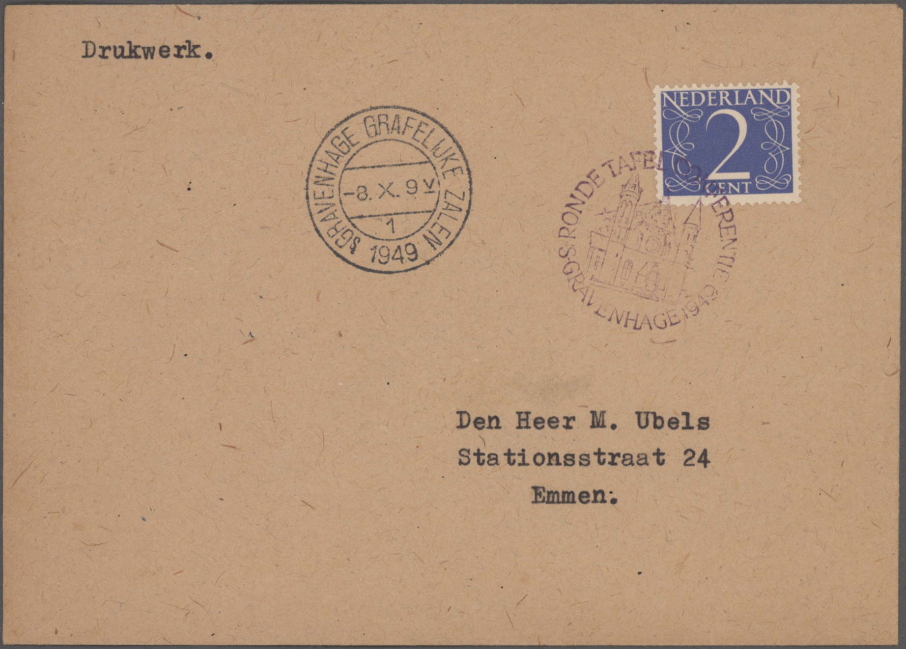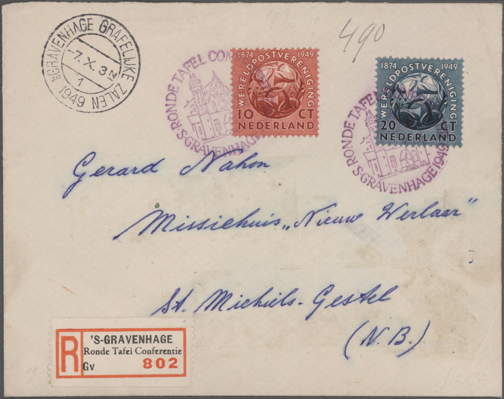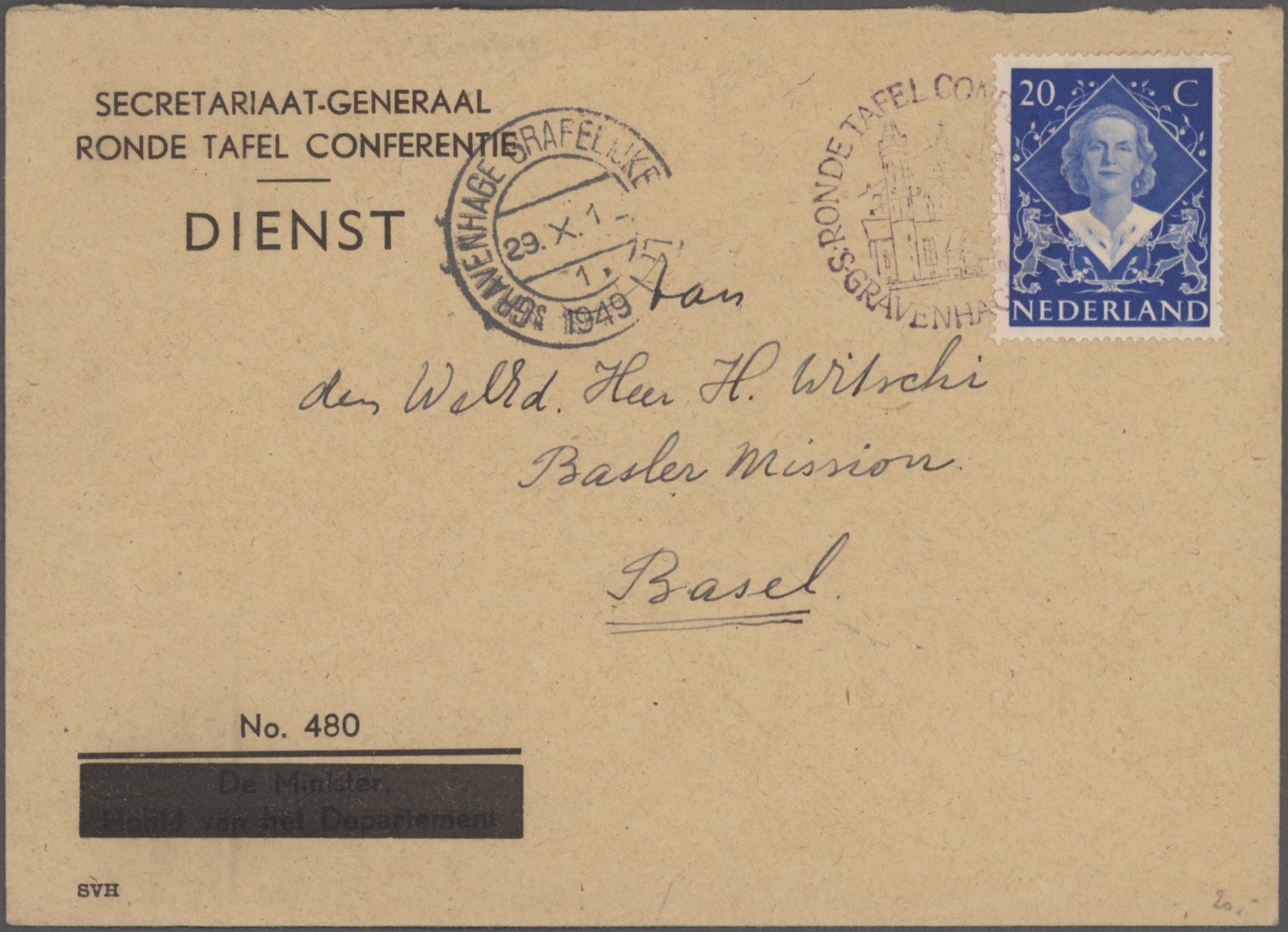 1949, RONDE TAFEL CONFERENTIE COURT INTERNATIONALE / 's-GRAVENHAGE GRAVELIJKE ZALEN, small specialized balance of the purple colour date-less COMMEMORATIVE CANCEL on the occasion of the ROUND TABLE negotiations for Indonesian independence, througout commercially used on letters, registered mail, PTT service mail etc., all despatched "on service" from The Hague (Den Haag) domestically and to addressees abroad (such as registered express air mail to Batavia/Jakarta). All items hard to find. Also some registered mail 1960 from Moluccas refugees housed in Camp Vught.