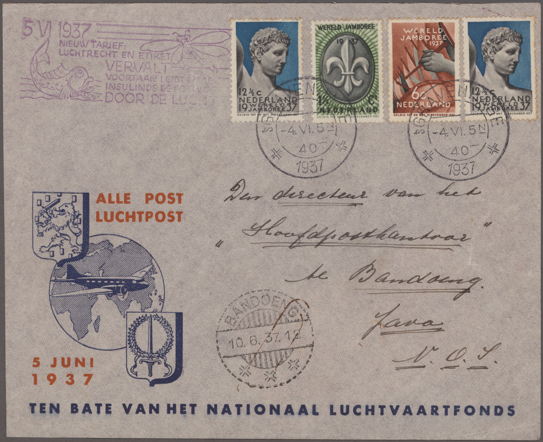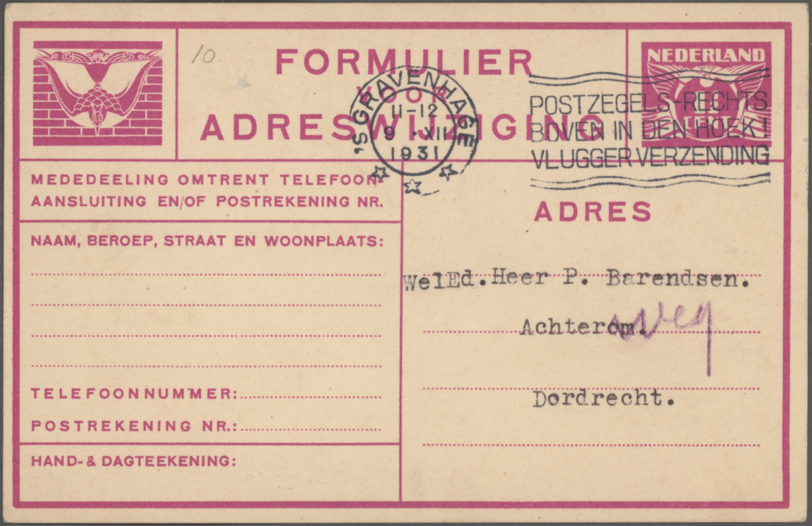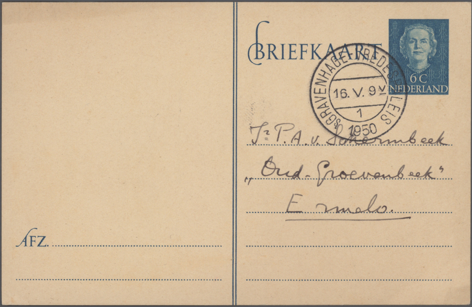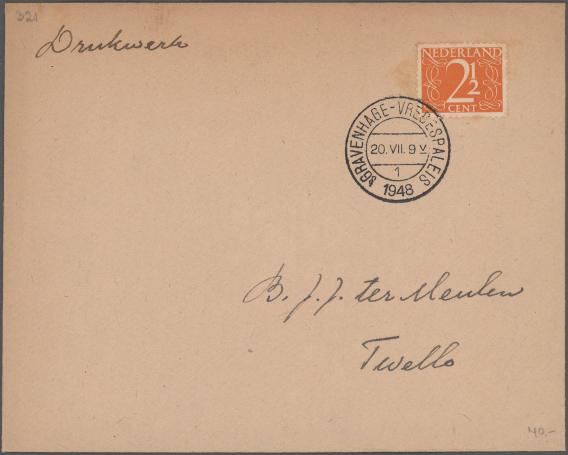 1949, RONDE TAFEL CONFERENTIE COURT INTERNATIONALE / 's-GRAVENHAGE GRAVELIJKE ZALEN, small specialized balance of the purple colour date-less COMMEMORATIVE CANCEL on the occasion of the ROUND TABLE negotiations for Indonesian independence, througout commercially used on letters, registered mail, PTT service mail etc., all despatched "on service" from The Hague (Den Haag) domestically and to addressees abroad (such as registered express air mail to Batavia/Jakarta). All items hard to find. Also some registered mail 1960 from Moluccas refugees housed in Camp Vught.