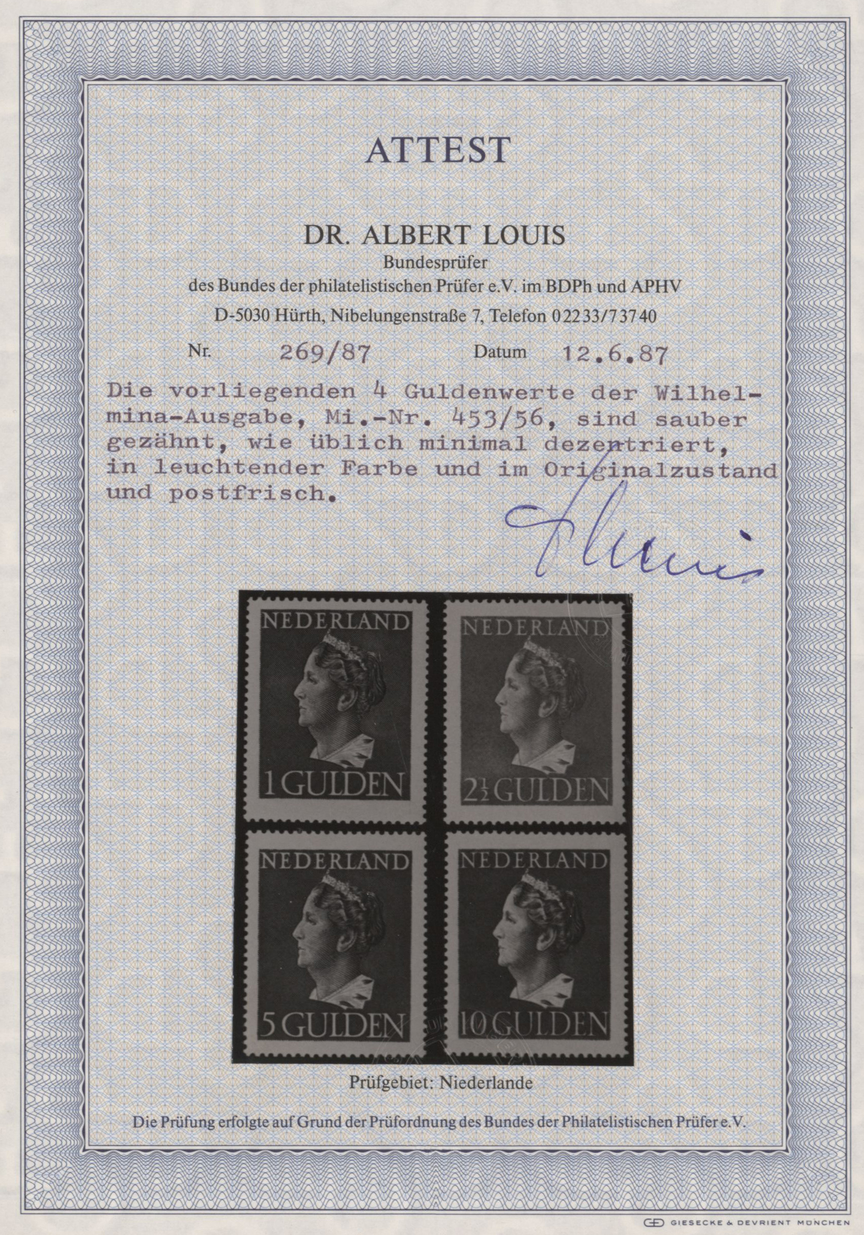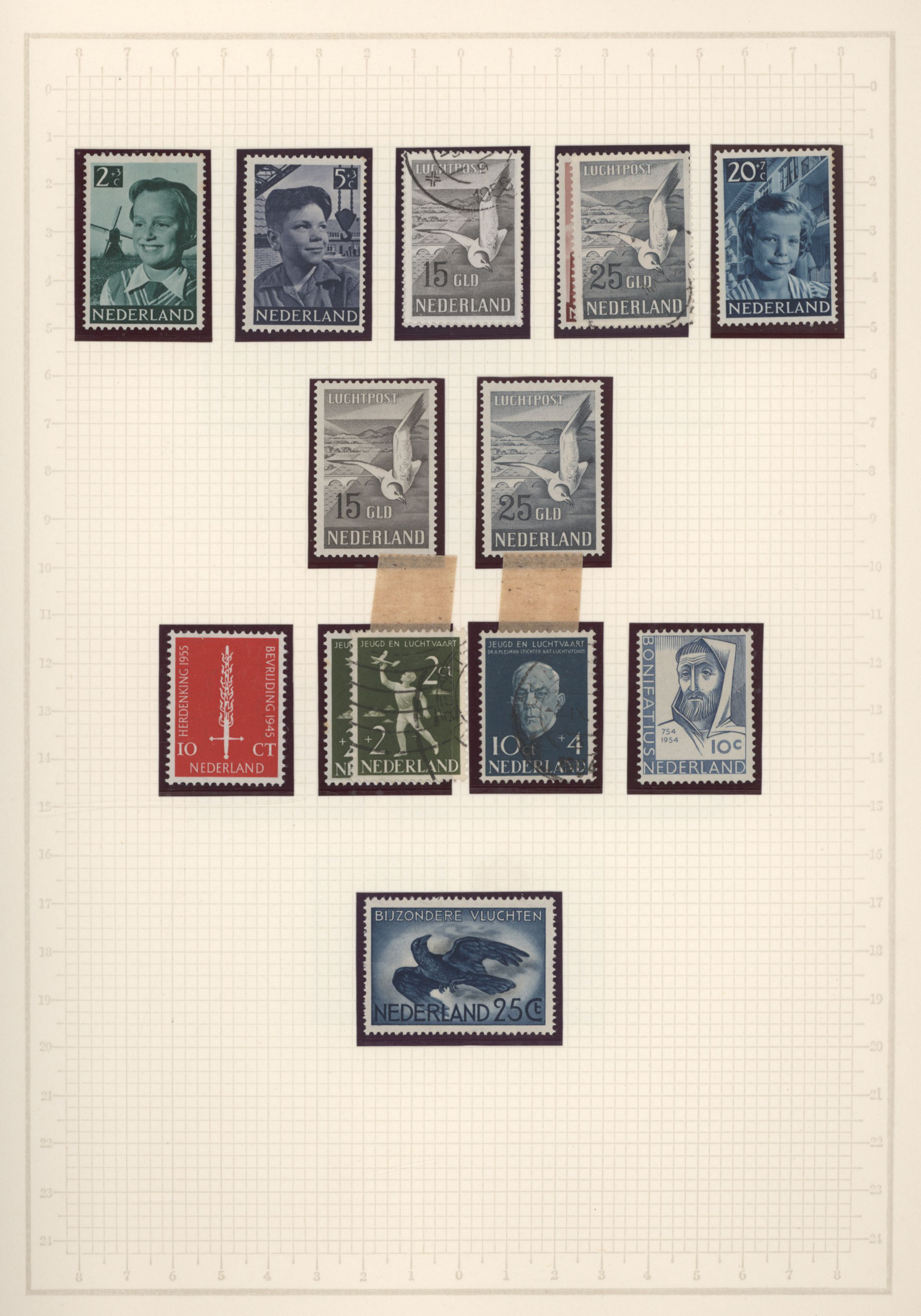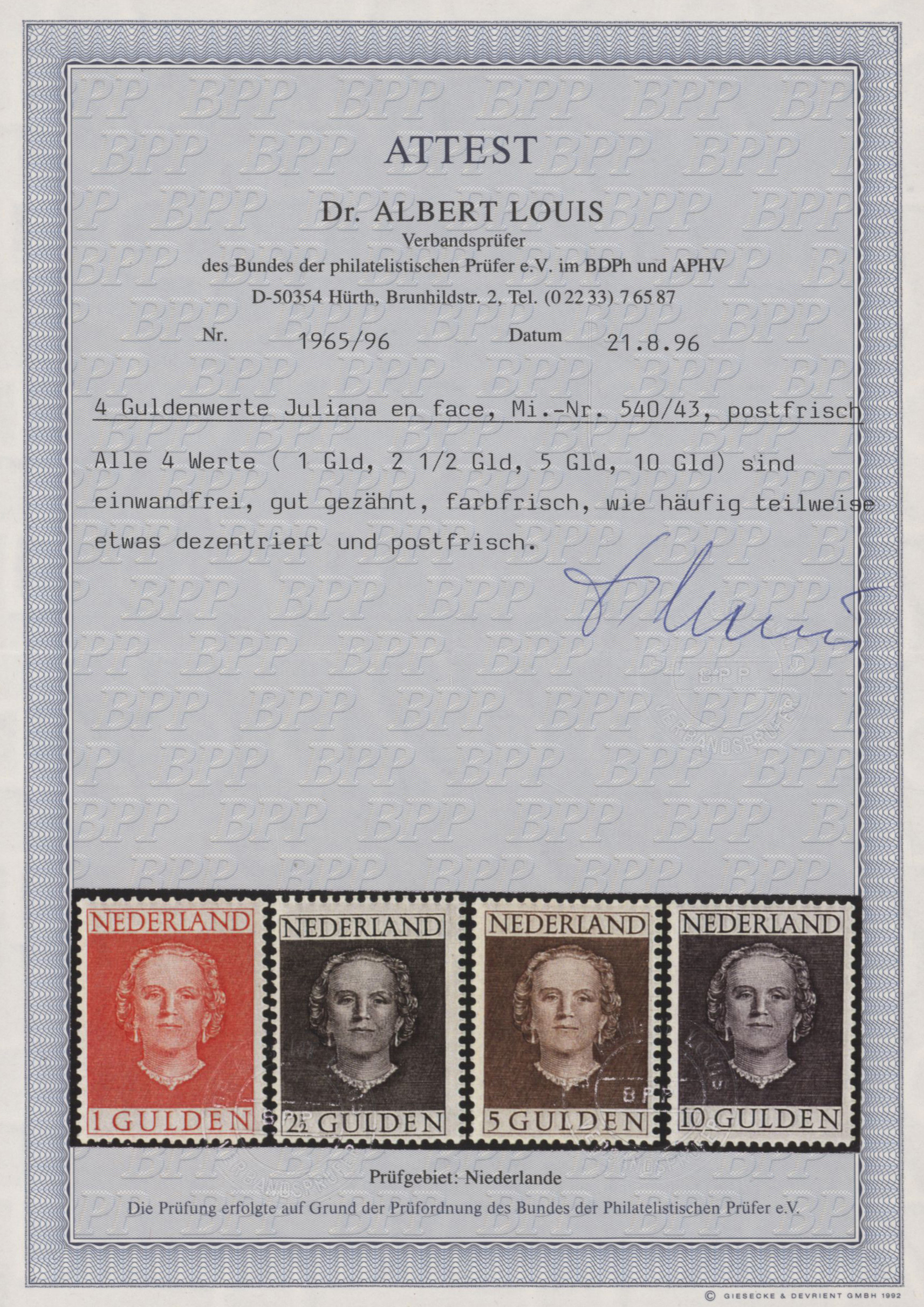 1945-2000, nice collection in mint never hinged condition on album pages including high values 1-10 hfl Wilhelmina definitives, 15 and 25 hfl Air Mails and 1-10 hfl Juliana definitives, all in perfect MNH state accompanied with certificates by BPP expert Dr. Albert Louis (1987, 1996). Also containing miniature sheets, se-tenants and stamps booklets (some portion of which however in CTO condition).