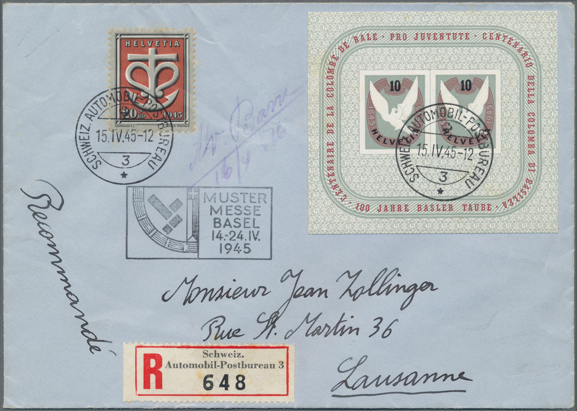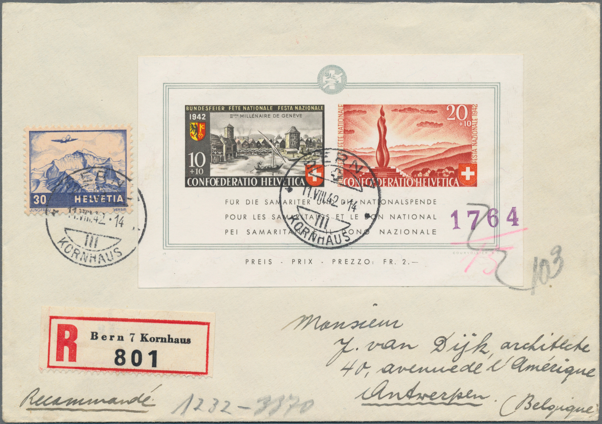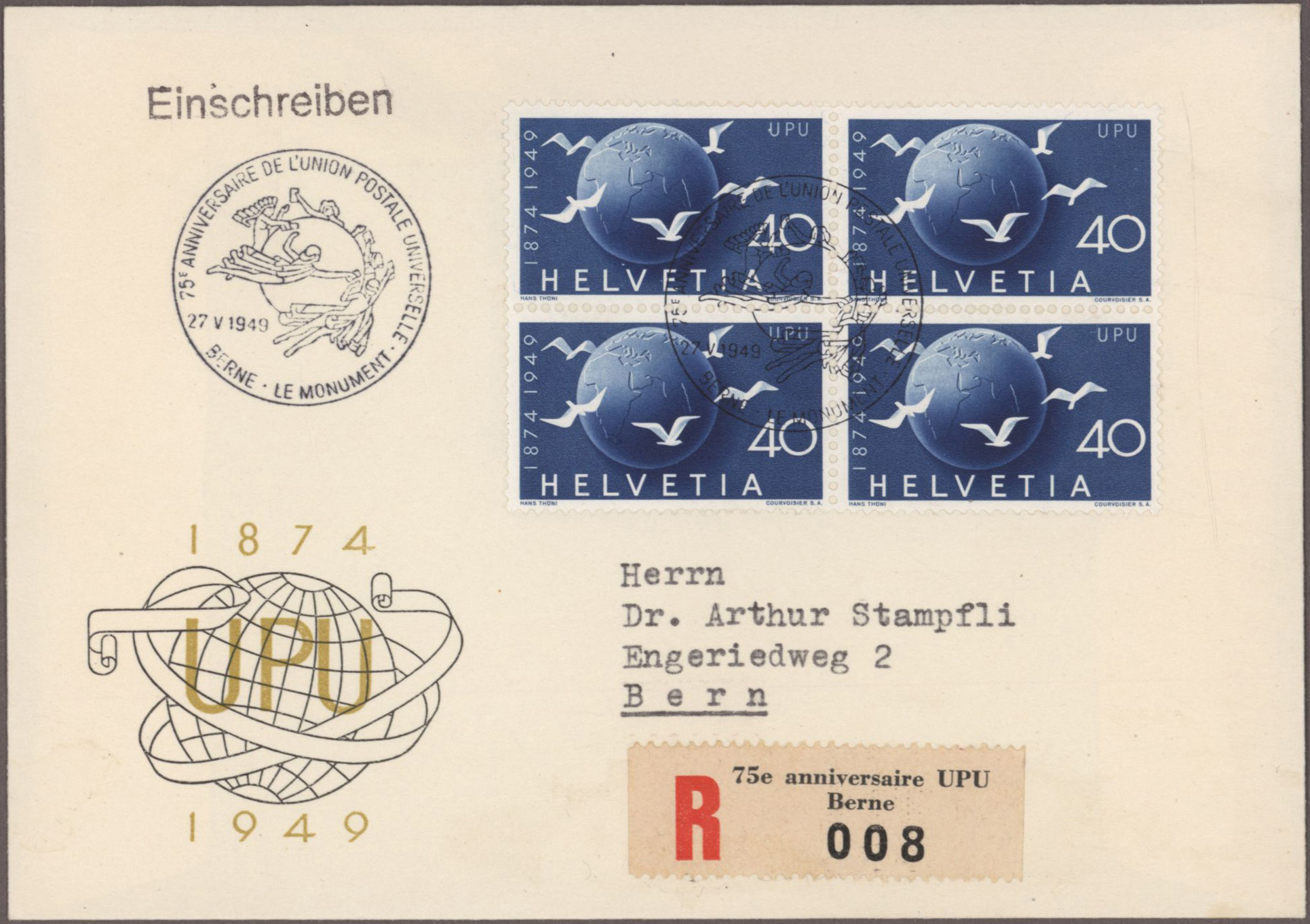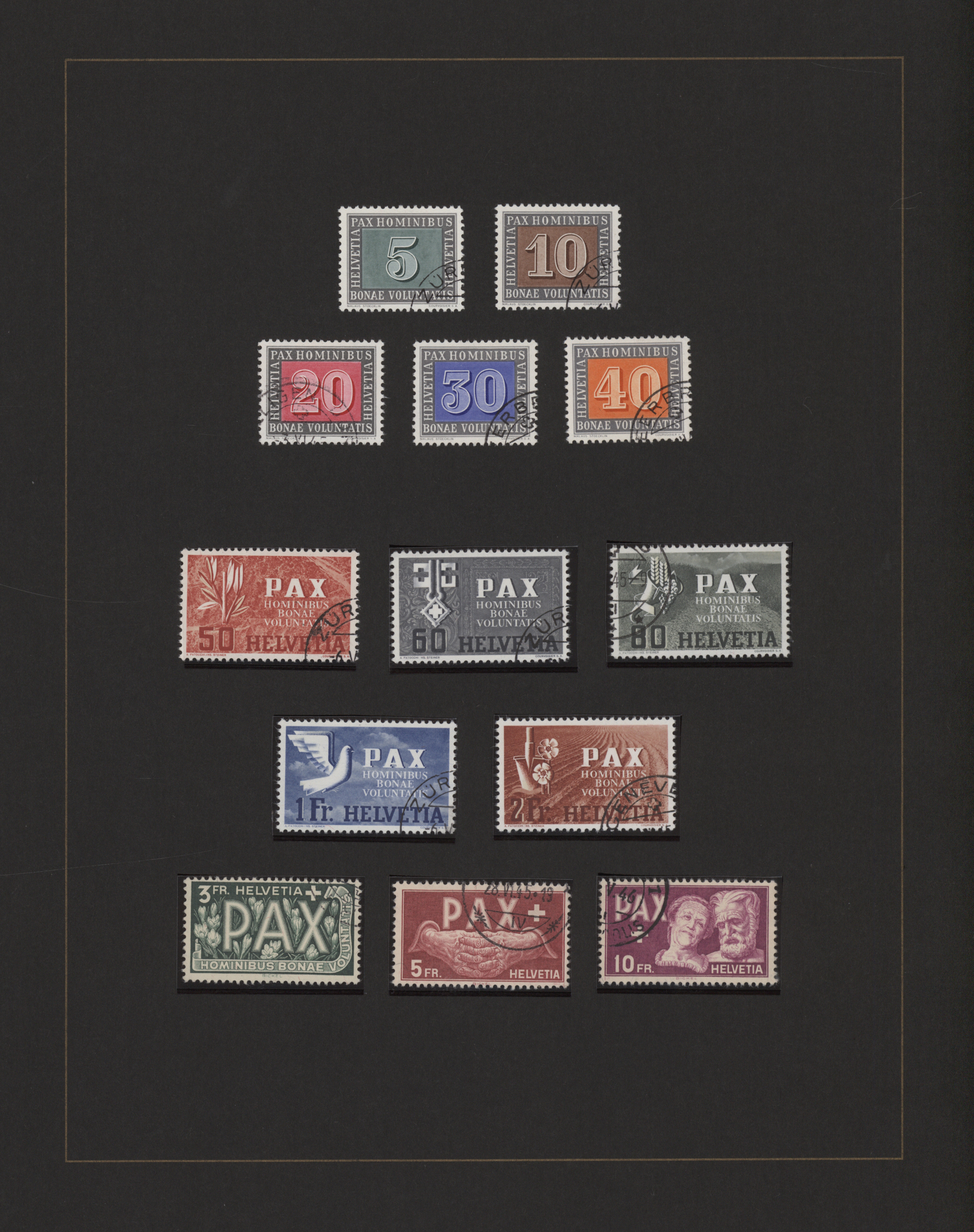 mit Kordel zum 12. UPU-Kongreß Paris mit eingeklebten Marken ex 1939-1945, dabei u.a. Block 8, 10-12 und PAX-Serie, vorne mit hs. Widmung "To the Honorable E.L. Cullen, Minister of Agriculture with compliments from .... Consul of Switzerland
