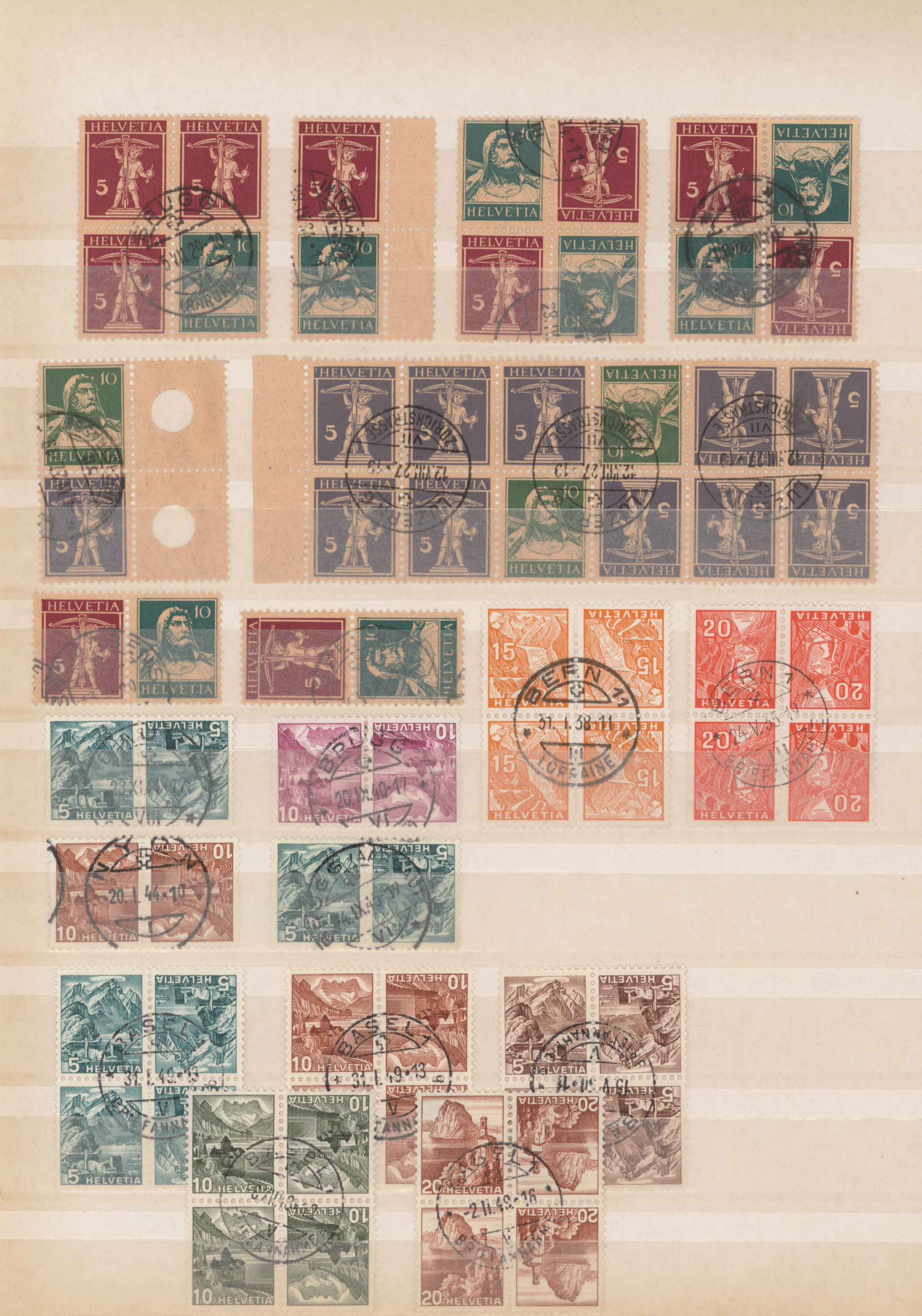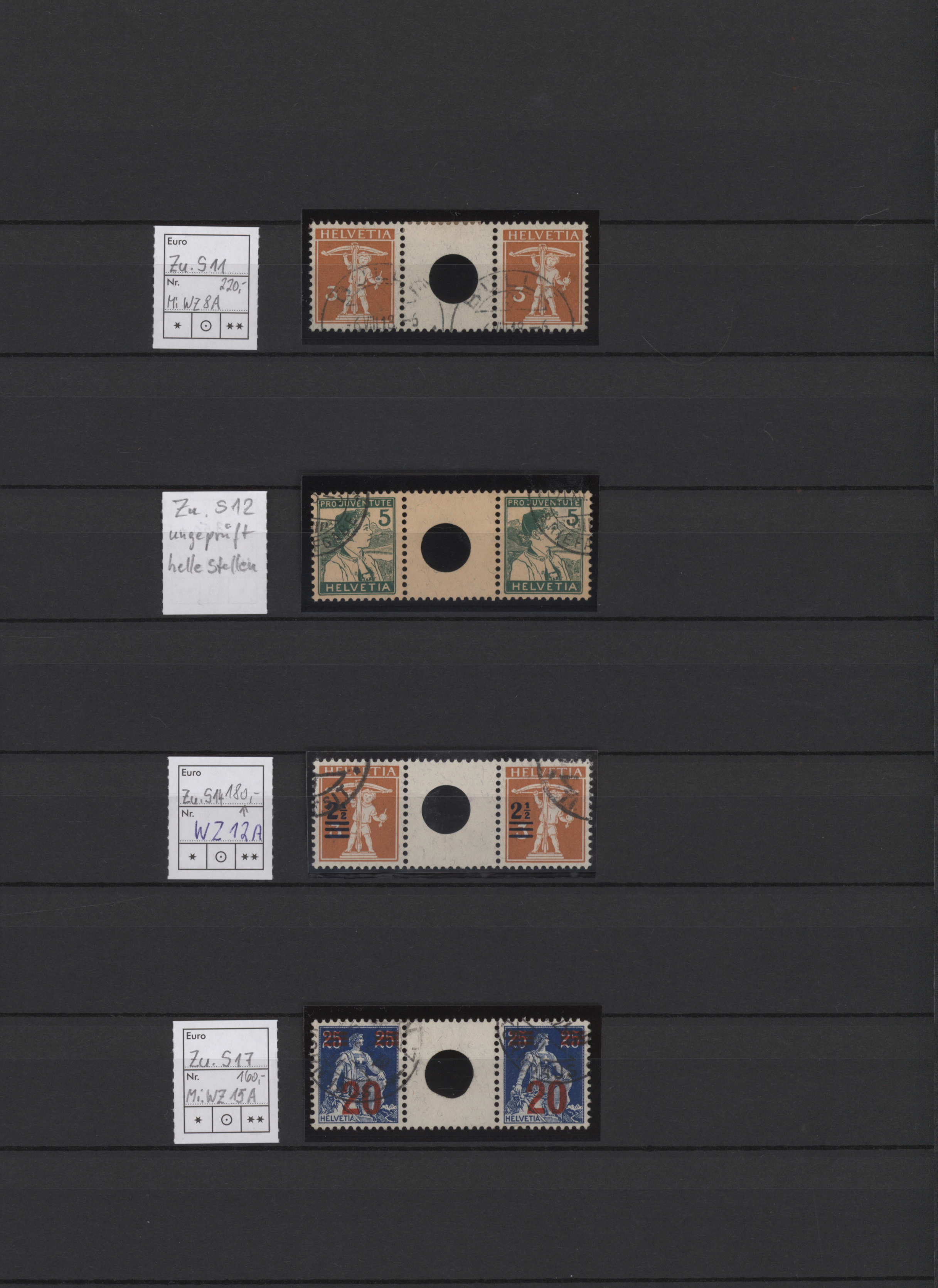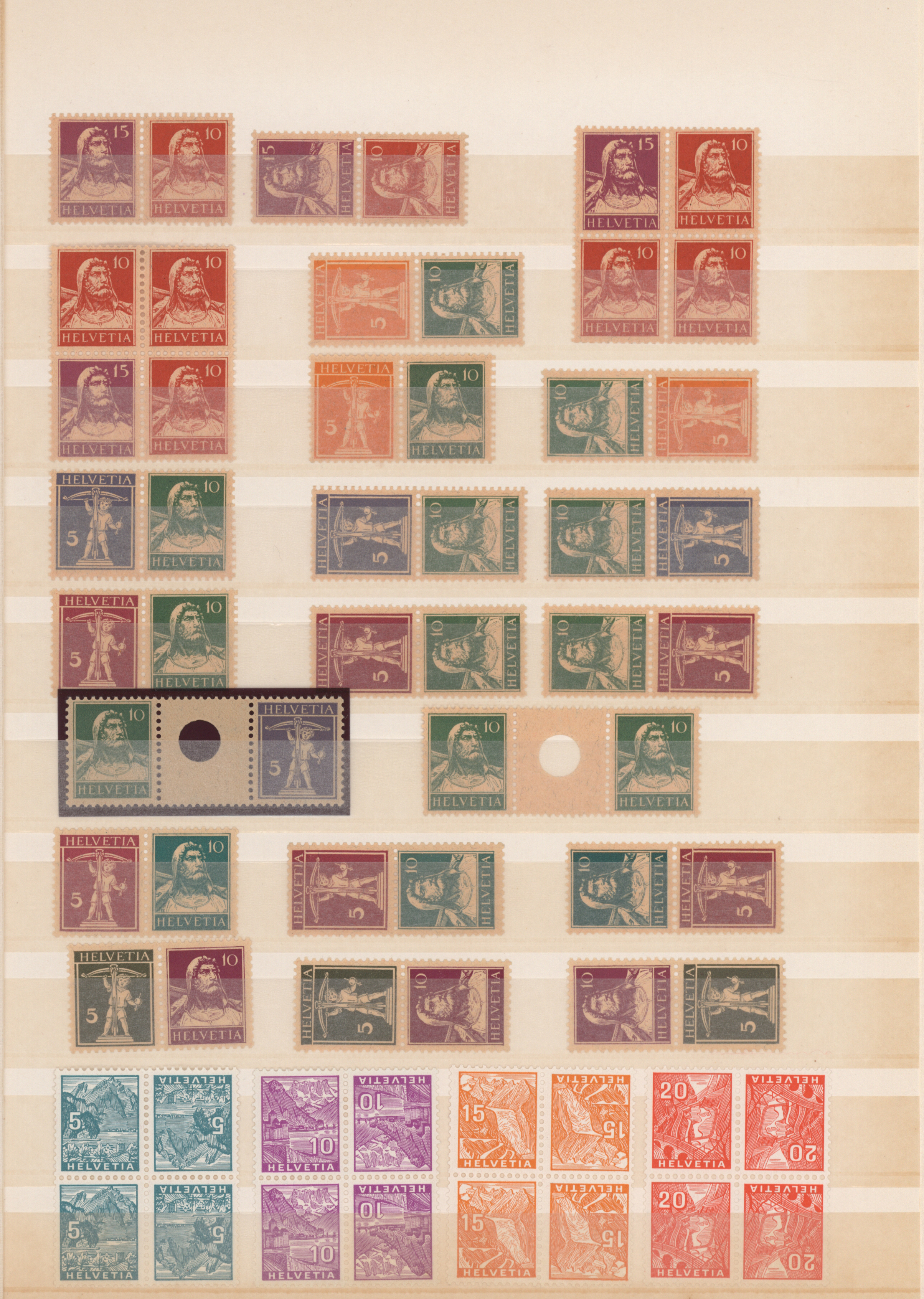 ungeprüft sind, so z.B. Zwischenstegpaare mit großer Lochung der Pro Juventute 1915 5 Rp. (unberechnet) und der Tell-Marke zu 10 Rp. grün, sonst viele mittlere Werte (u.a. auf geriffeltem Papier), auch Einheiten, Briefstücke und ein Brief.