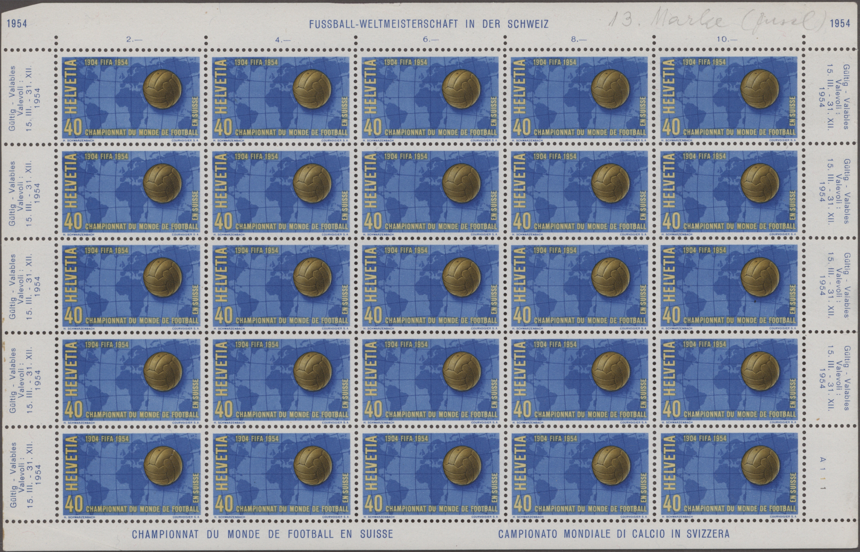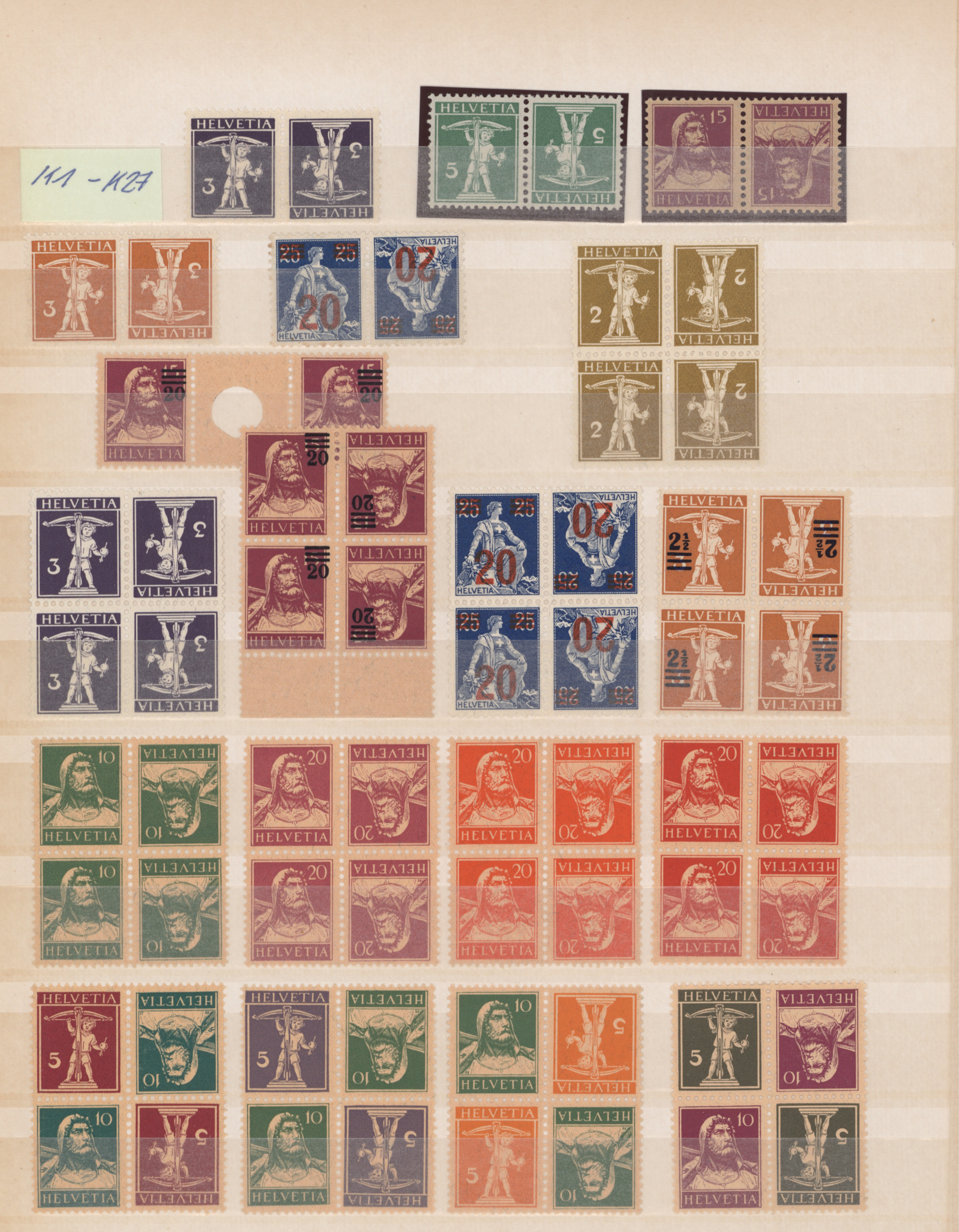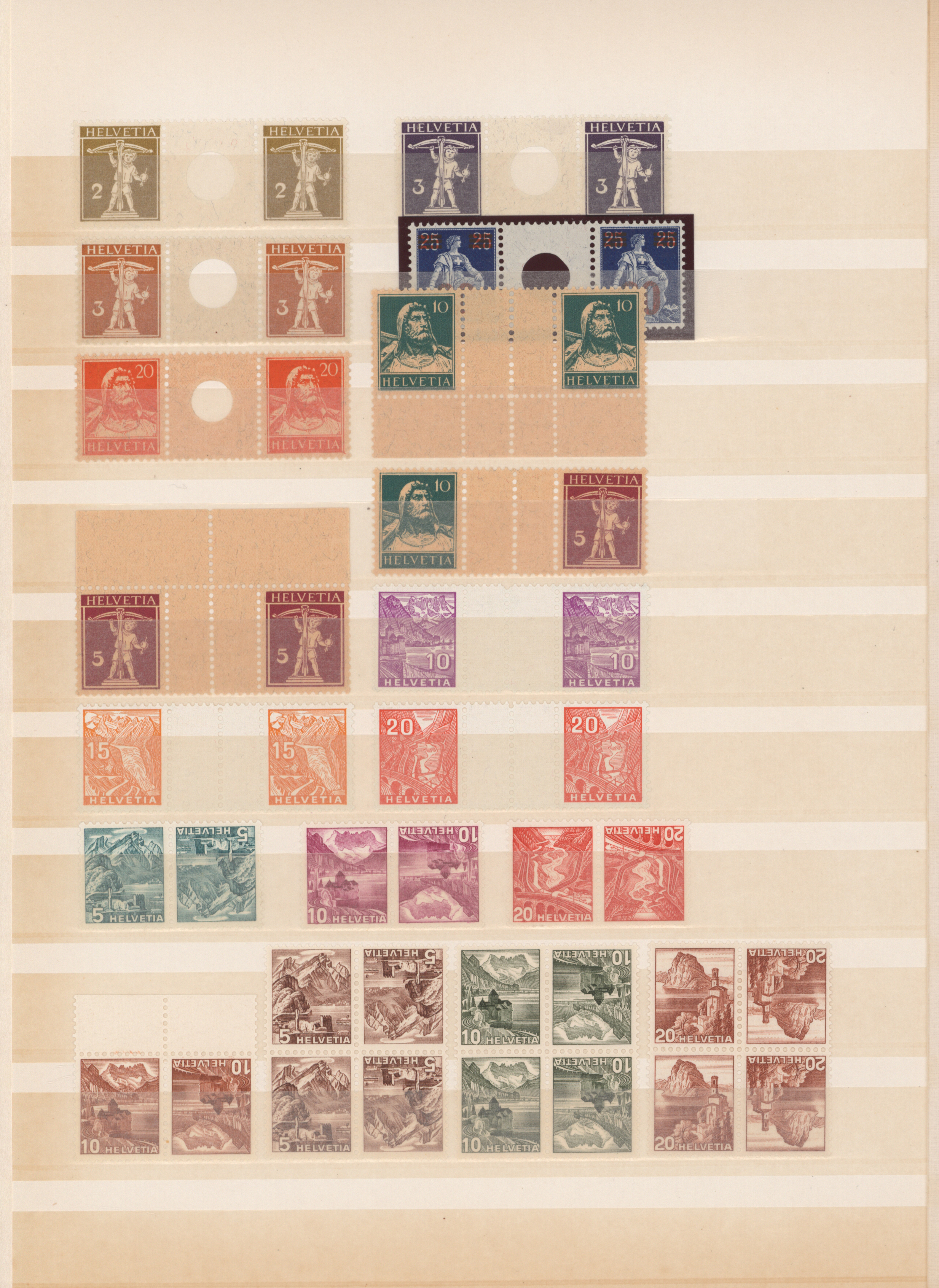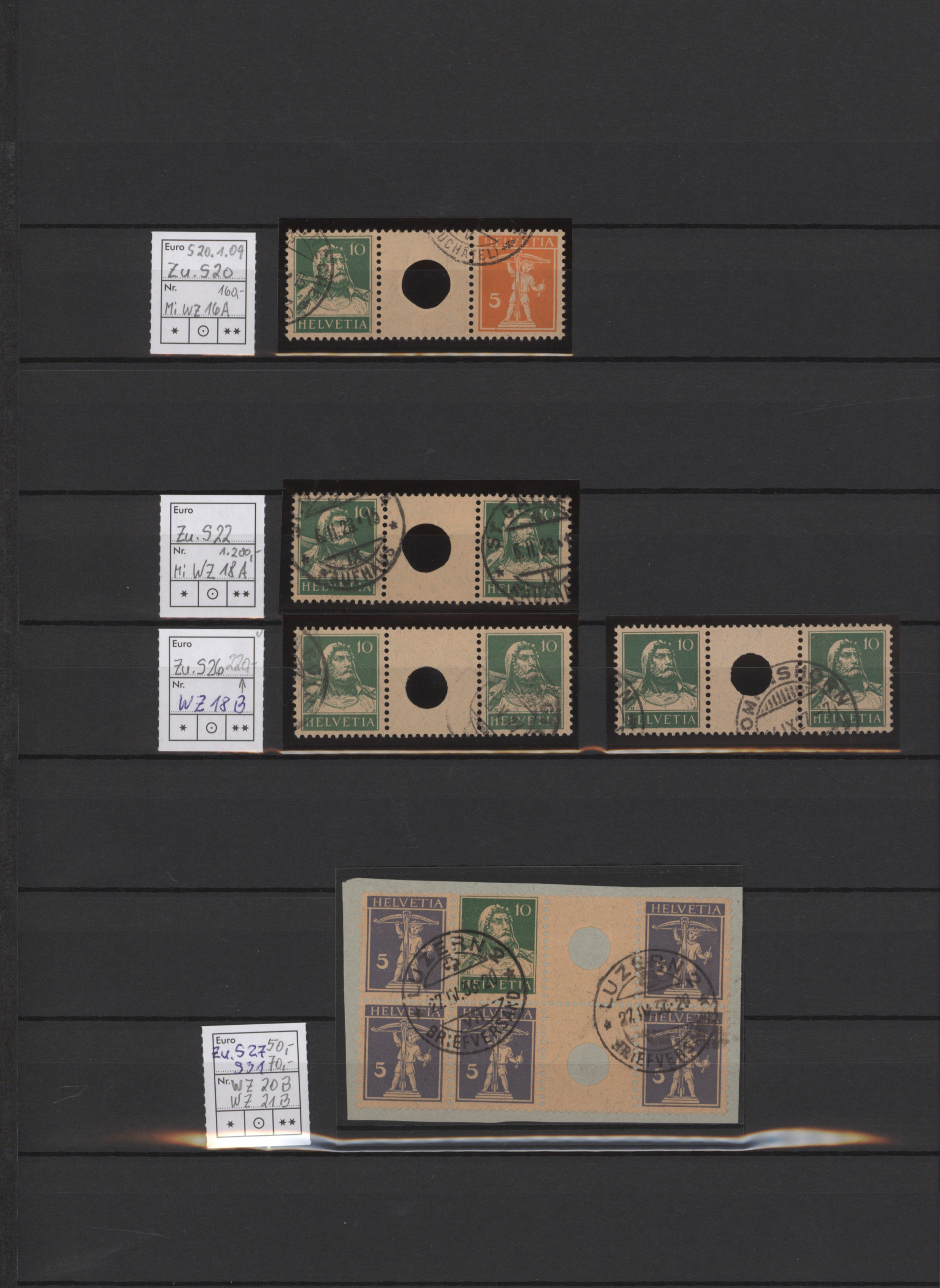 ungeprüft sind, so z.B. Zwischenstegpaare mit großer Lochung der Pro Juventute 1915 5 Rp. (unberechnet) und der Tell-Marke zu 10 Rp. grün, sonst viele mittlere Werte (u.a. auf geriffeltem Papier), auch Einheiten, Briefstücke und ein Brief.