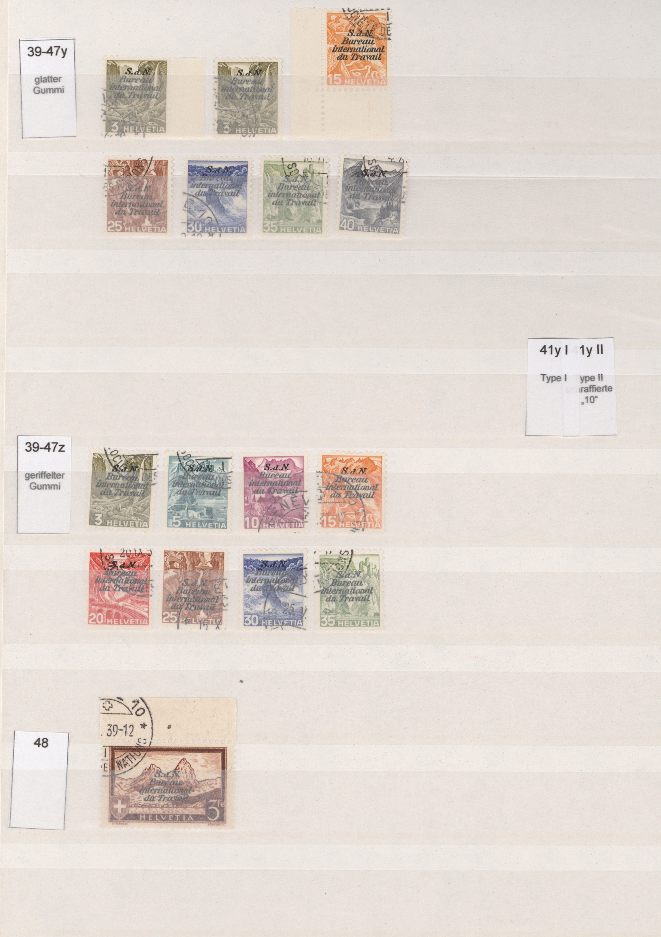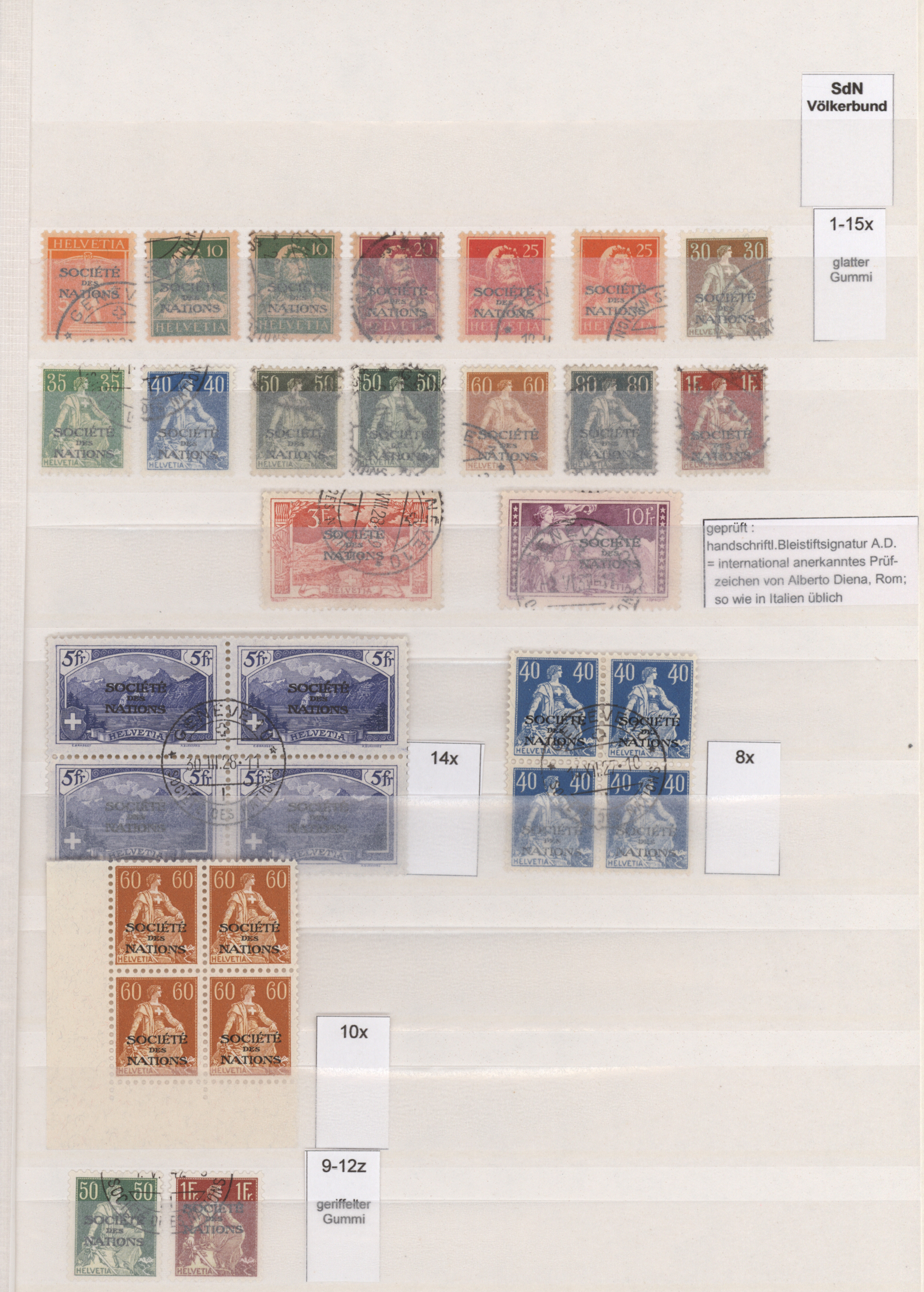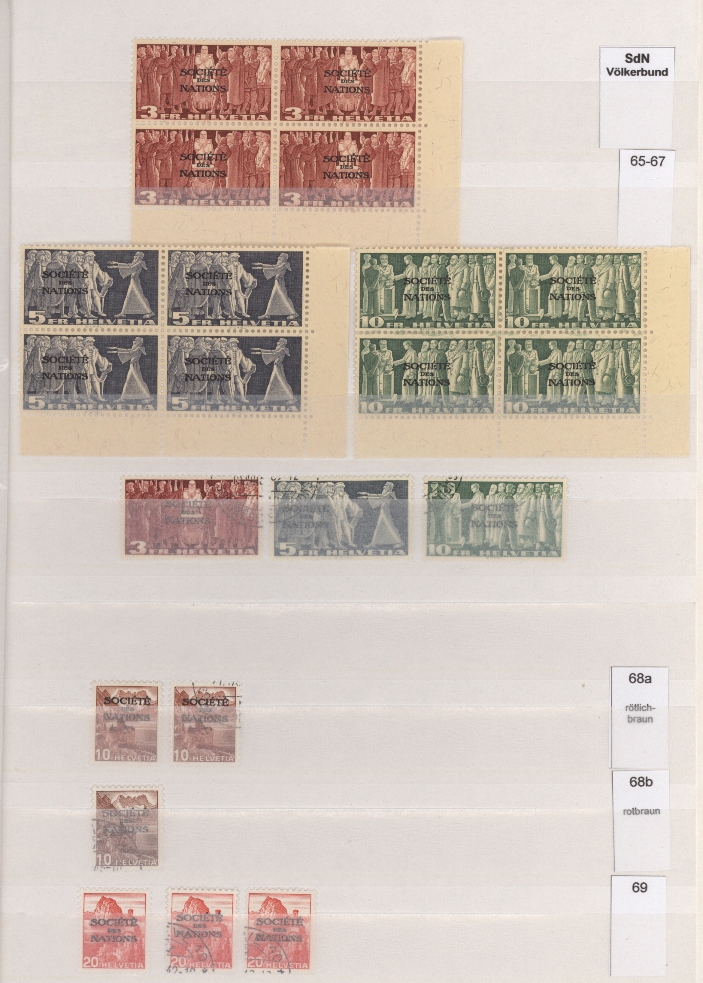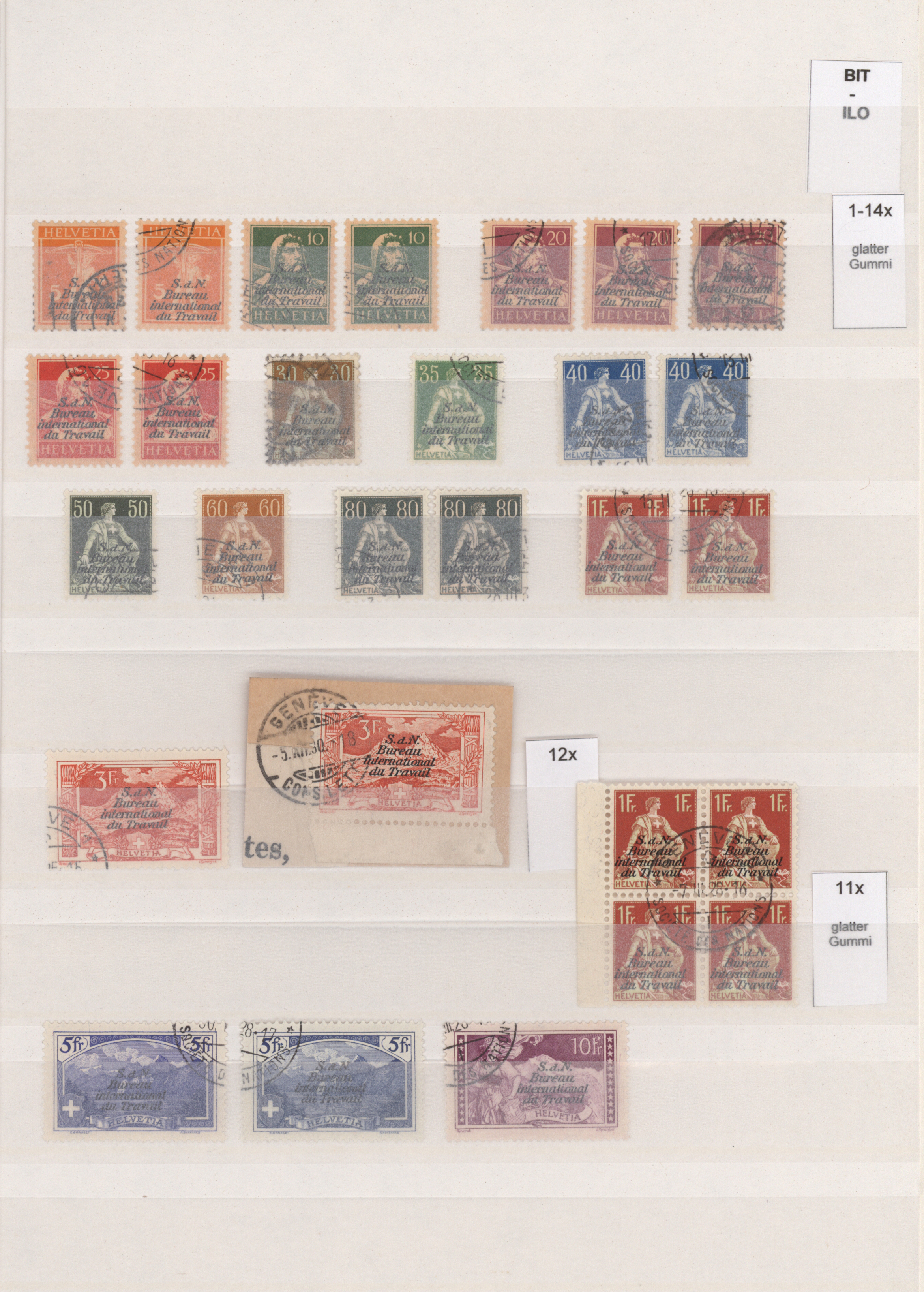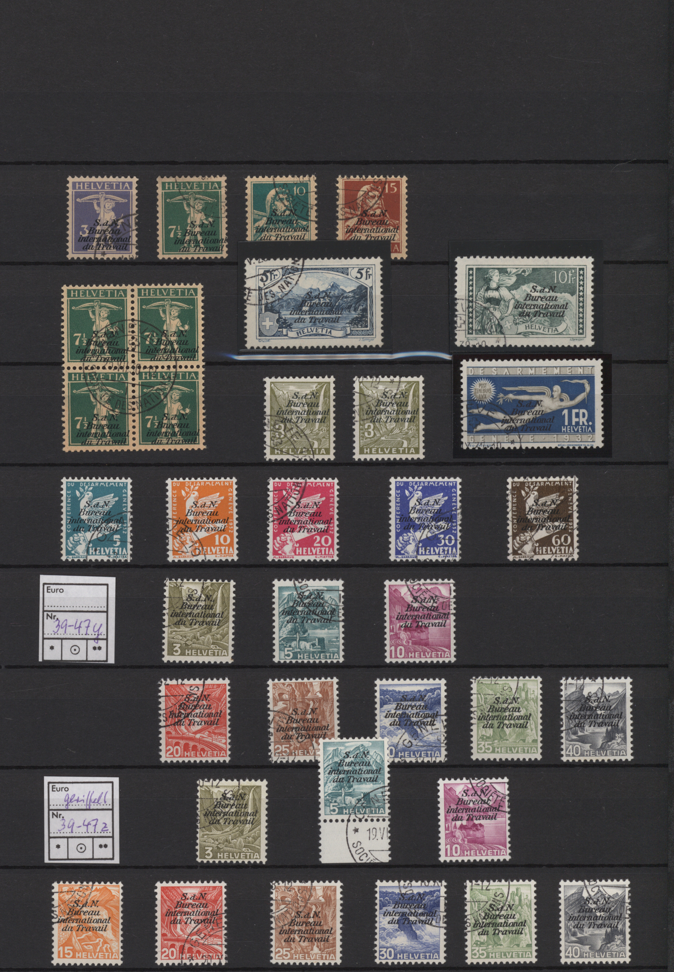 1921-1953, VÖLKERBUND / SDN / BIT, Partie schweizer Dauermarken "Helvetia" und "Wilhelm Tell" mit Dienstmarken-Aufdruck SOCIÉTÉ DES NATIONS, dazu