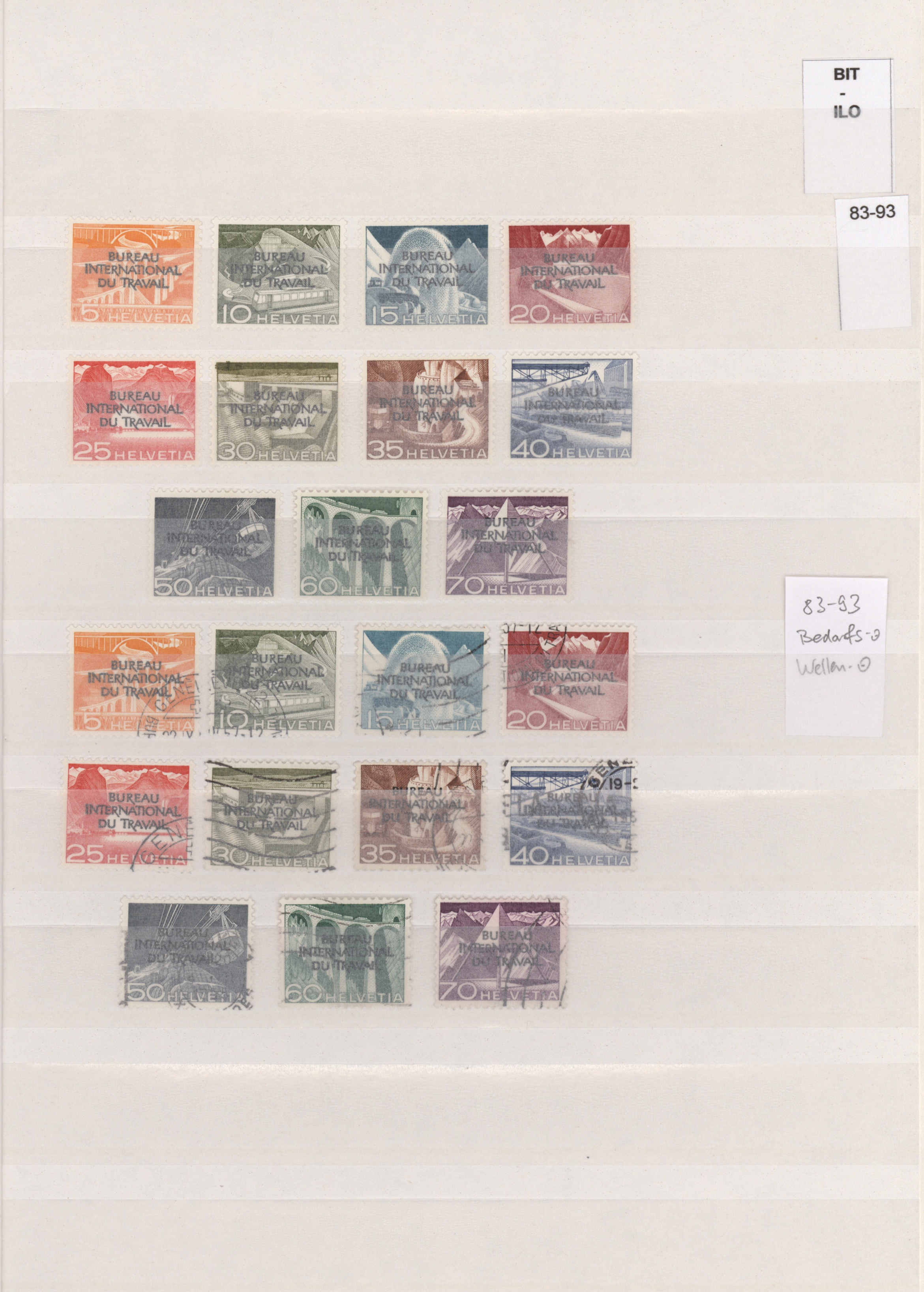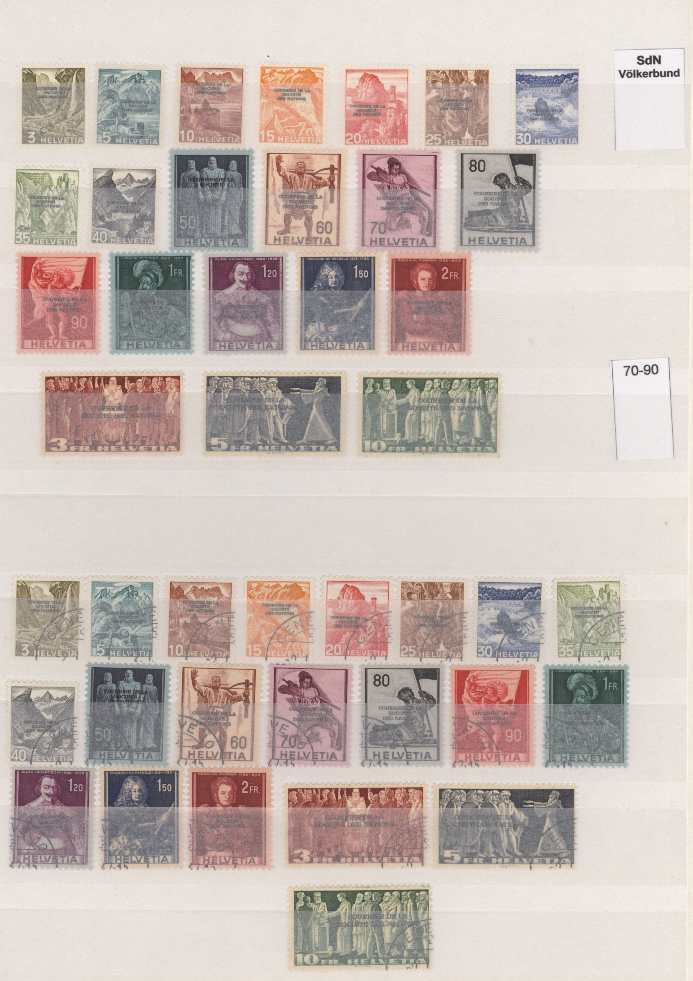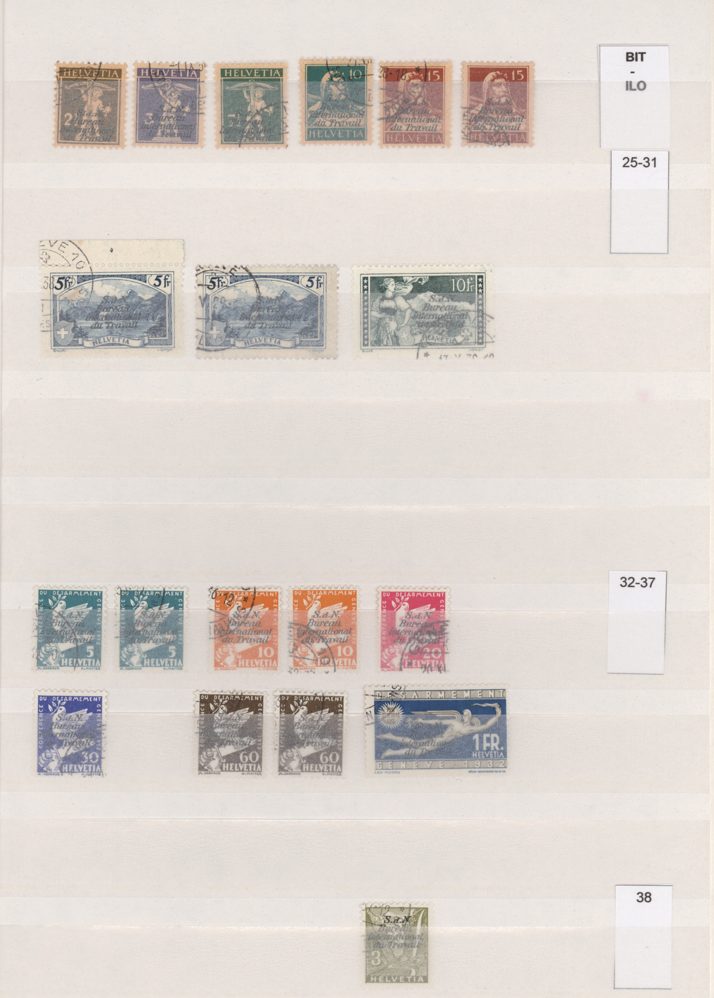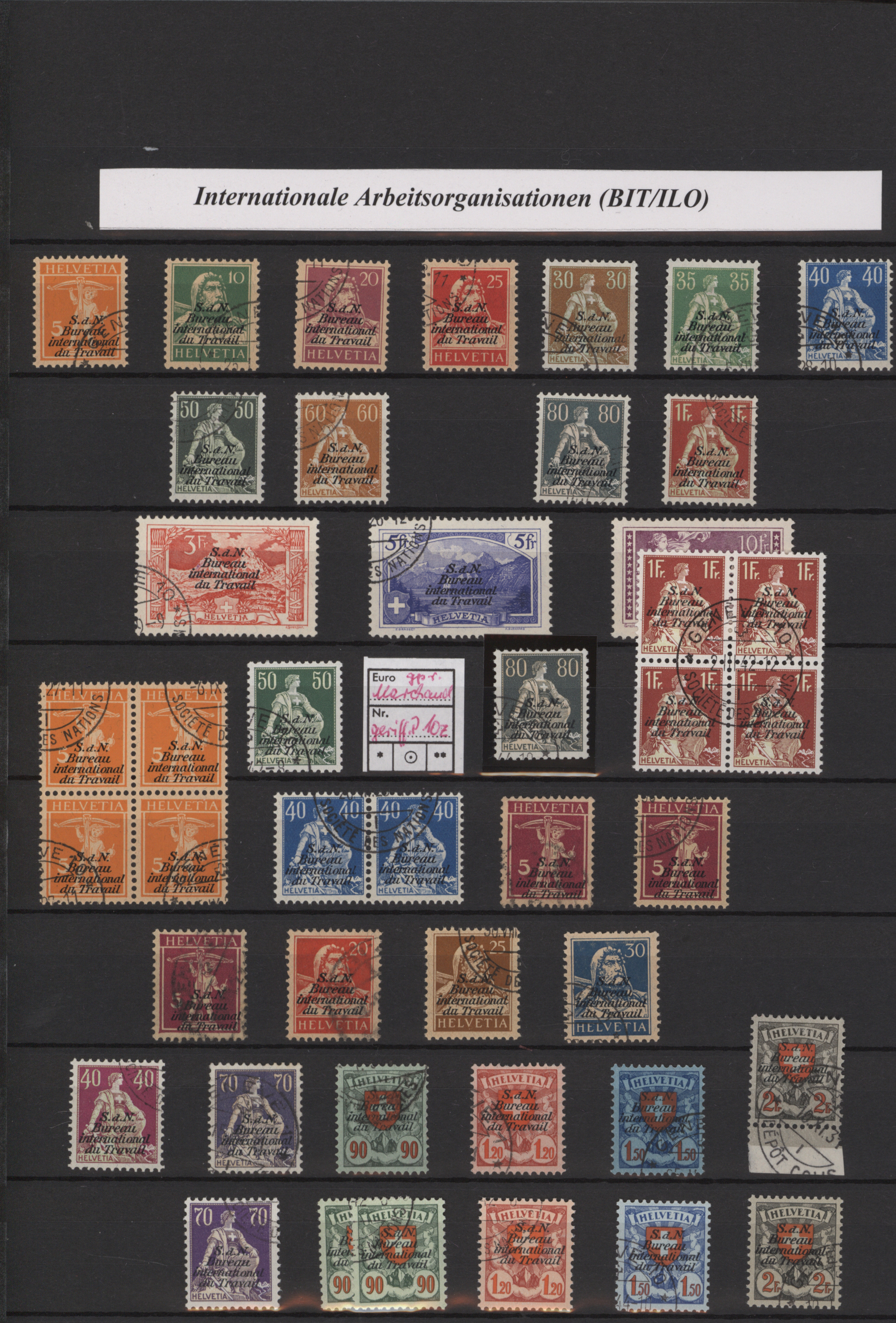 1921-1953, VÖLKERBUND / SDN / BIT, Partie schweizer Dauermarken "Helvetia" und "Wilhelm Tell" mit Dienstmarken-Aufdruck SOCIÉTÉ DES NATIONS, dazu