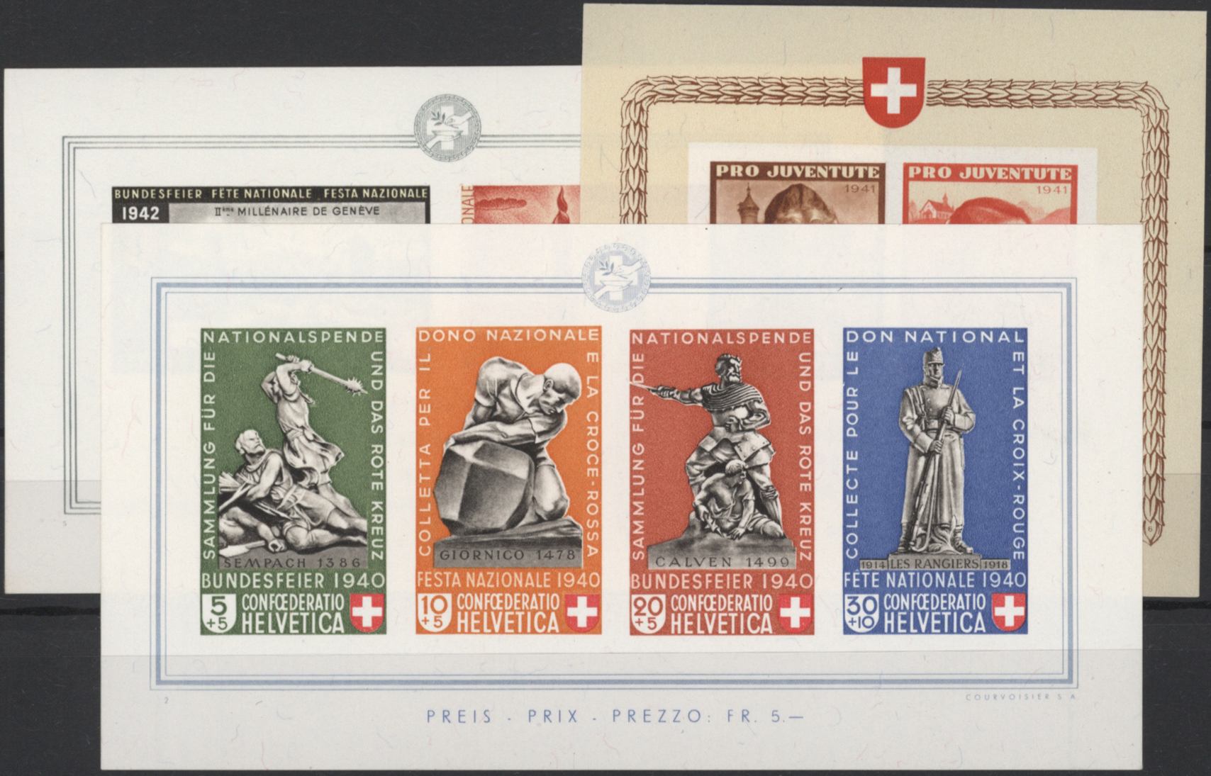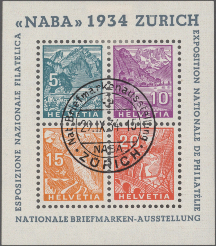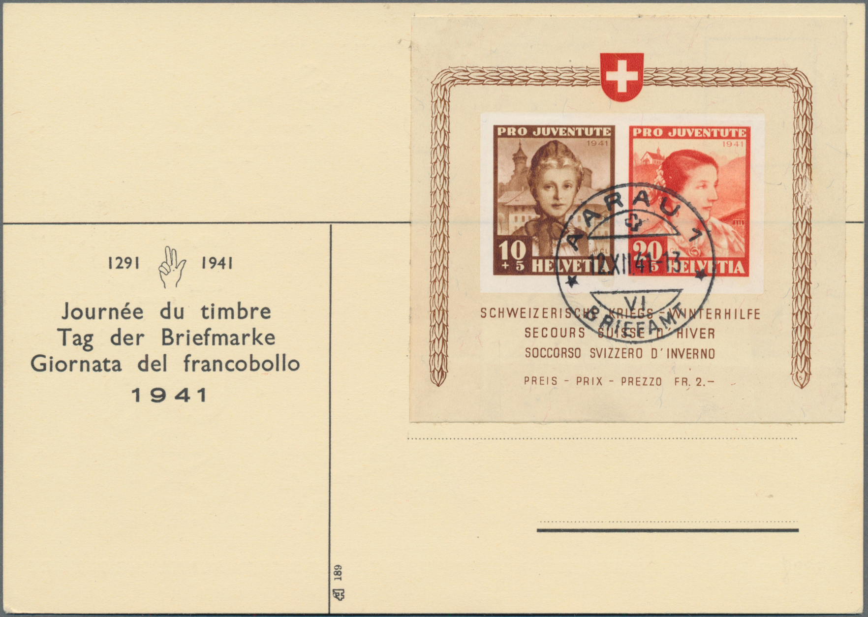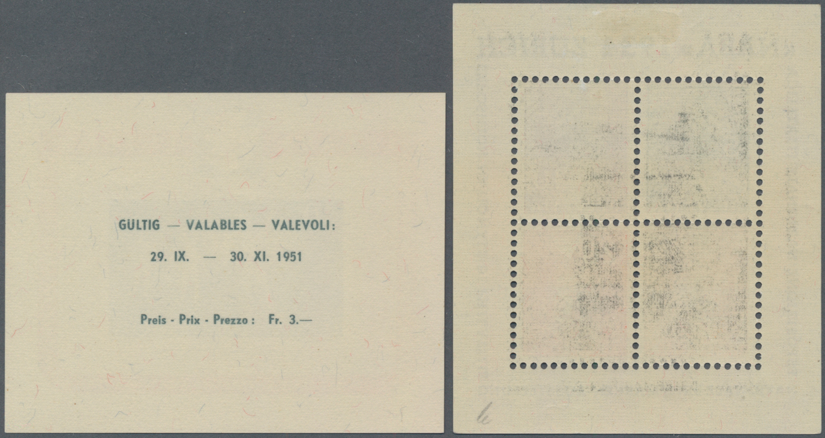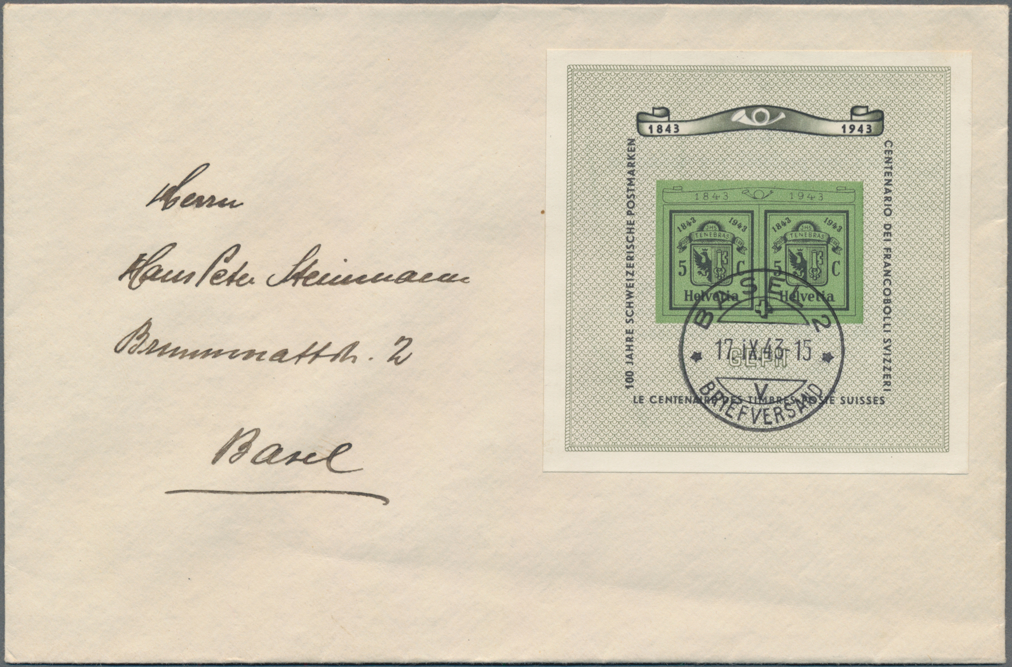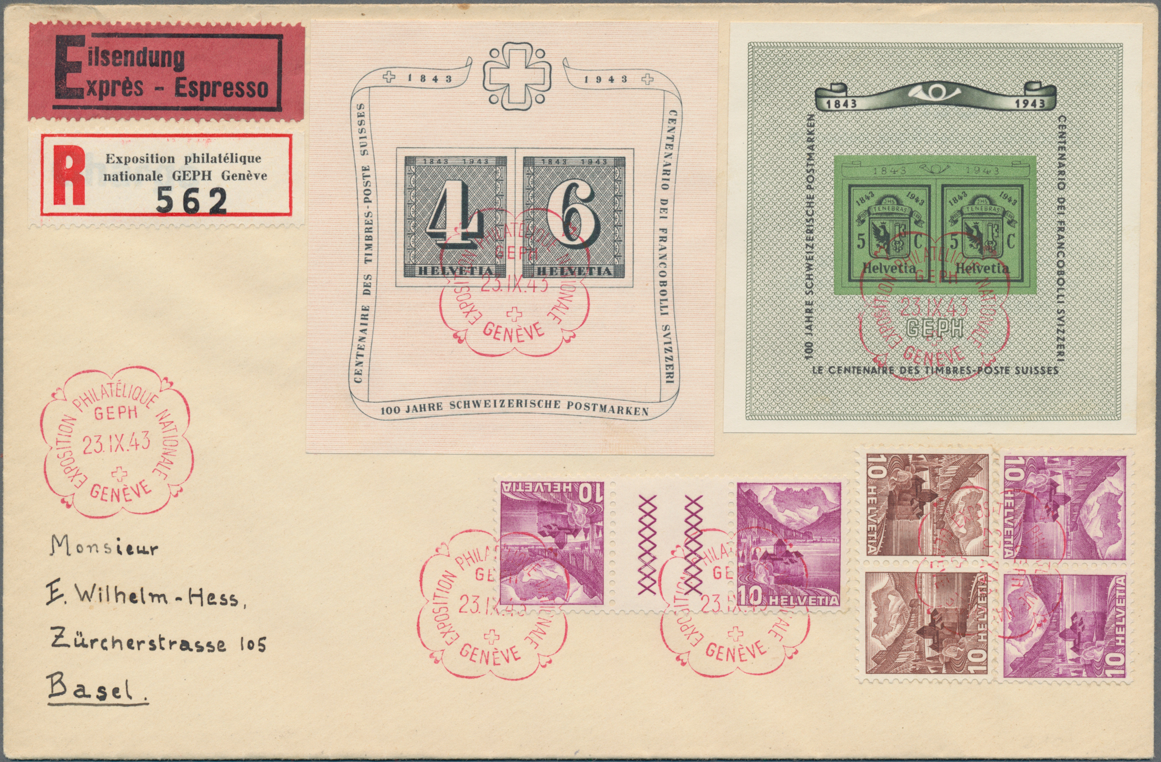 Ausstellungsvignette, innen mit Block 4, den fünf verschiedenen (eingedruckten) SST sowie Widmungstext mit fünf Unterschriften des Organisations-Komitees, kl. Spuren; (2) 1943 PTT-Geschenkheft mit Kordel "100 JAHRE SCHWEIZERISCHE POSTMARKEN" mit zwei