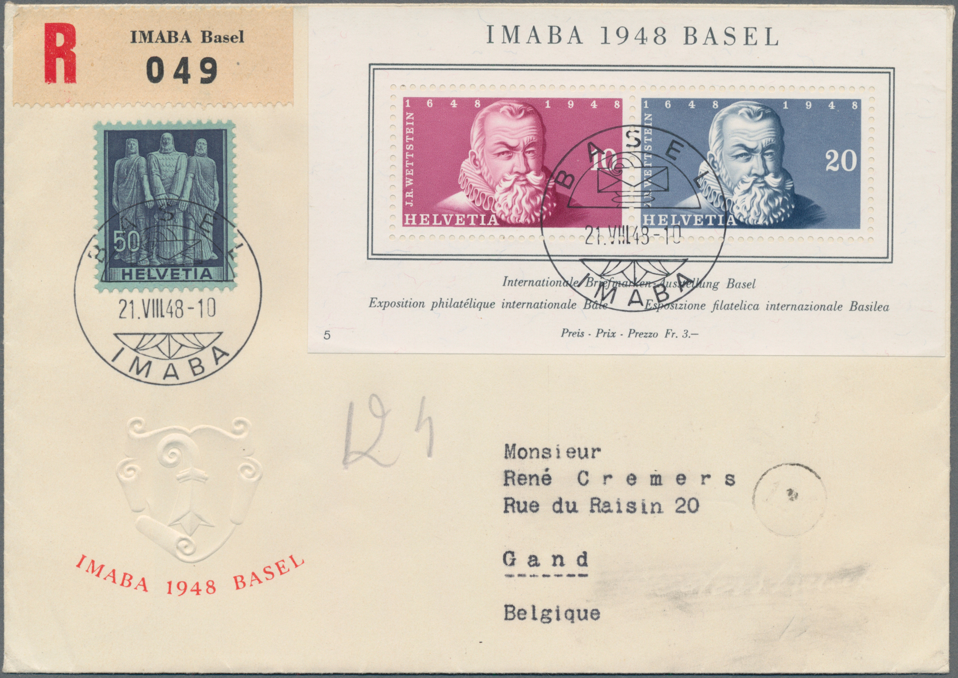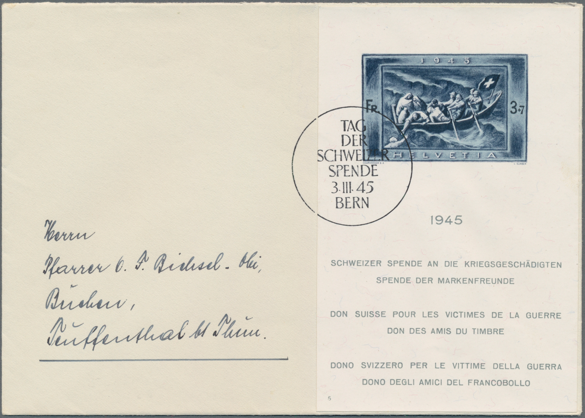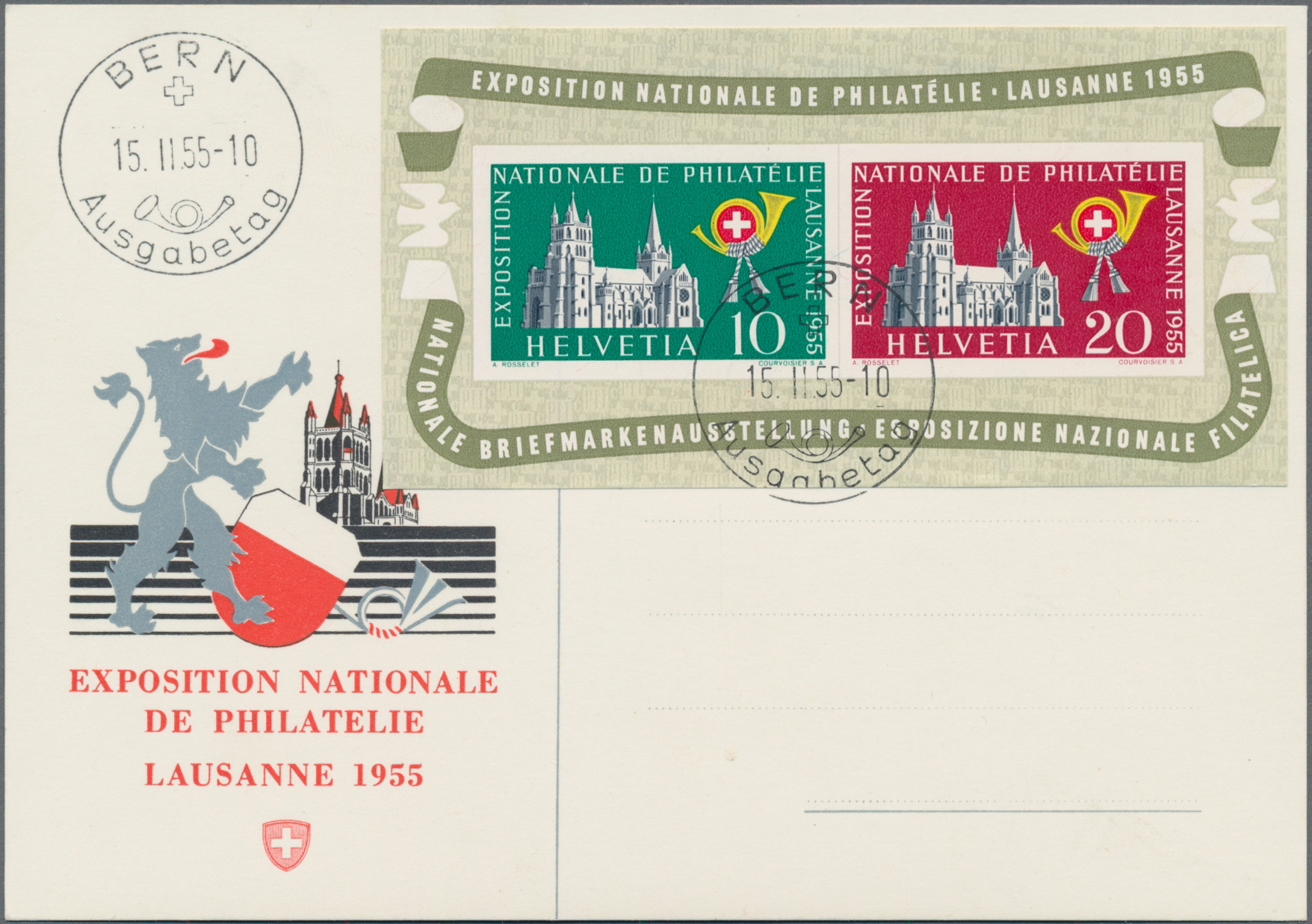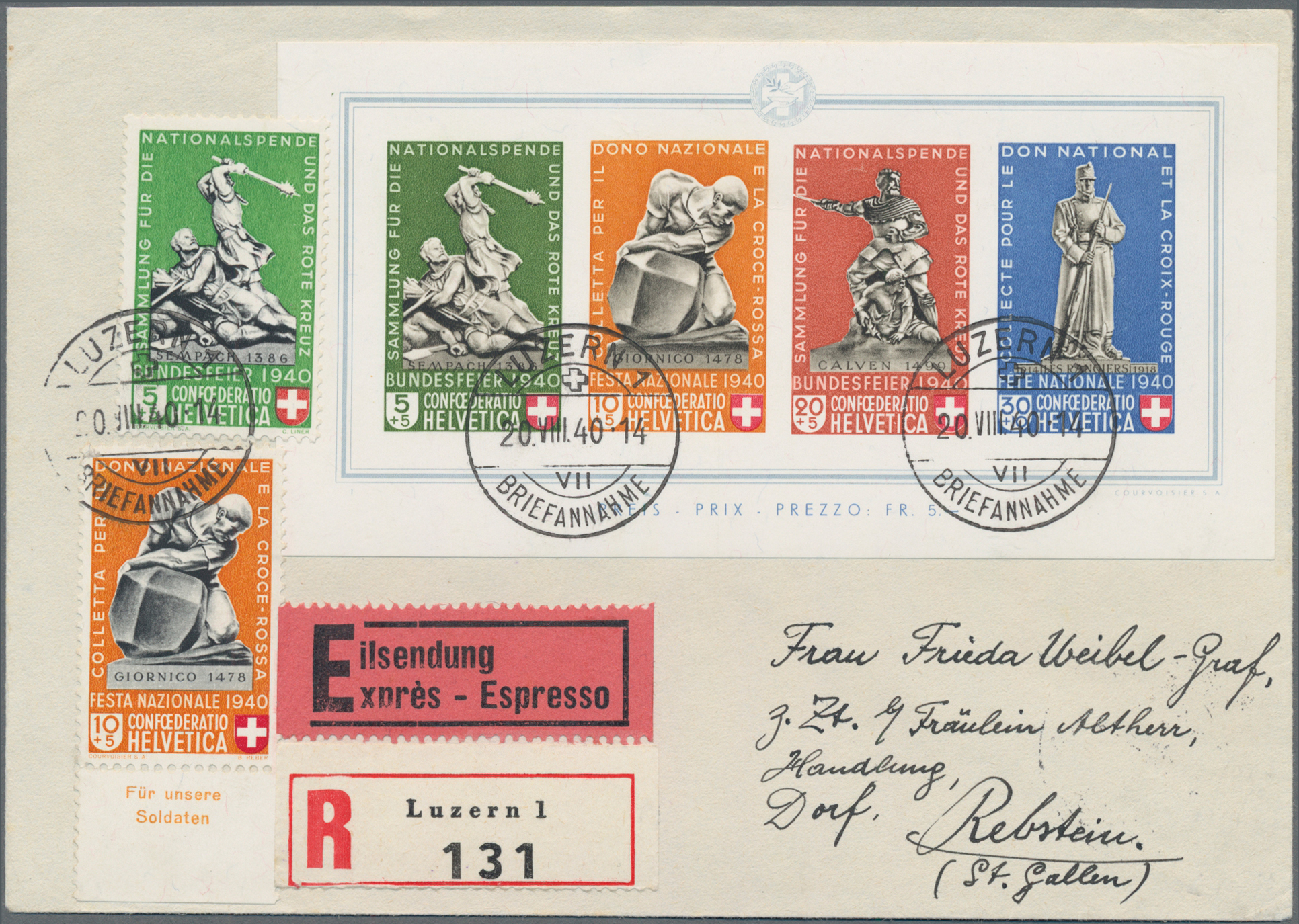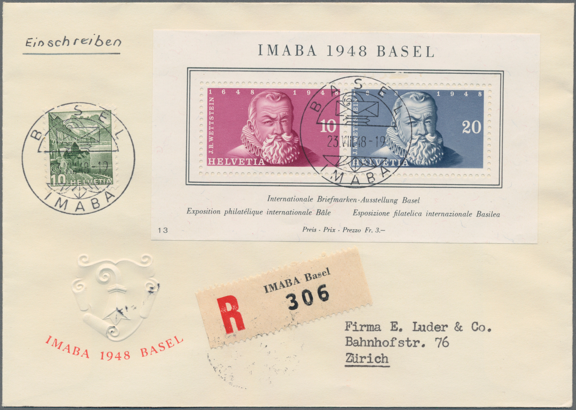 Ausstellungsvignette, innen mit Block 4, den fünf verschiedenen (eingedruckten) SST sowie Widmungstext mit fünf Unterschriften des Organisations-Komitees, kl. Spuren; (2) 1943 PTT-Geschenkheft mit Kordel "100 JAHRE SCHWEIZERISCHE POSTMARKEN" mit zwei