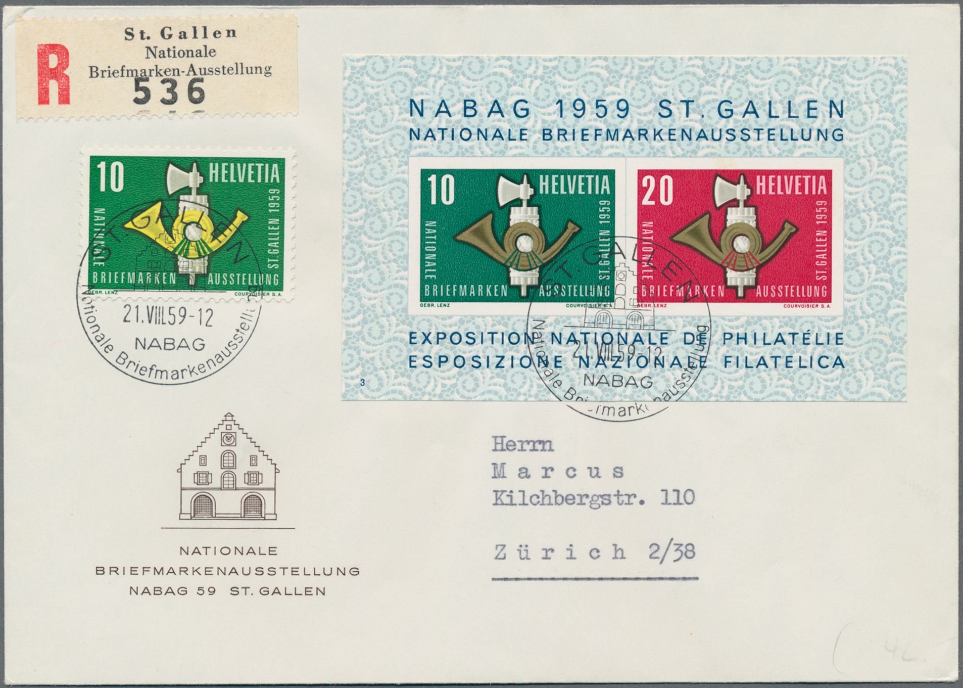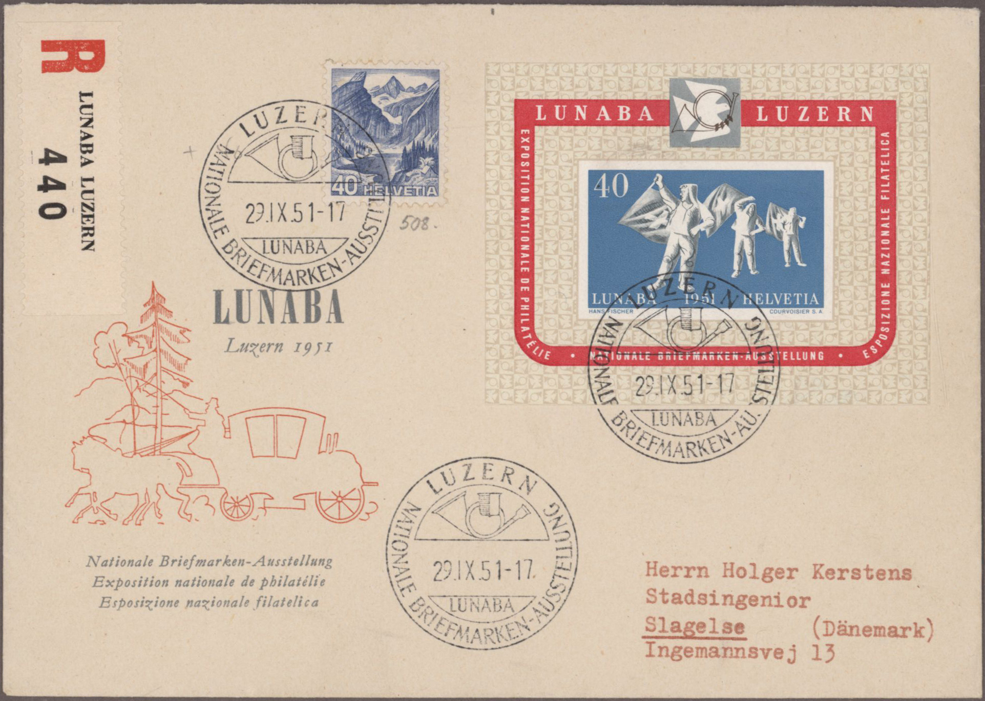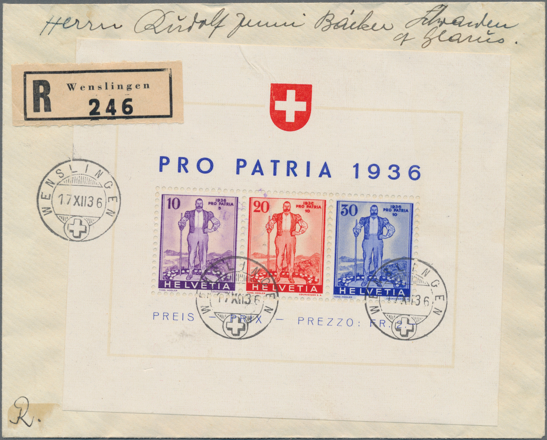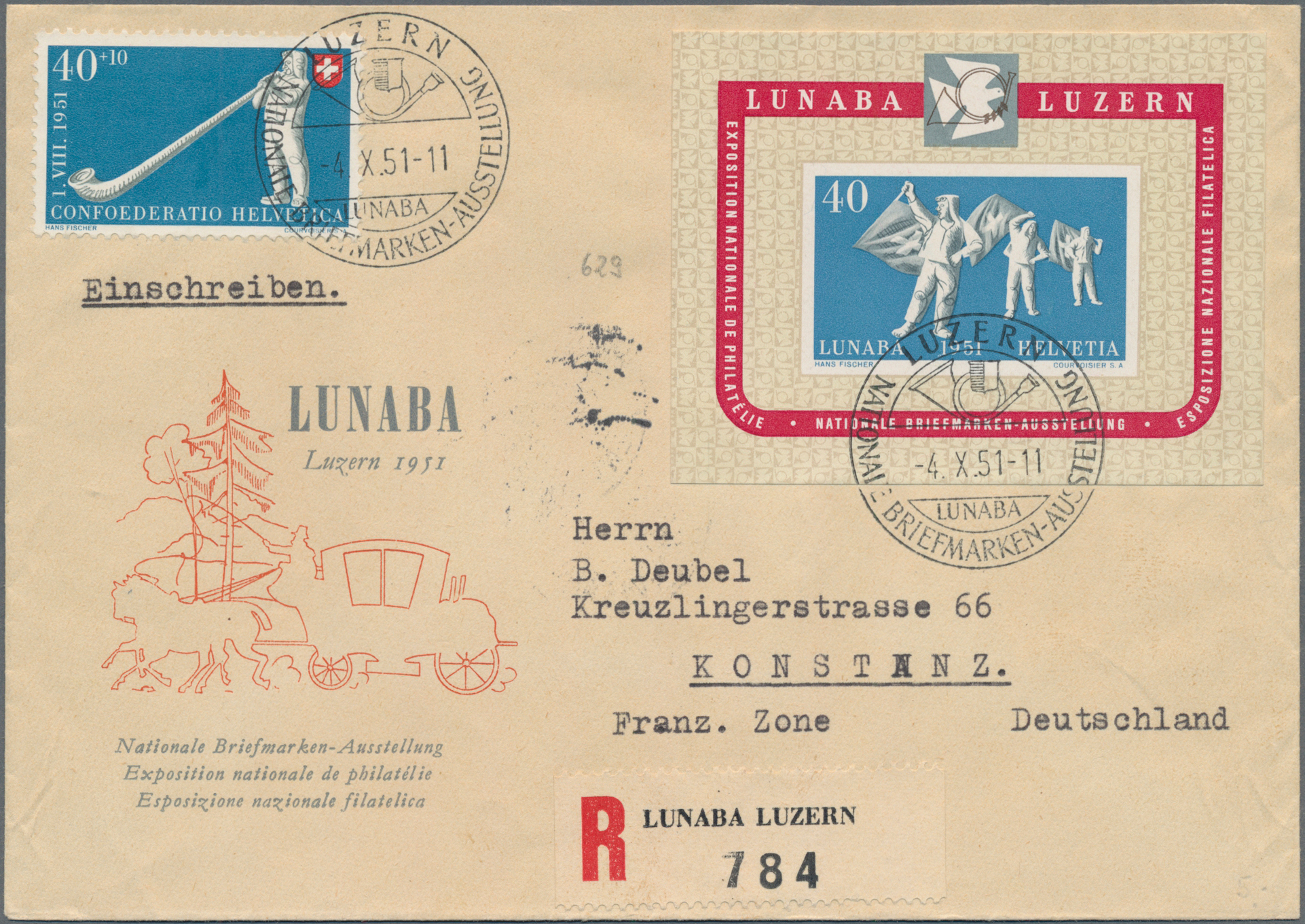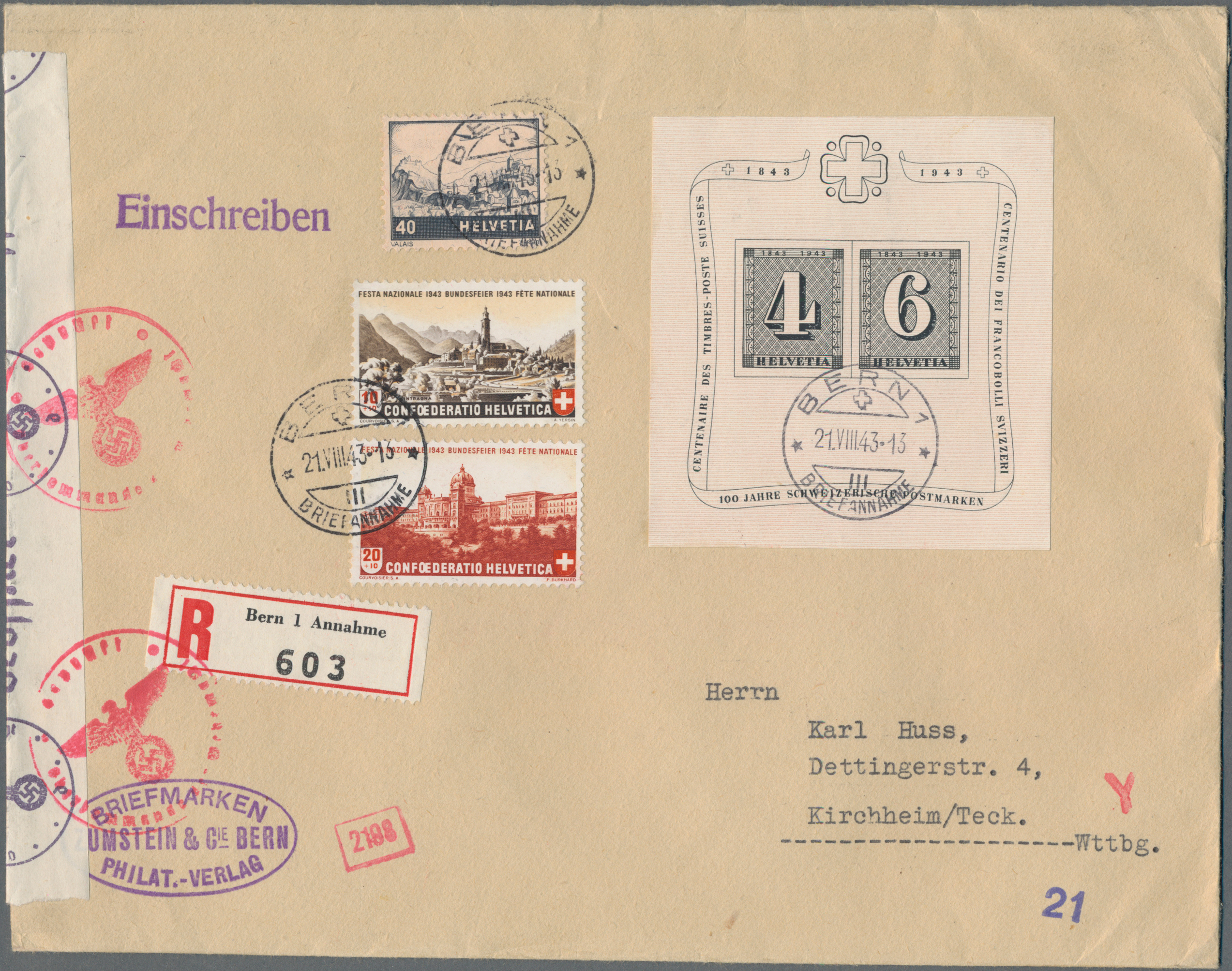 Ausstellungsvignette, innen mit Block 4, den fünf verschiedenen (eingedruckten) SST sowie Widmungstext mit fünf Unterschriften des Organisations-Komitees, kl. Spuren; (2) 1943 PTT-Geschenkheft mit Kordel "100 JAHRE SCHWEIZERISCHE POSTMARKEN" mit zwei