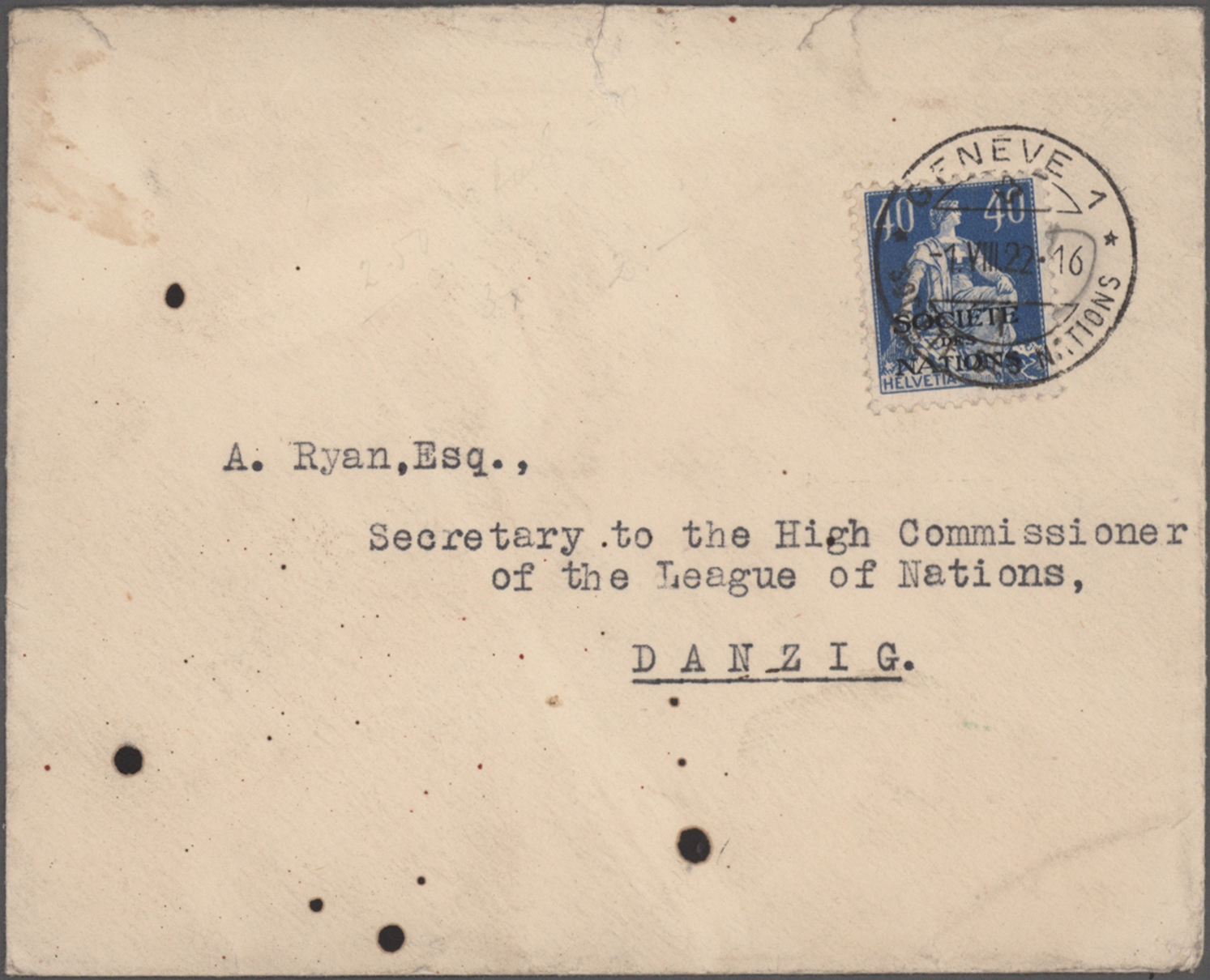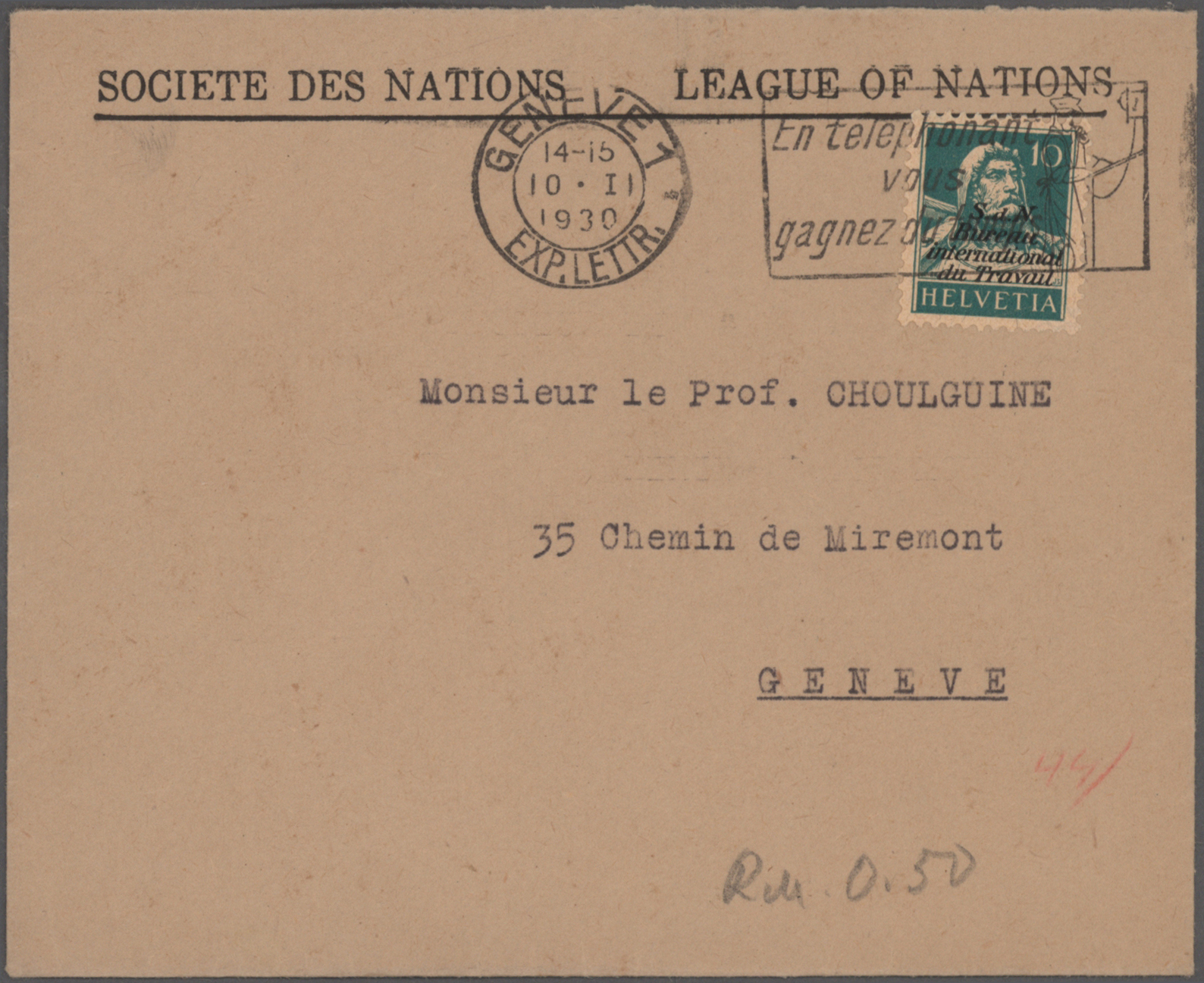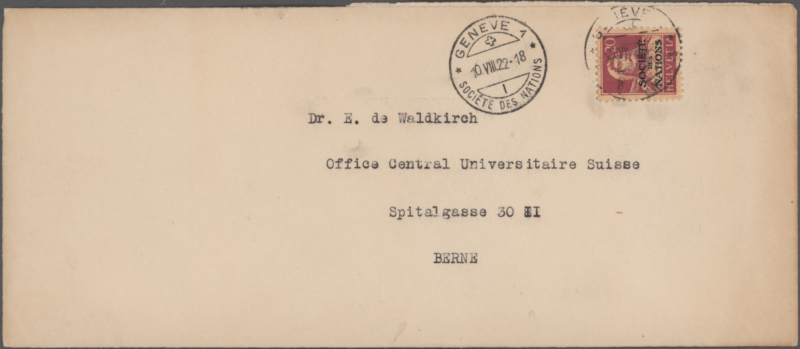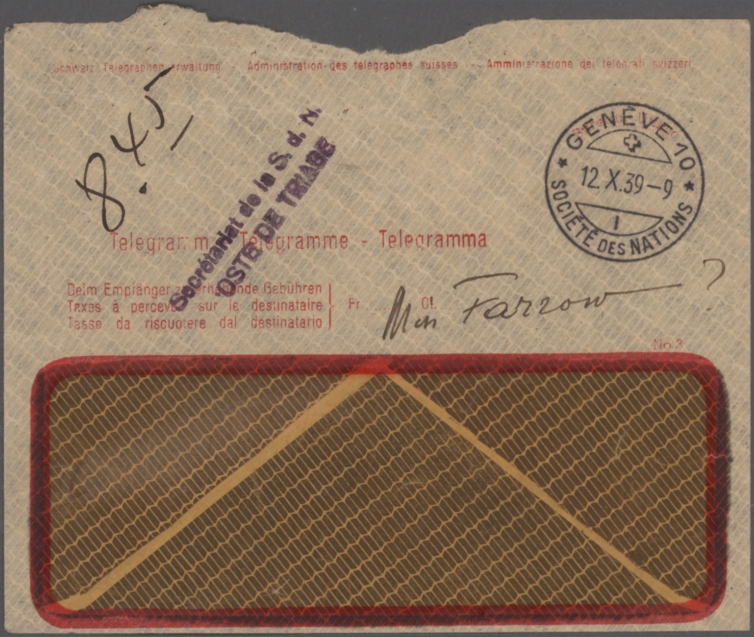 Vorläufer ohne Aufdruck und Nachläufer (UNO) mit Aushilfs-Kastenstempel GENÈVE ASS. S.D.N. (1921) bzw. GENÈVE 10 (1953). Außerdem Dienstelegramm (1939). Durchweg attraktive Postgeschichte!