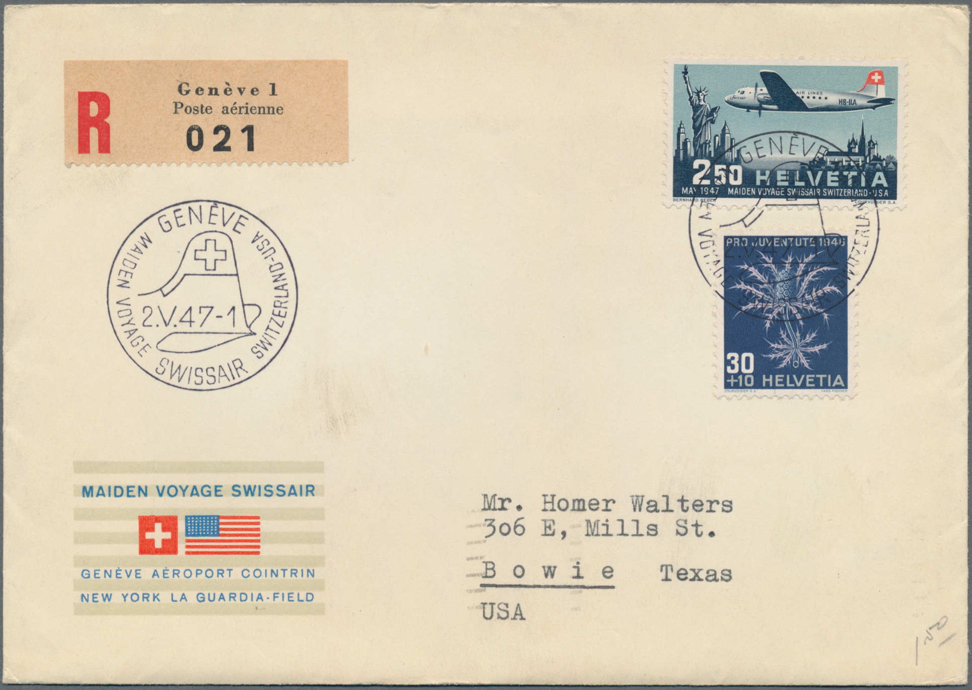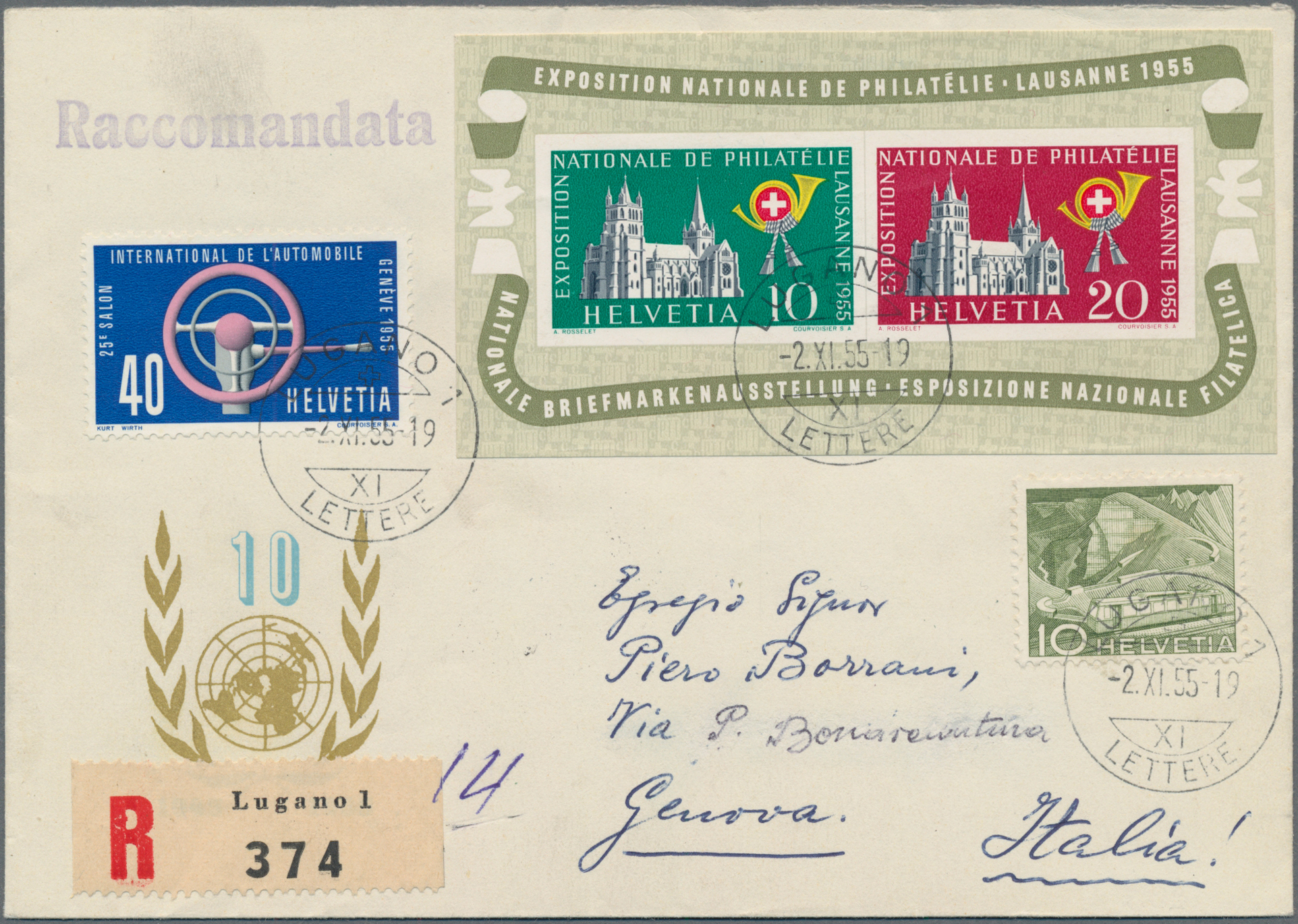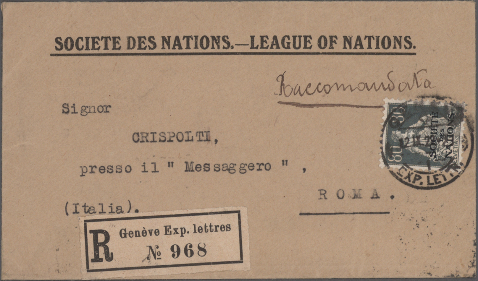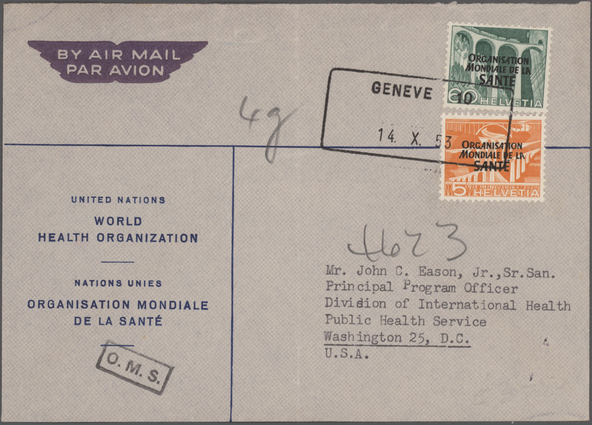 Vorläufer ohne Aufdruck und Nachläufer (UNO) mit Aushilfs-Kastenstempel GENÈVE ASS. S.D.N. (1921) bzw. GENÈVE 10 (1953). Außerdem Dienstelegramm (1939). Durchweg attraktive Postgeschichte!