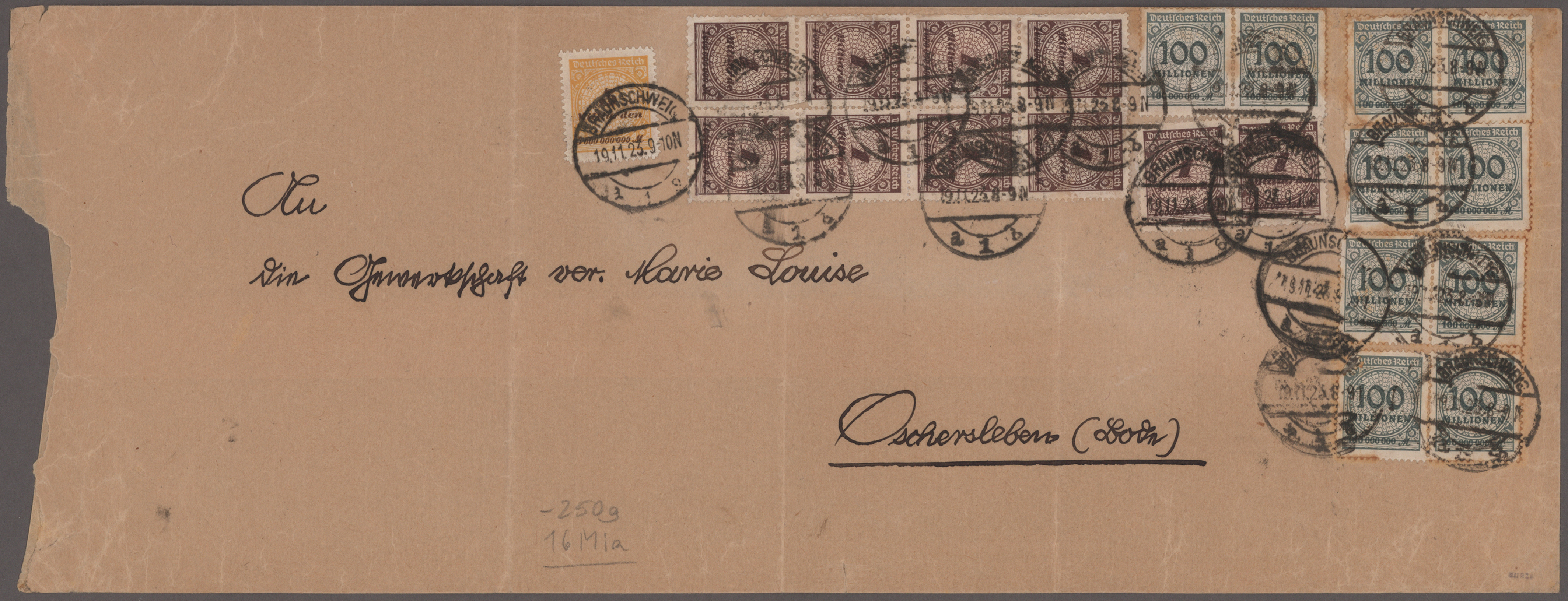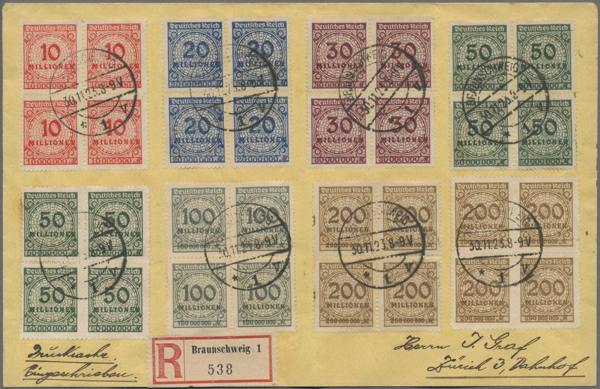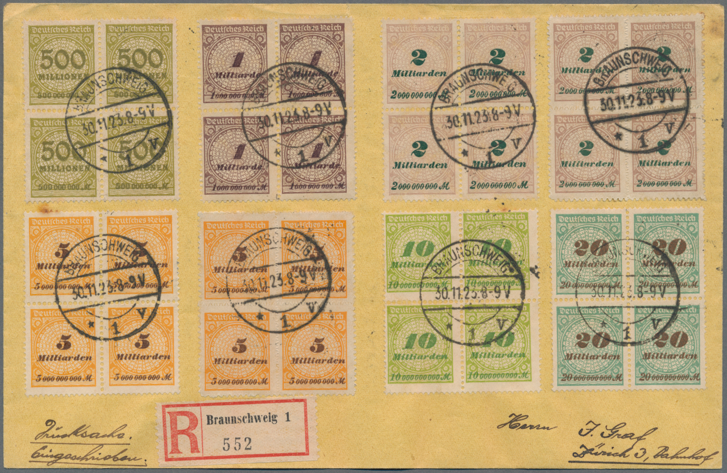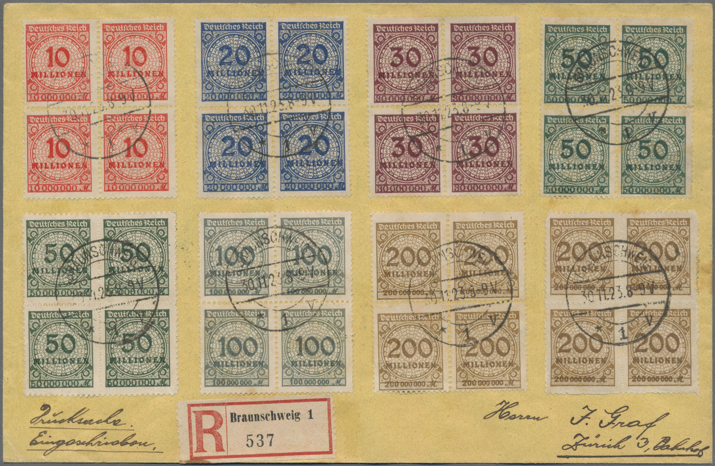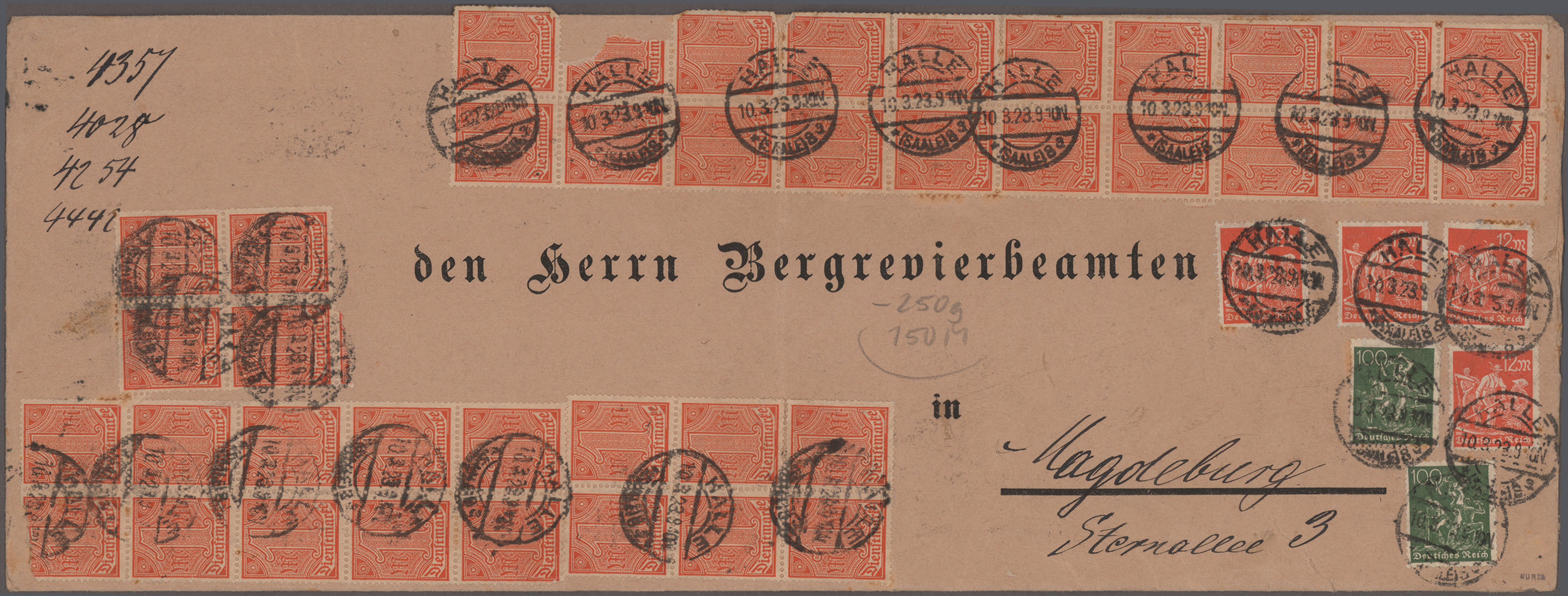 1922/1923, Lot von vier Briefen mit Massenfrankaturen, einige unvermeidliche Spuren, dabei reine Massenfrankatur von ?? Marken MiNr. 288 (kreuz und quer