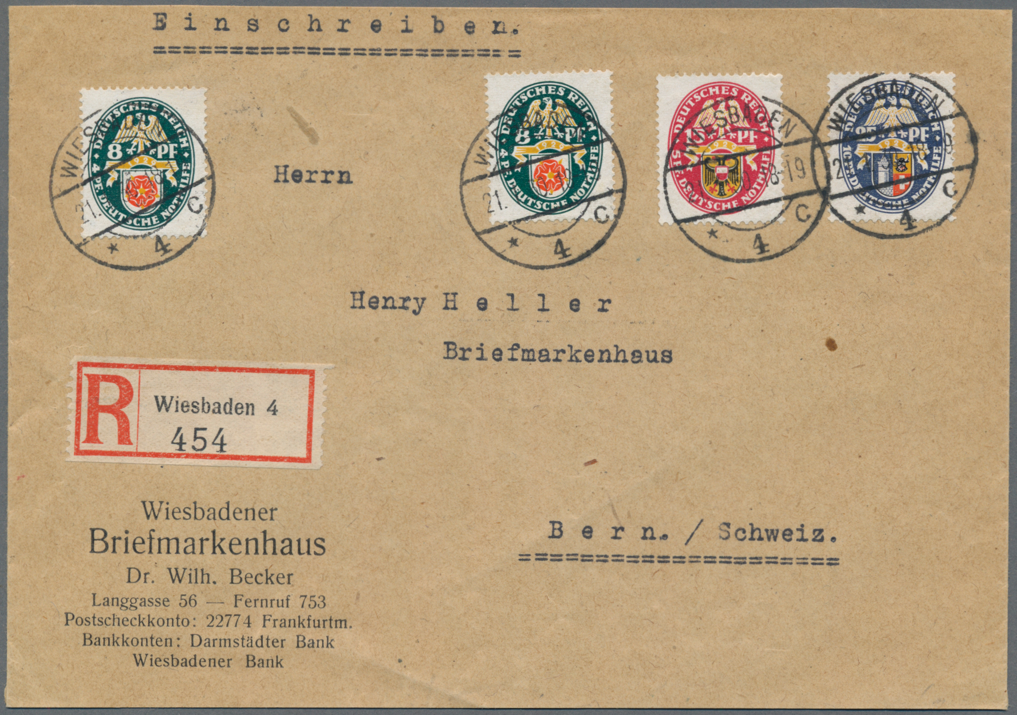1927, Nothilfe, fünf attraktive Satzfrankaturen mit Stempeln von Mulda, Auerbach, Obergünzburg, Cuxhaven und Nürnberg (Stempeldaten Oktober 1927).