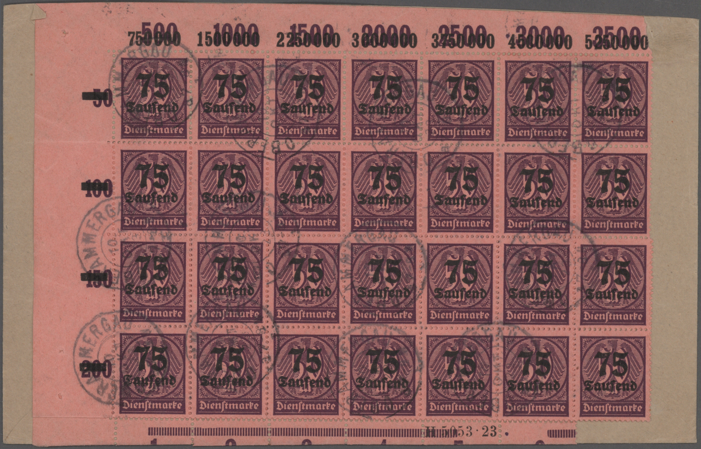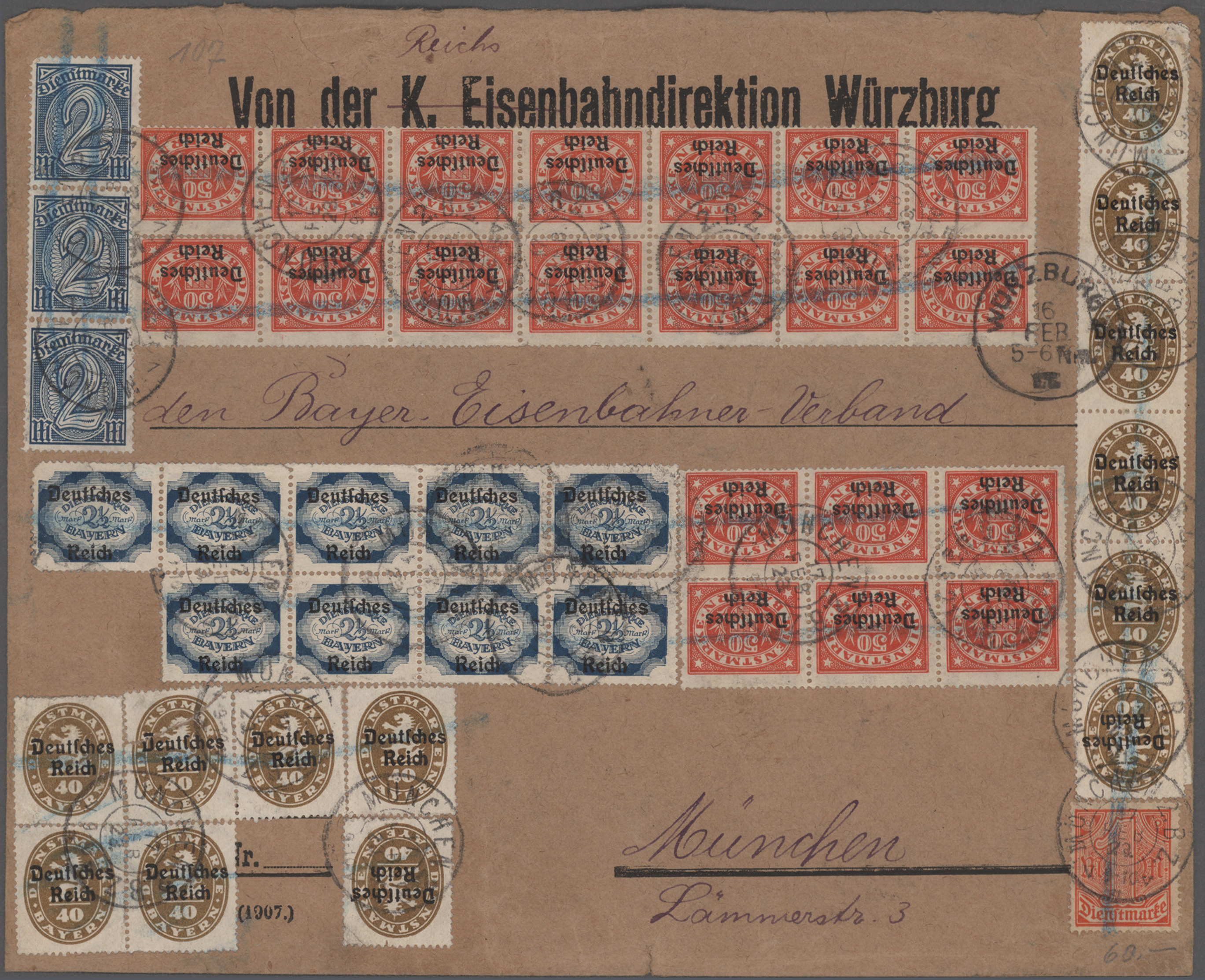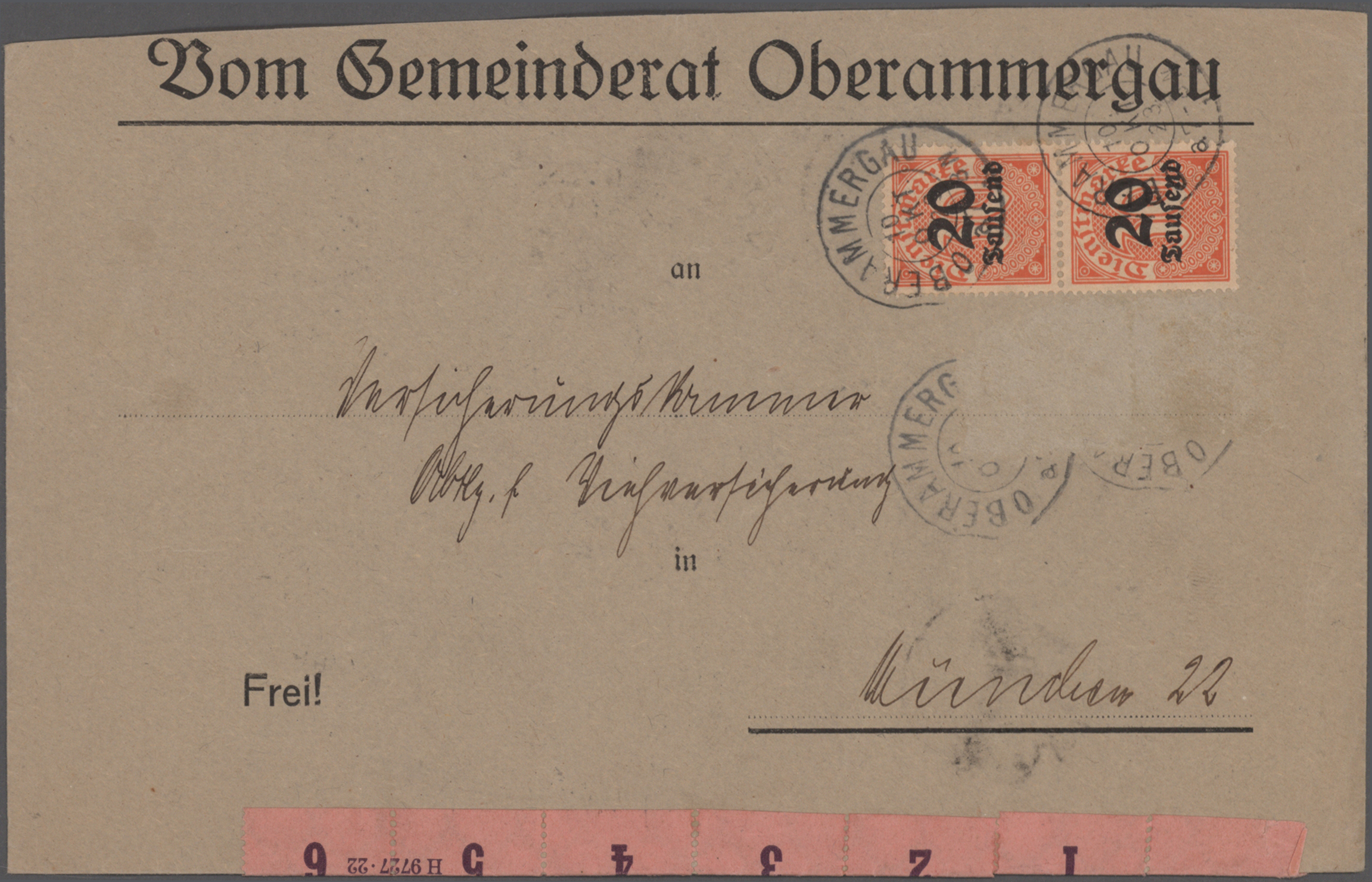 1922/1923, Partie von sieben großformatigen Langumschlägen mit Massenfrankaturen Freimarken und Dienstmarken incl. MiF der beiden, auch größere