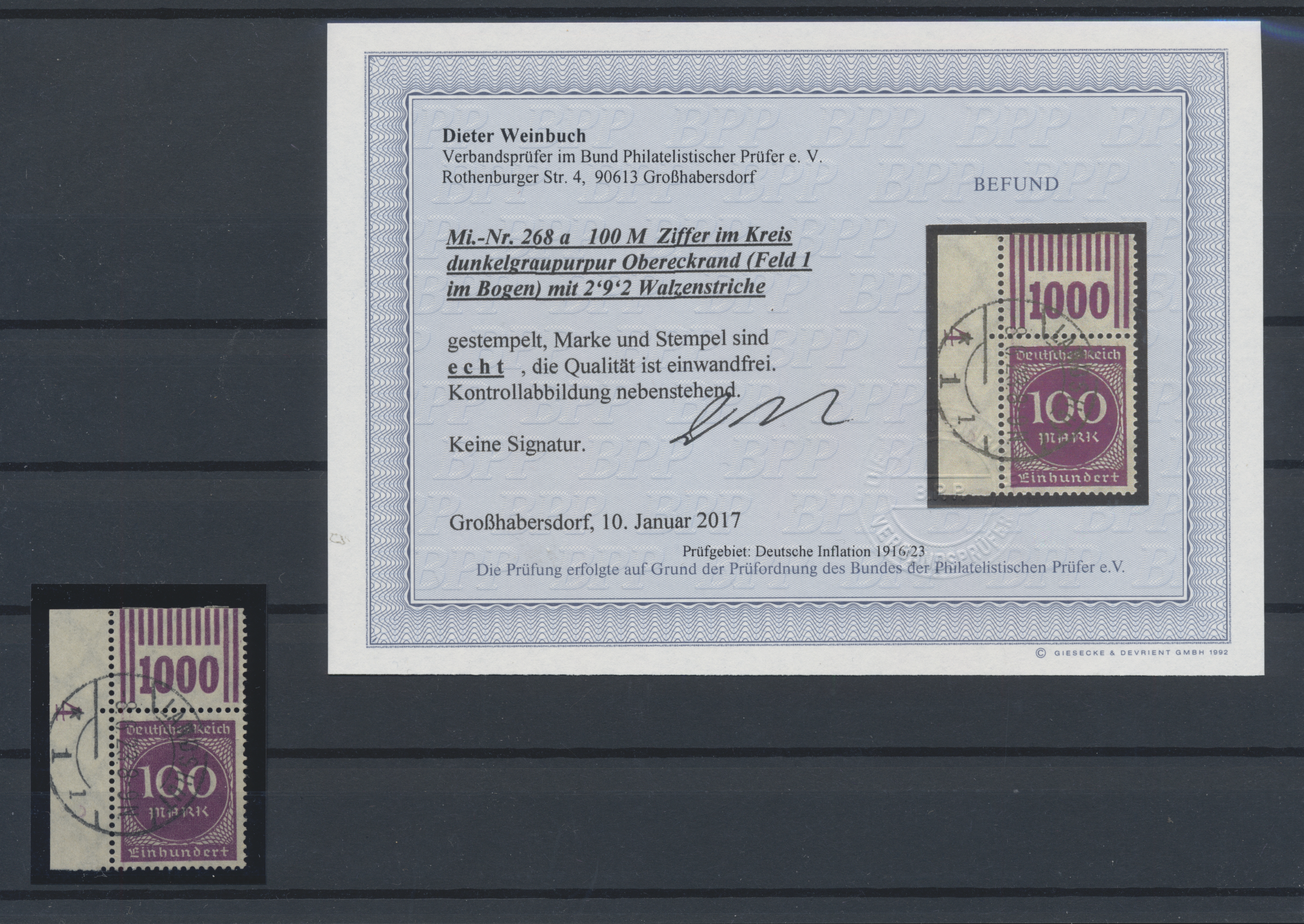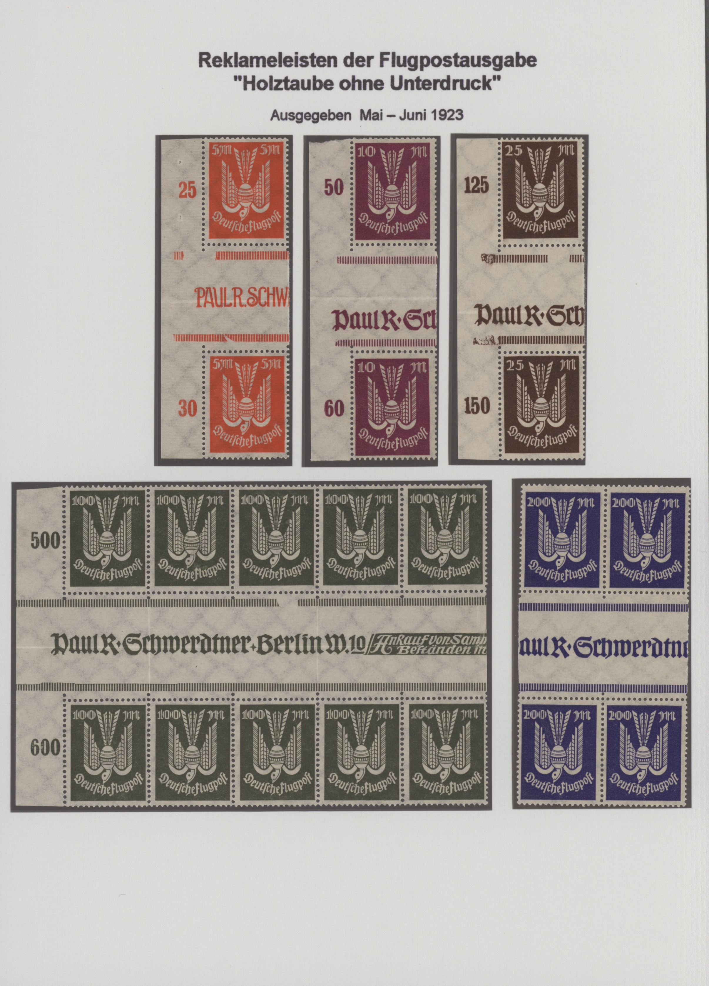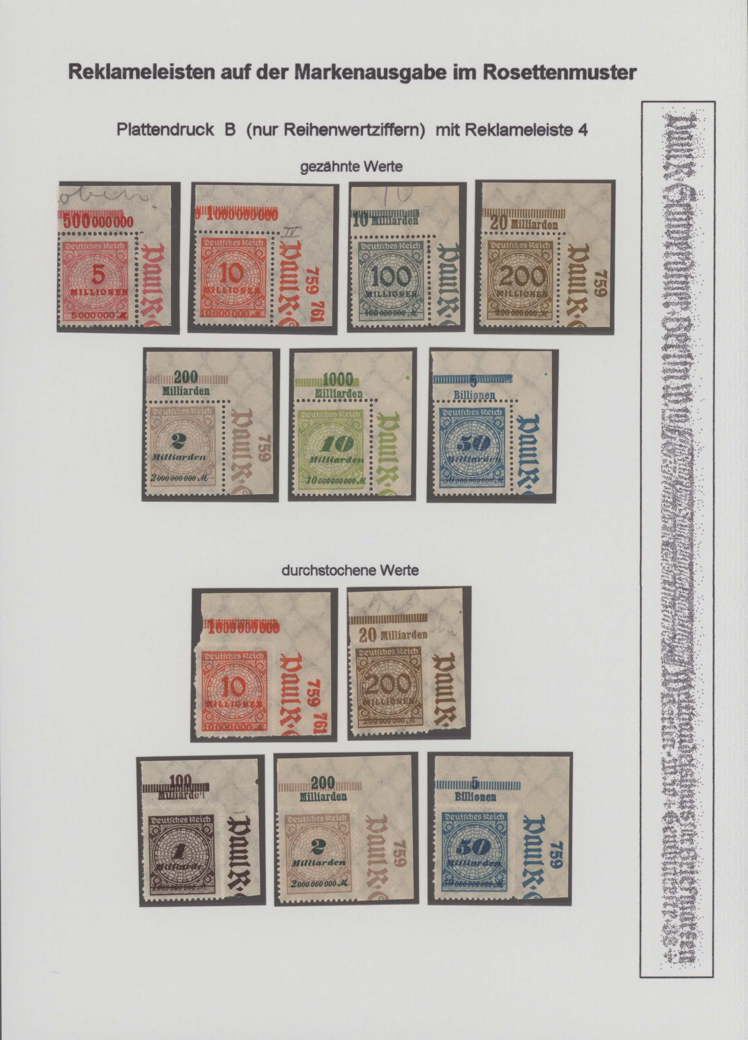 1922/23, interessante Sammlung von Oberrandstücken bzw. Oberrand-Bogenecken, teils auch mit Reklameleisten, dazu Platten- und Walzendrucke mit