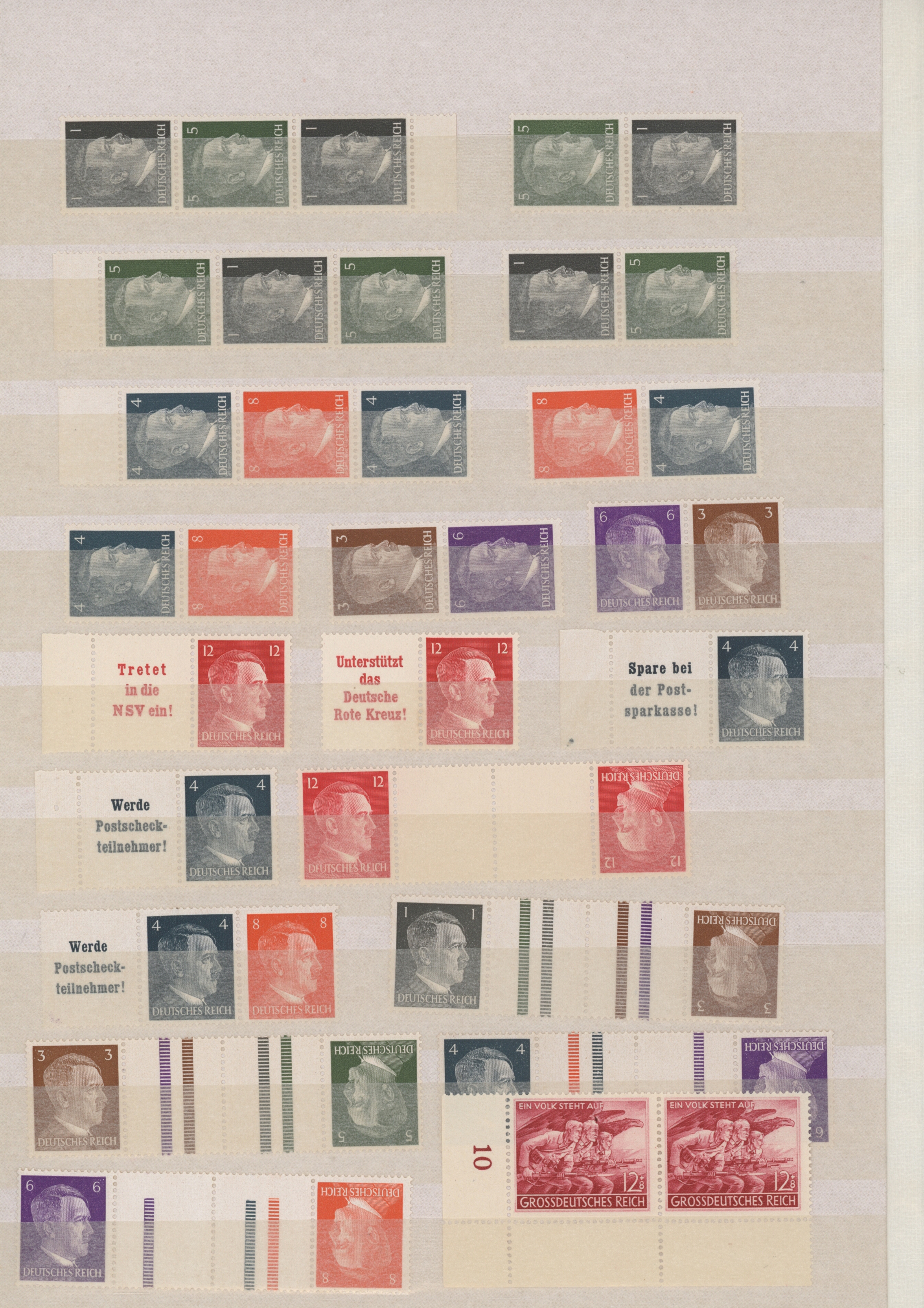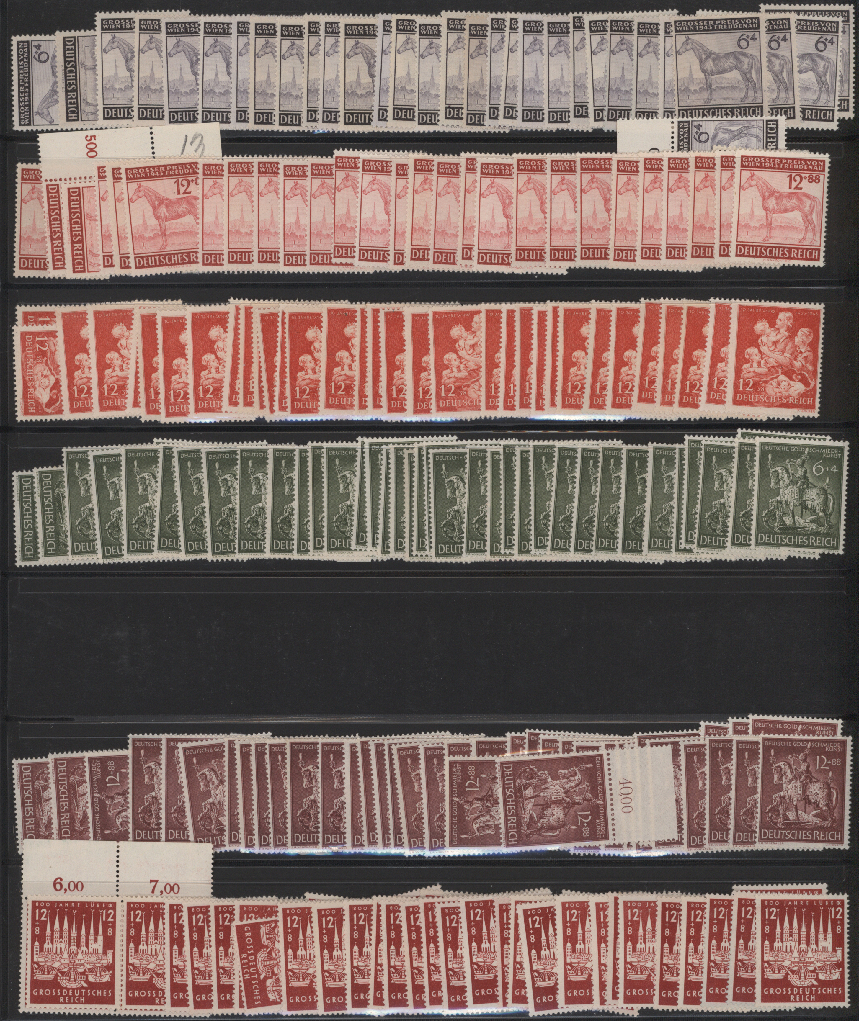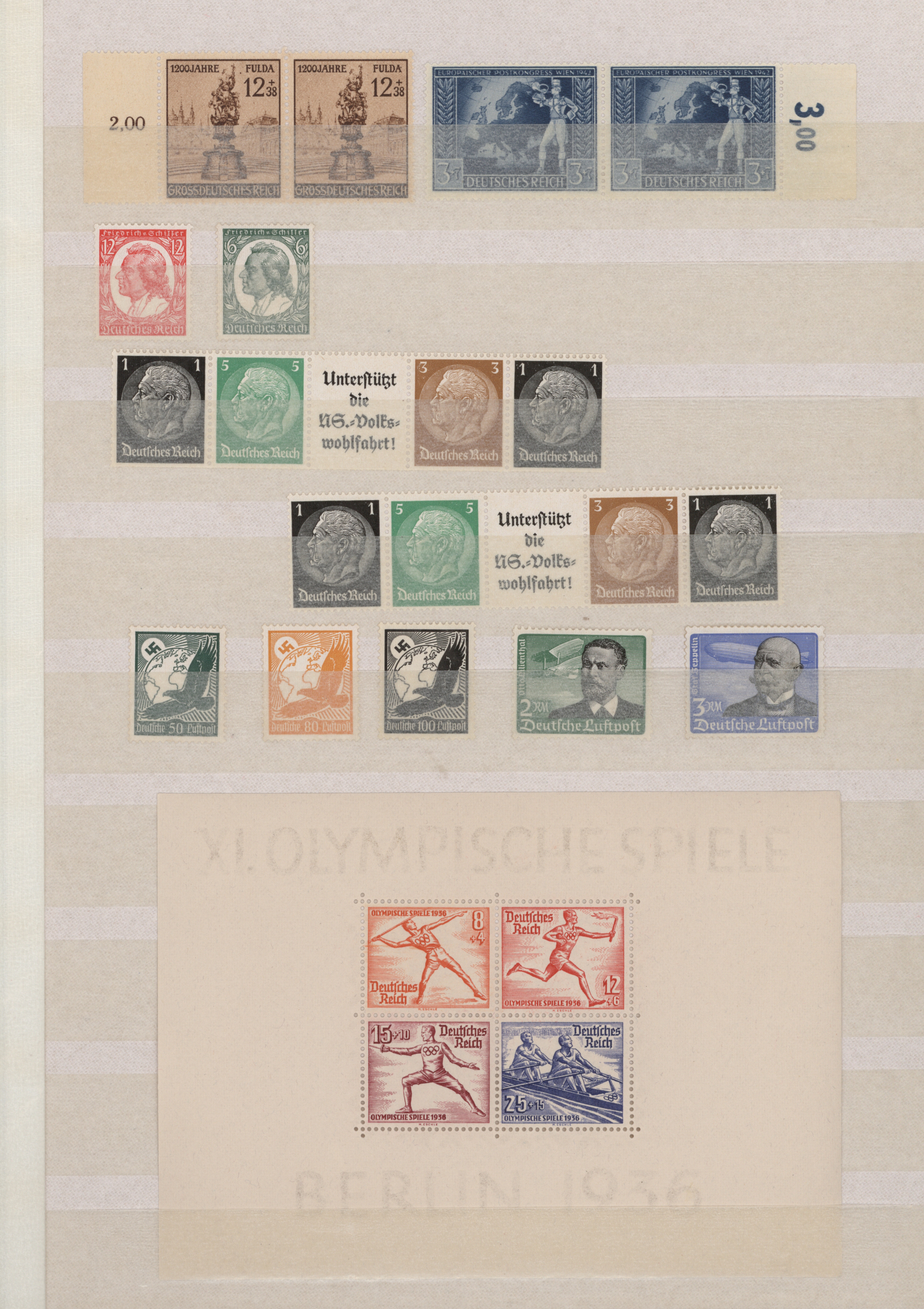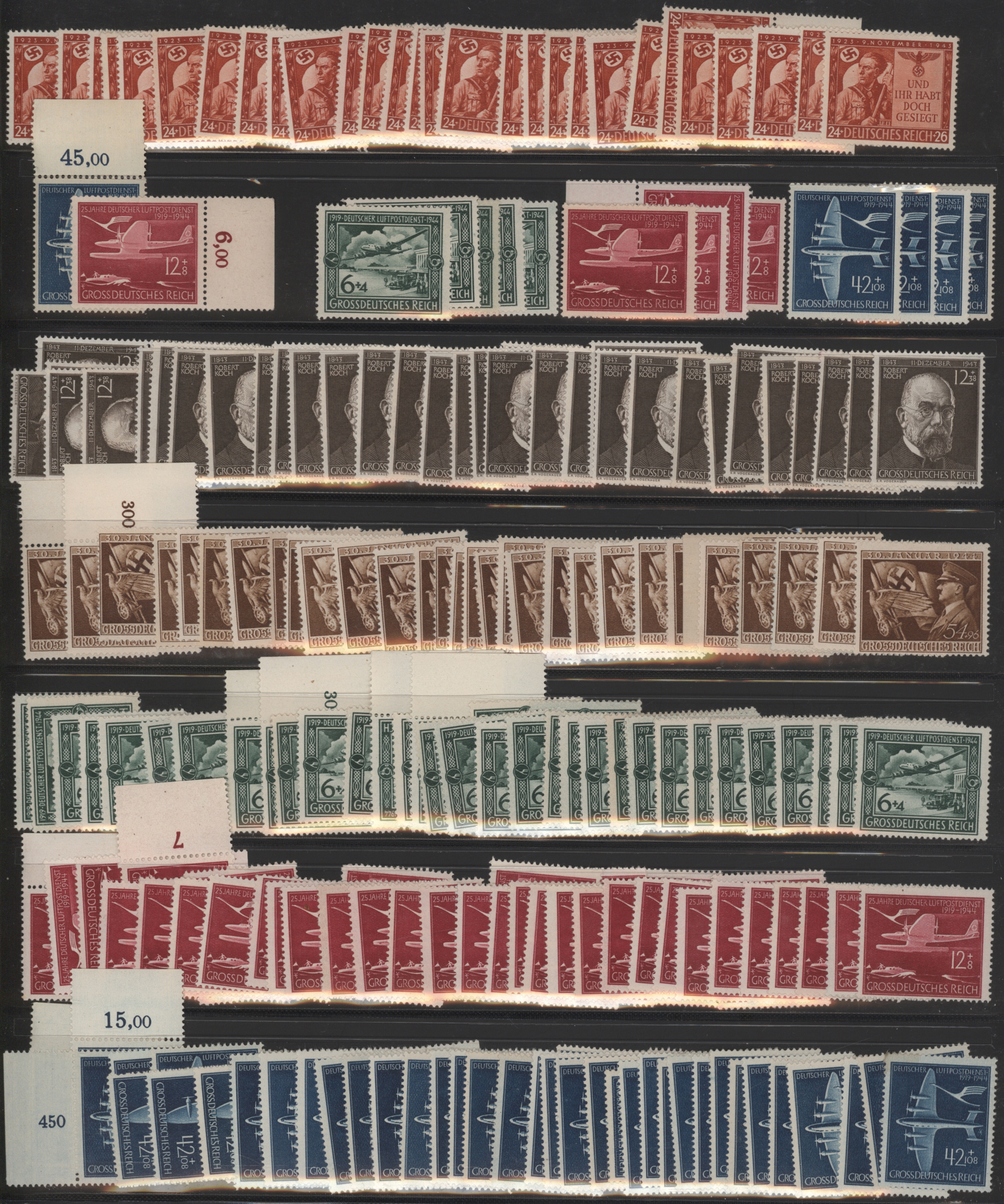 III.Reich, durchgehend gut besetzt incl. Wagner, Stände, WHW, Nürburgring, Danzig-Abschied, Braune und Blaue Bänder, Dienst und auch reichlich Zusammendrucke, jedoch ohne Blocks, auch Einheiten, Bogenecken, Briefstücke, usw., zusätzlich div.