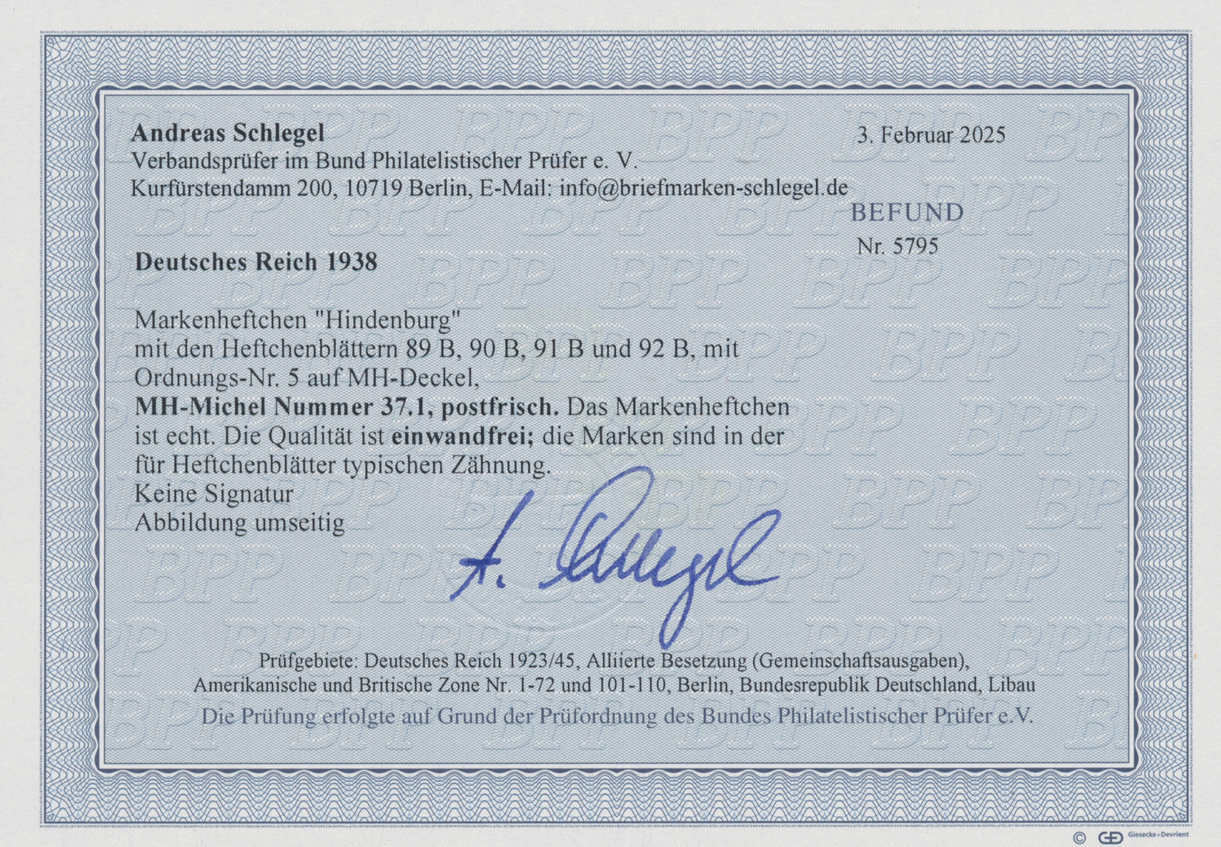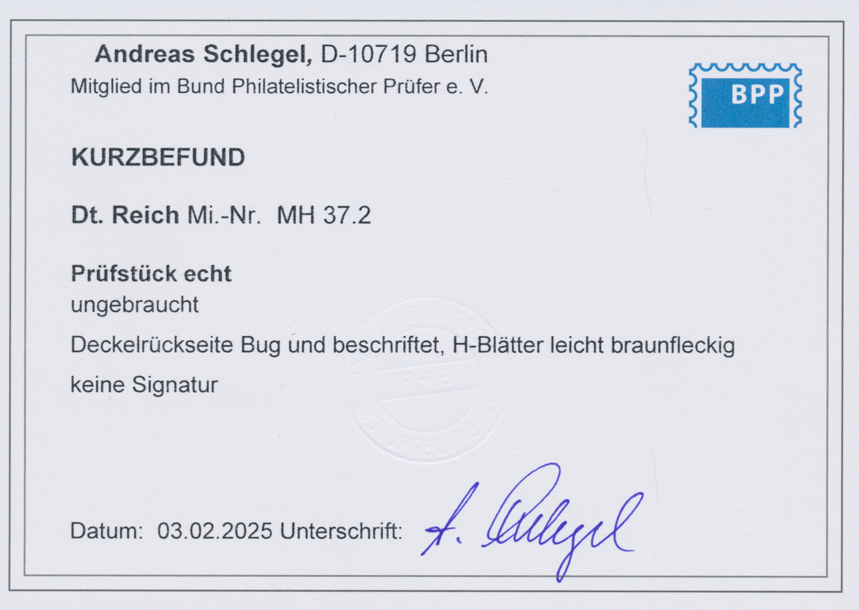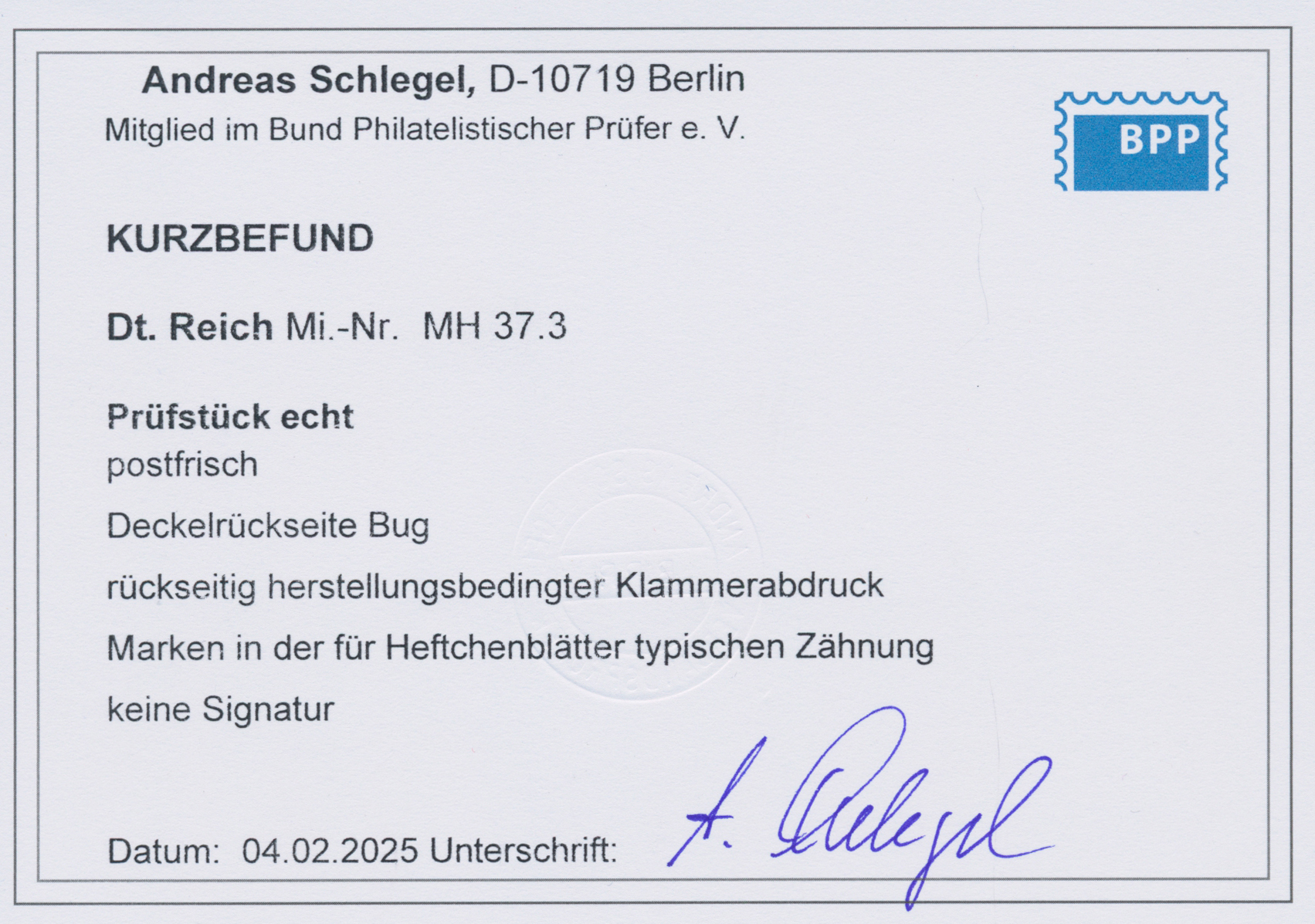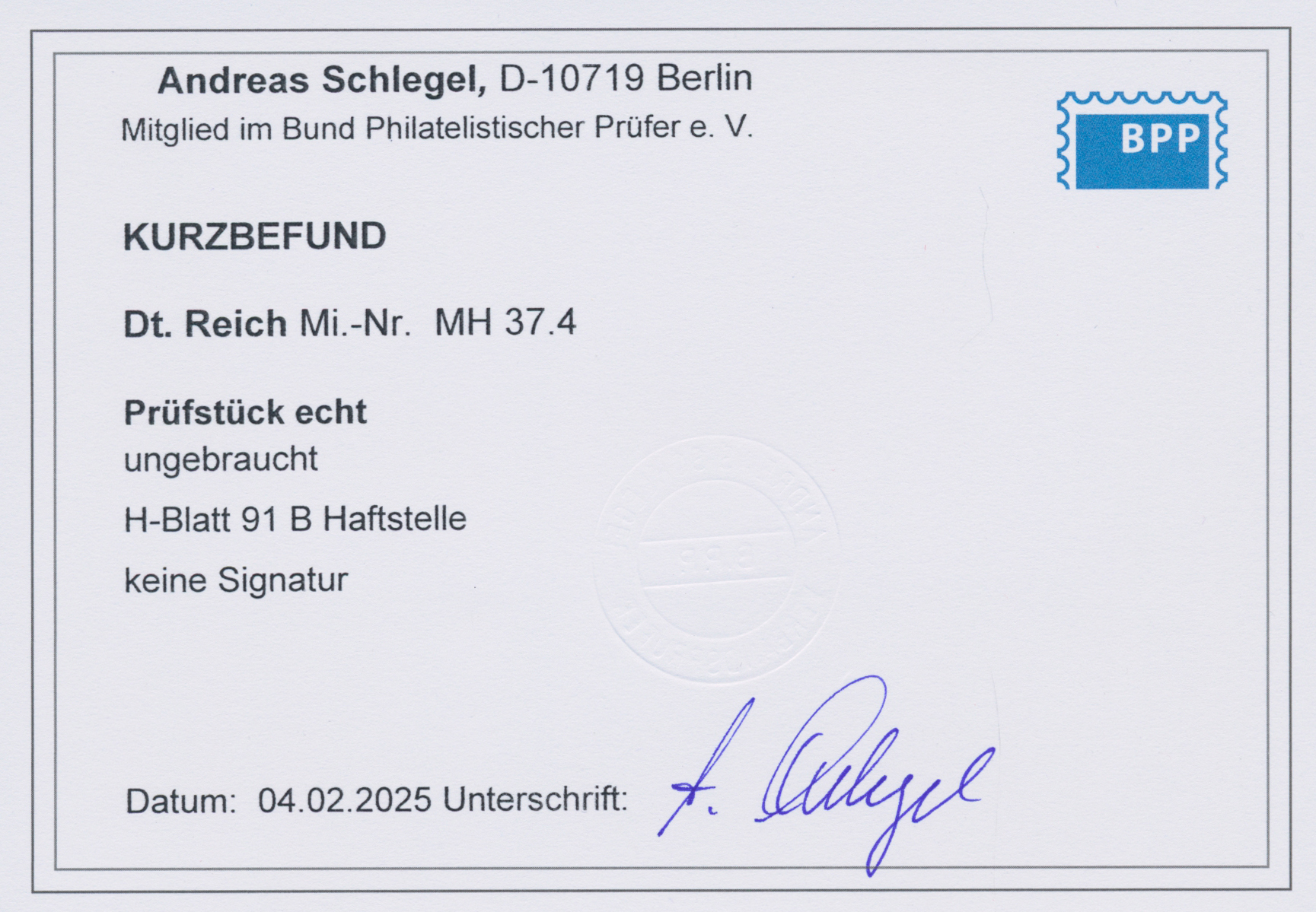 Bug, H-Blätter leicht braunfleckig.", MH 37.3 Kurzbefund "postfrisch, Deckelrückseite Bug, rückseitig herstellungsbedingter Klammerabdruck, typische Zähnung." und MH 37.4 Kurzbefund "ungebraucht, H-Blatt 91 B Haftstelle."