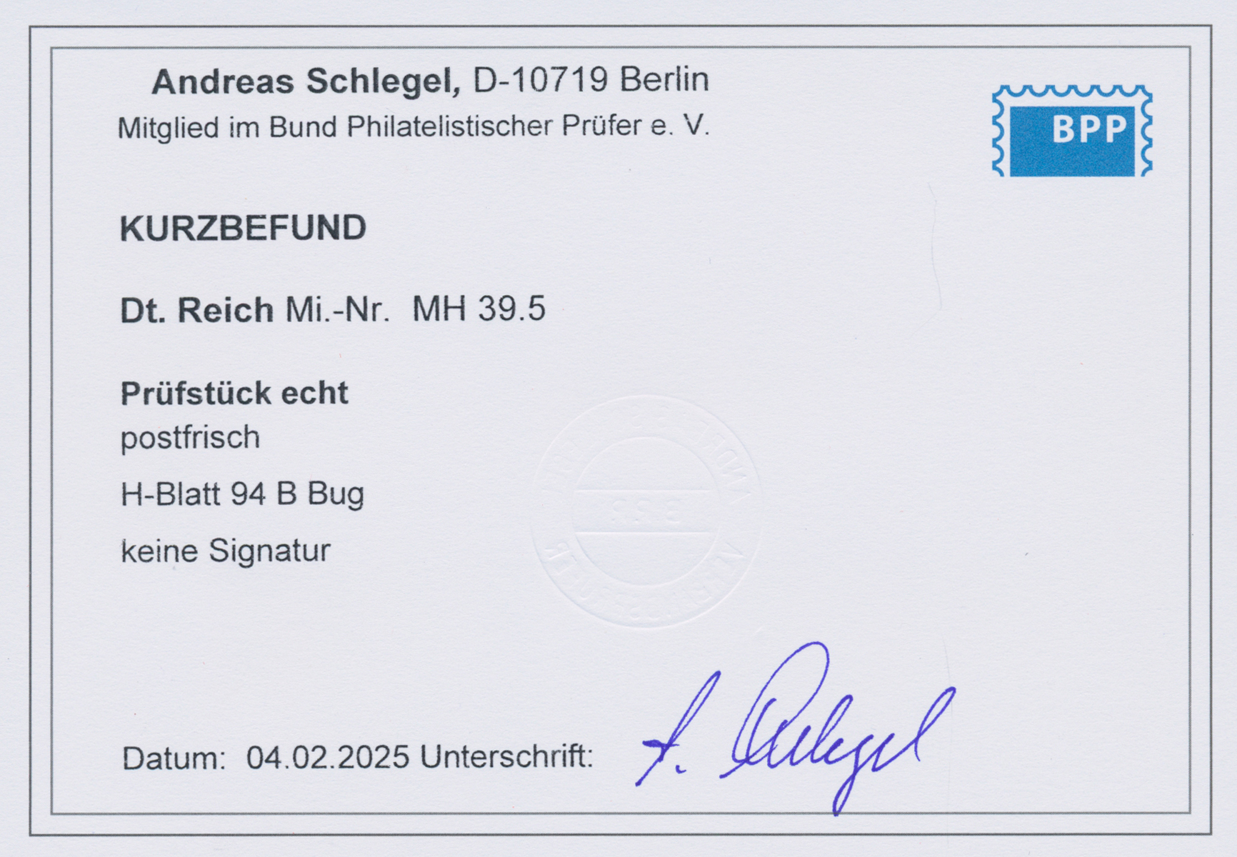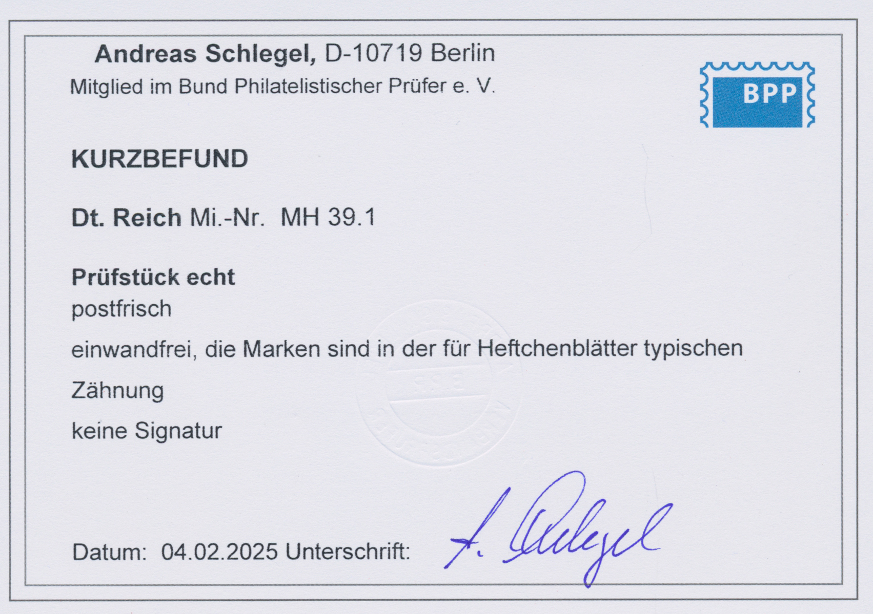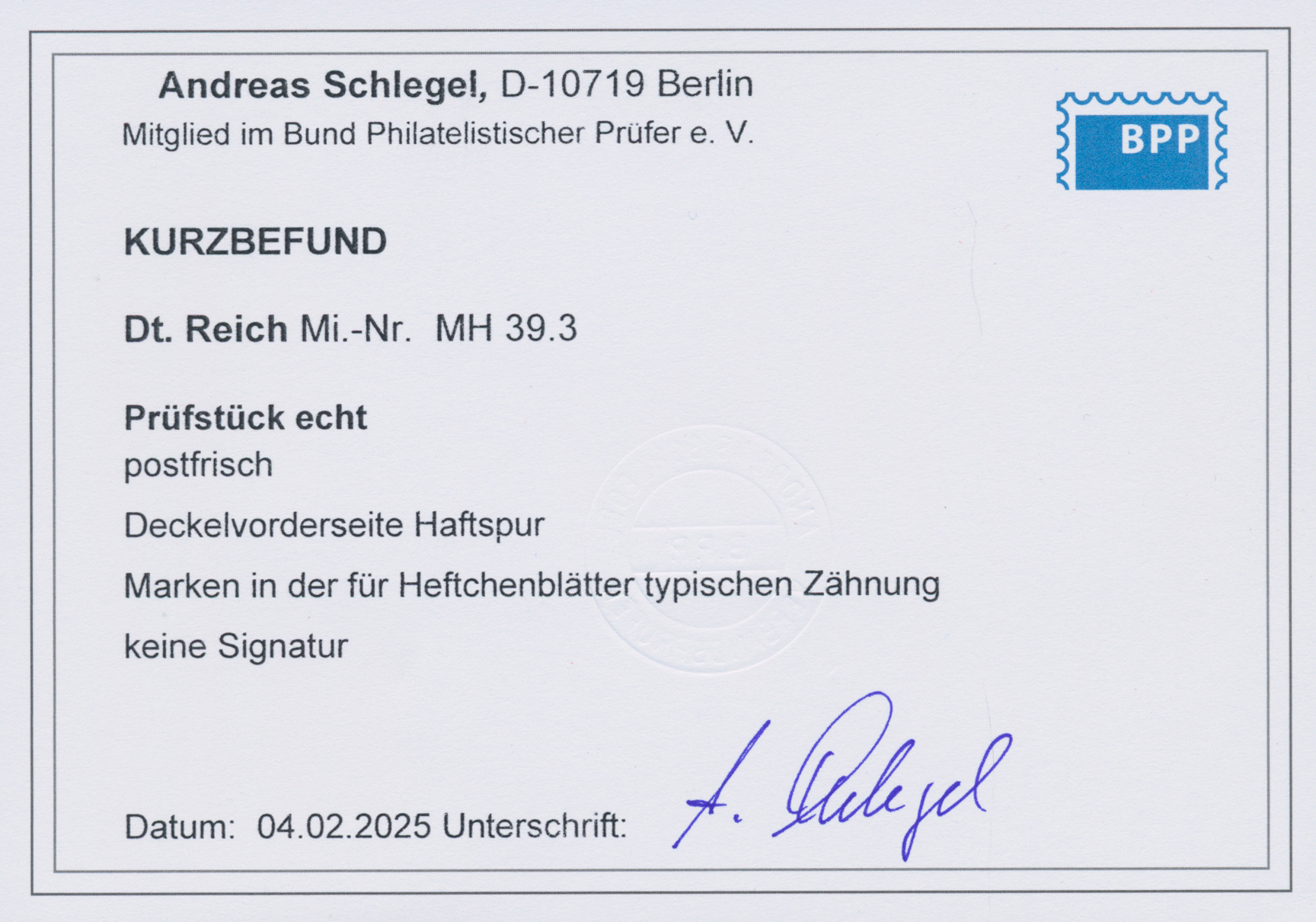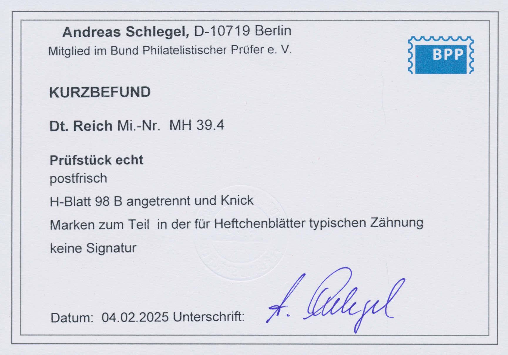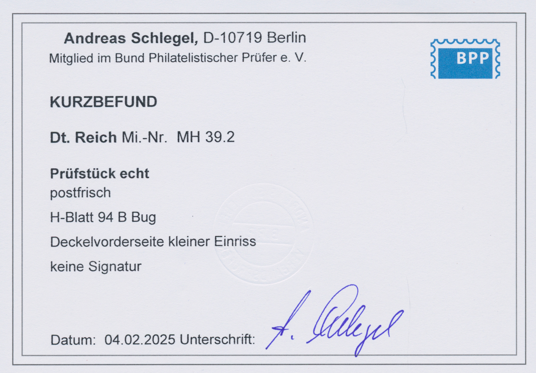 Zähnung.", MH 39.2 "echt, postfrisch, H-Blatt 94 B Bug, Deckelvorderseite kleiner Einriss.", MH 39.3 "echt, postfrisch, Deckelvorderseite Haftspur, typische Zähnung.", MH 39.4 "echt, postfrisch, H-Blatt 98 B angetrennt und Knick, typische Zähnung."